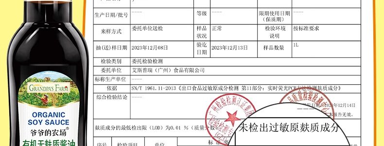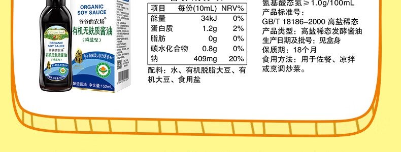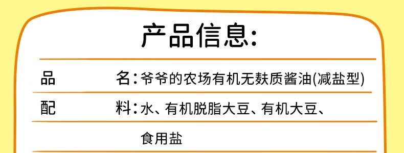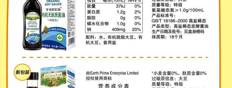 商品名称:爷爷的农场(GRANDPA'S FARM)有机无麸质酱油(减盐型)152ml