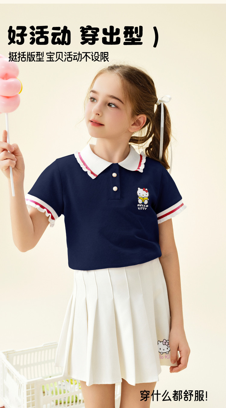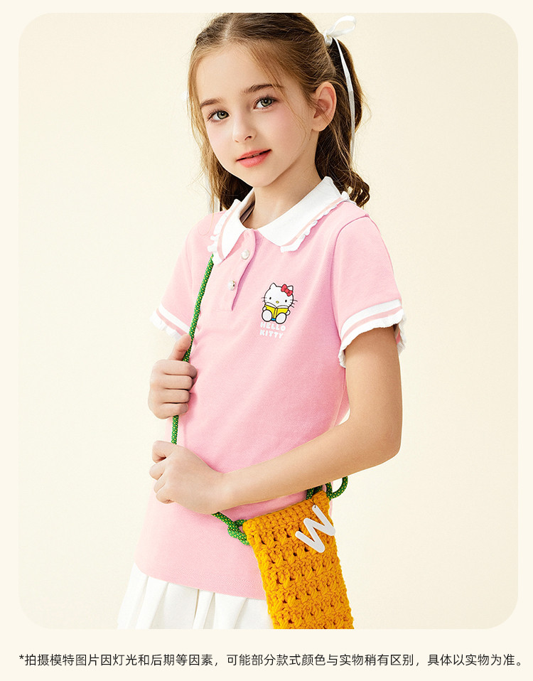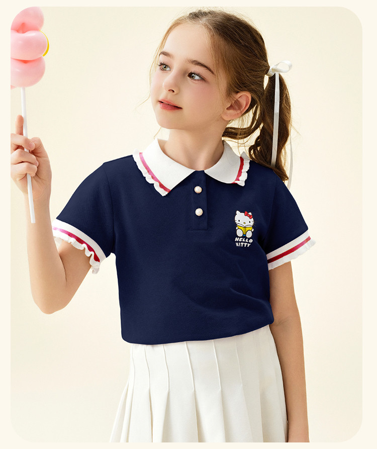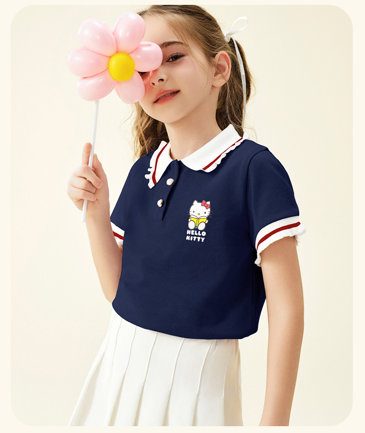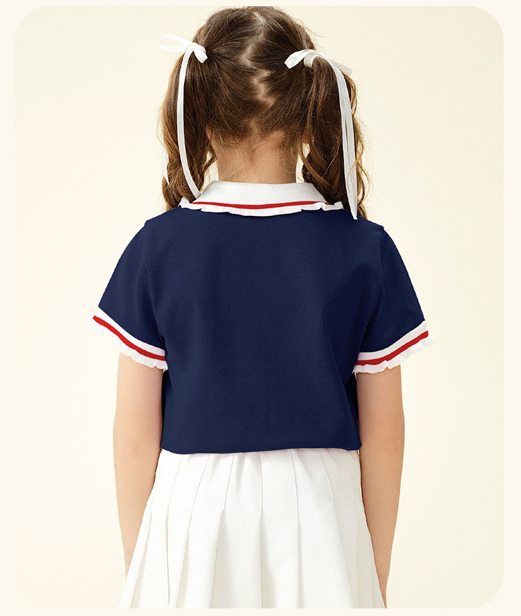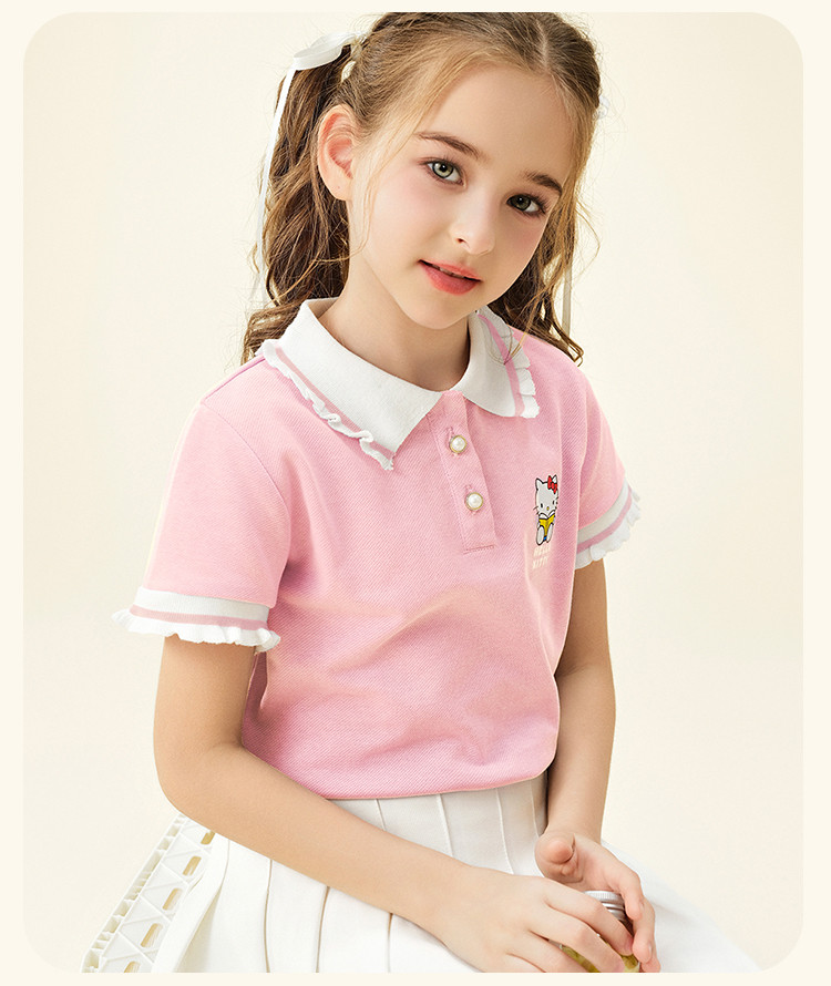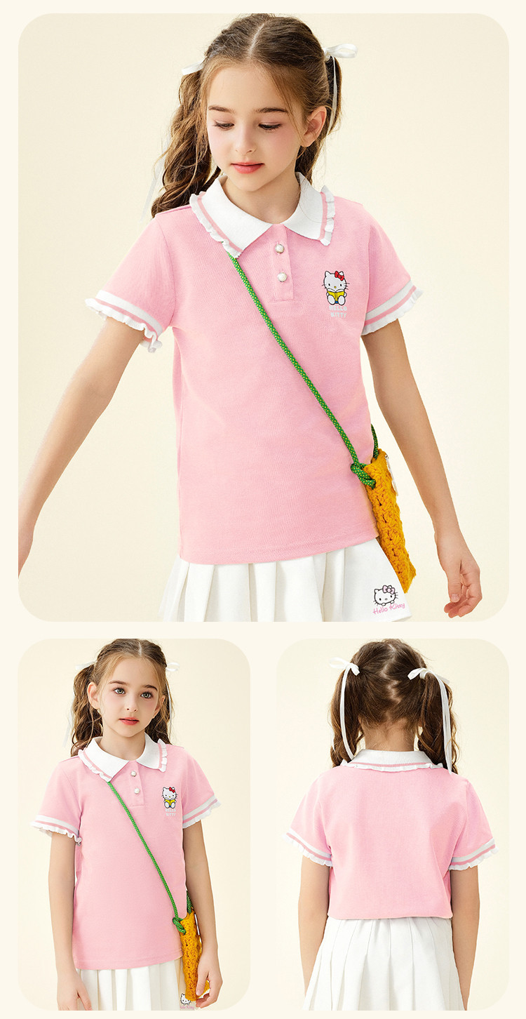 商品名称:女童夏季短袖T恤2025款木耳卷边袖口polo领卡通亲子上衣 613470