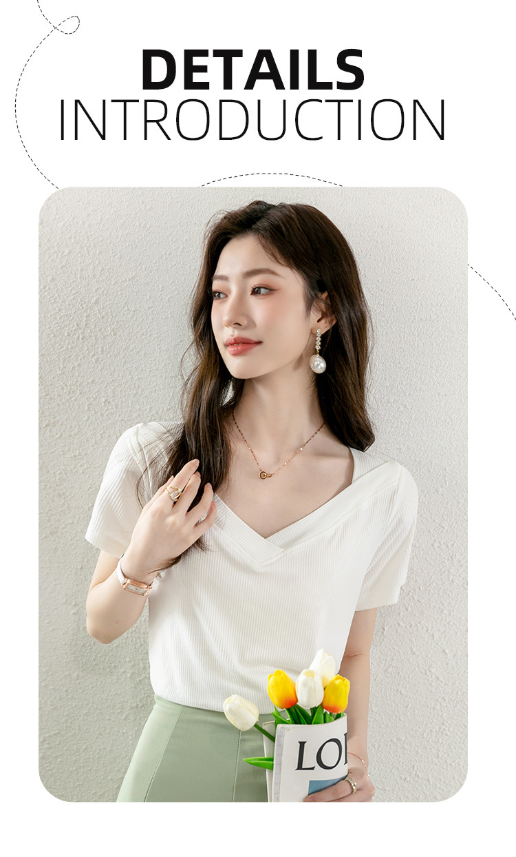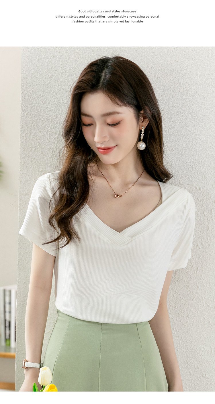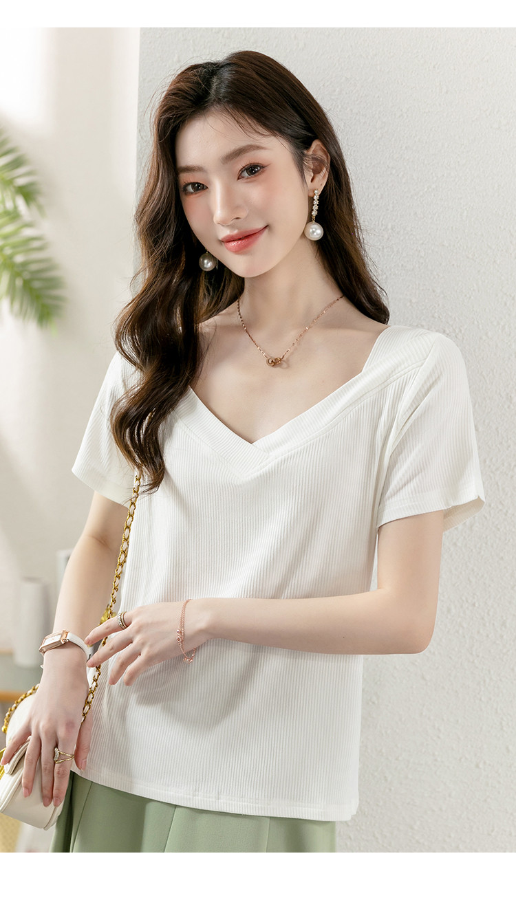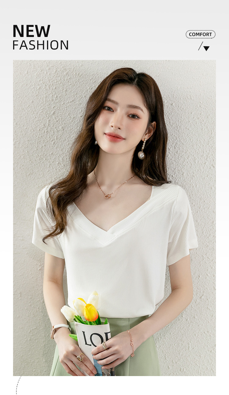 商品名称:短袖女夏季潮流时尚V领百搭纯色显瘦气质舒适休闲上衣t恤女 719384
