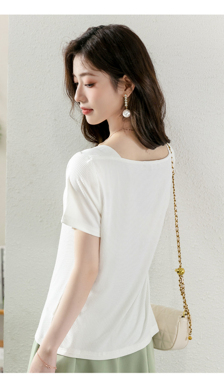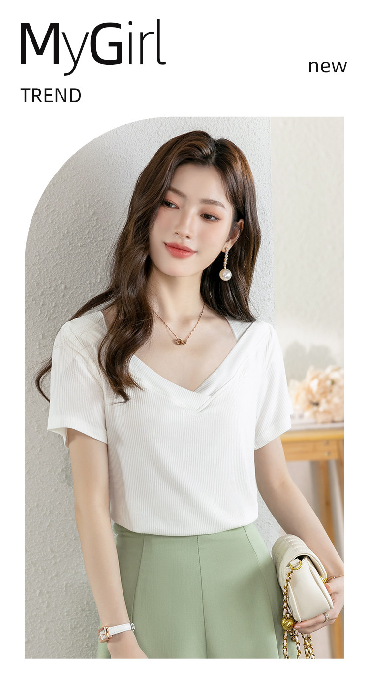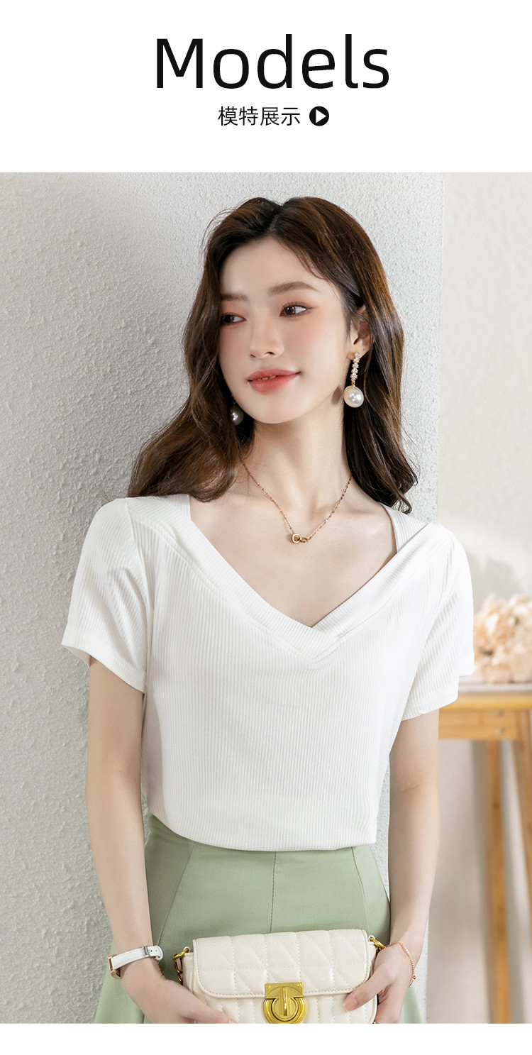 夏季休闲上衣个性时尚百搭女款V领纯色舒适弹力短款短袖T恤女 817176