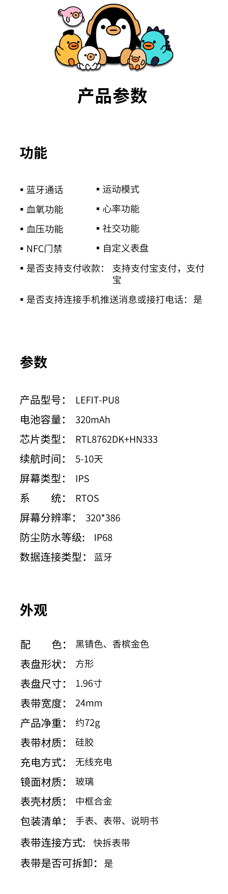 商品名称:LEFIT勒菲特噗噗星人联名款PU8支付型智能蓝牙手表运动手表
