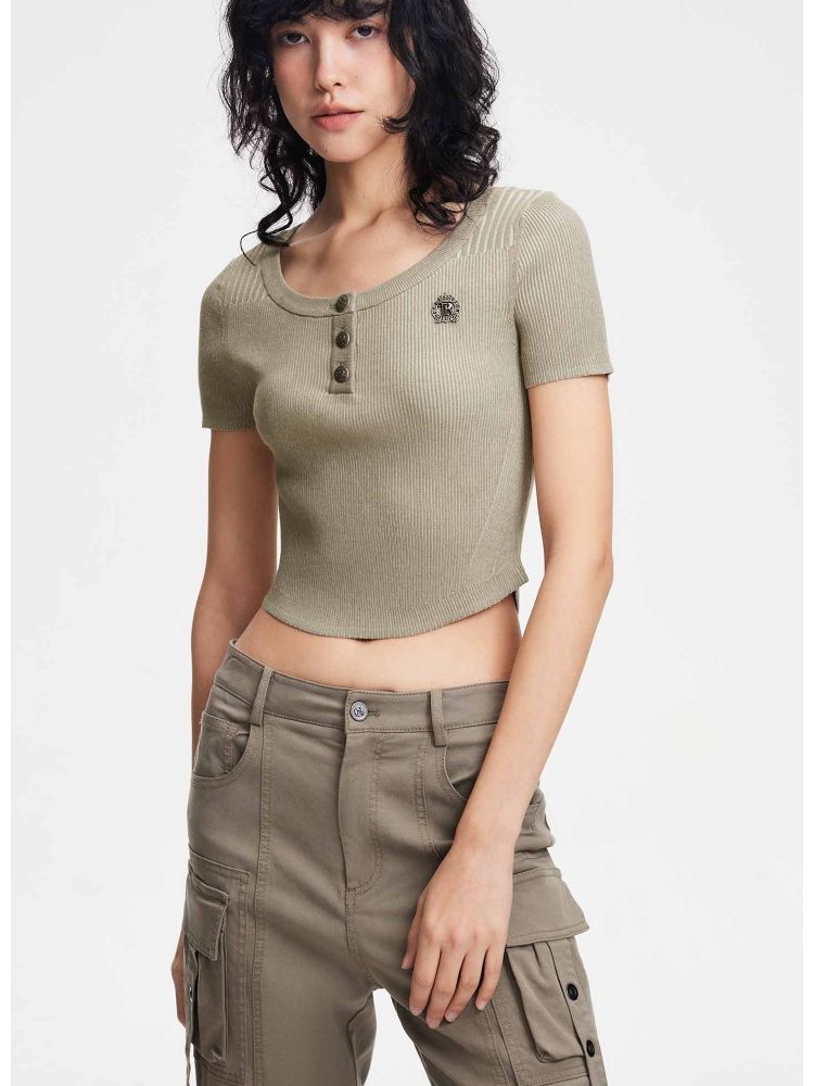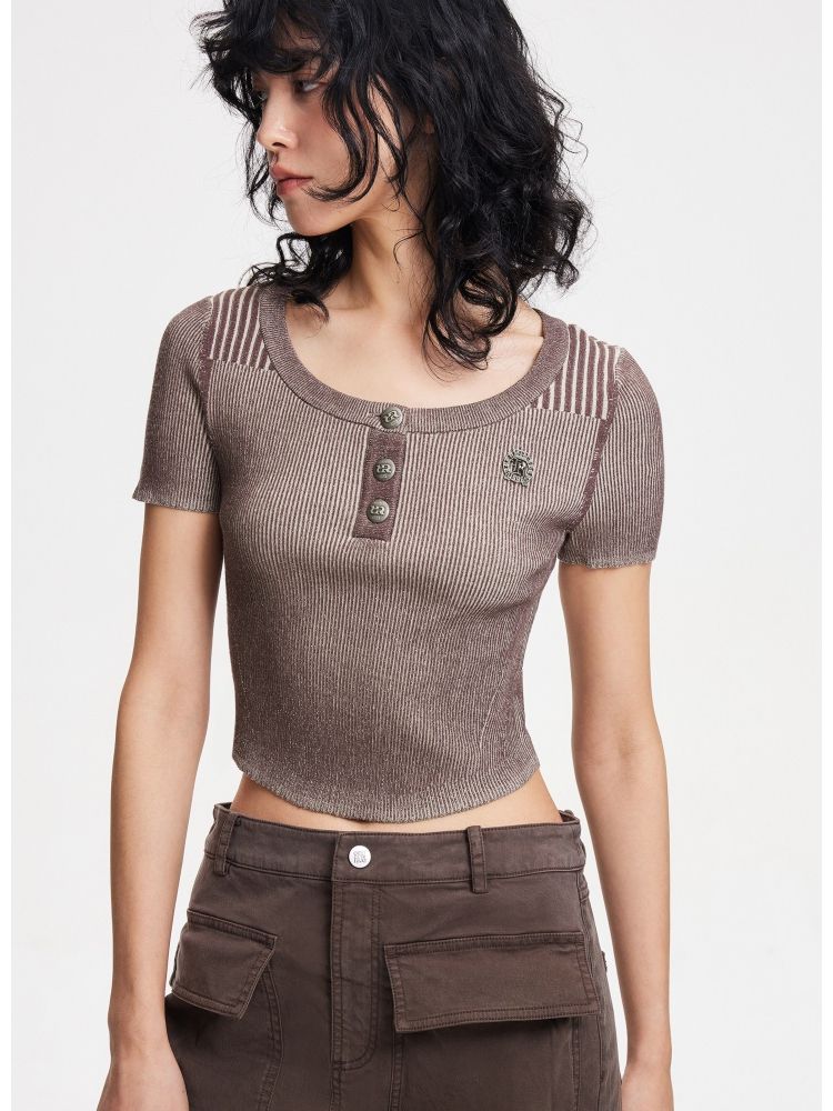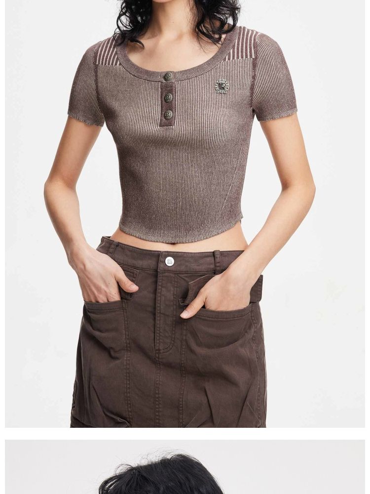 【做旧工艺】春季修身圆领短款短袖针织衫女 461594
