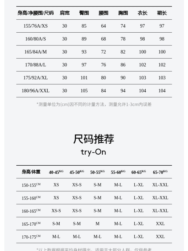 | 尺码 | 裙长(cm) | 肩宽(cm) | 腰围(cm) | 臀围(cm) | 袖长(cm) | 胸围(cm) | 号型 |