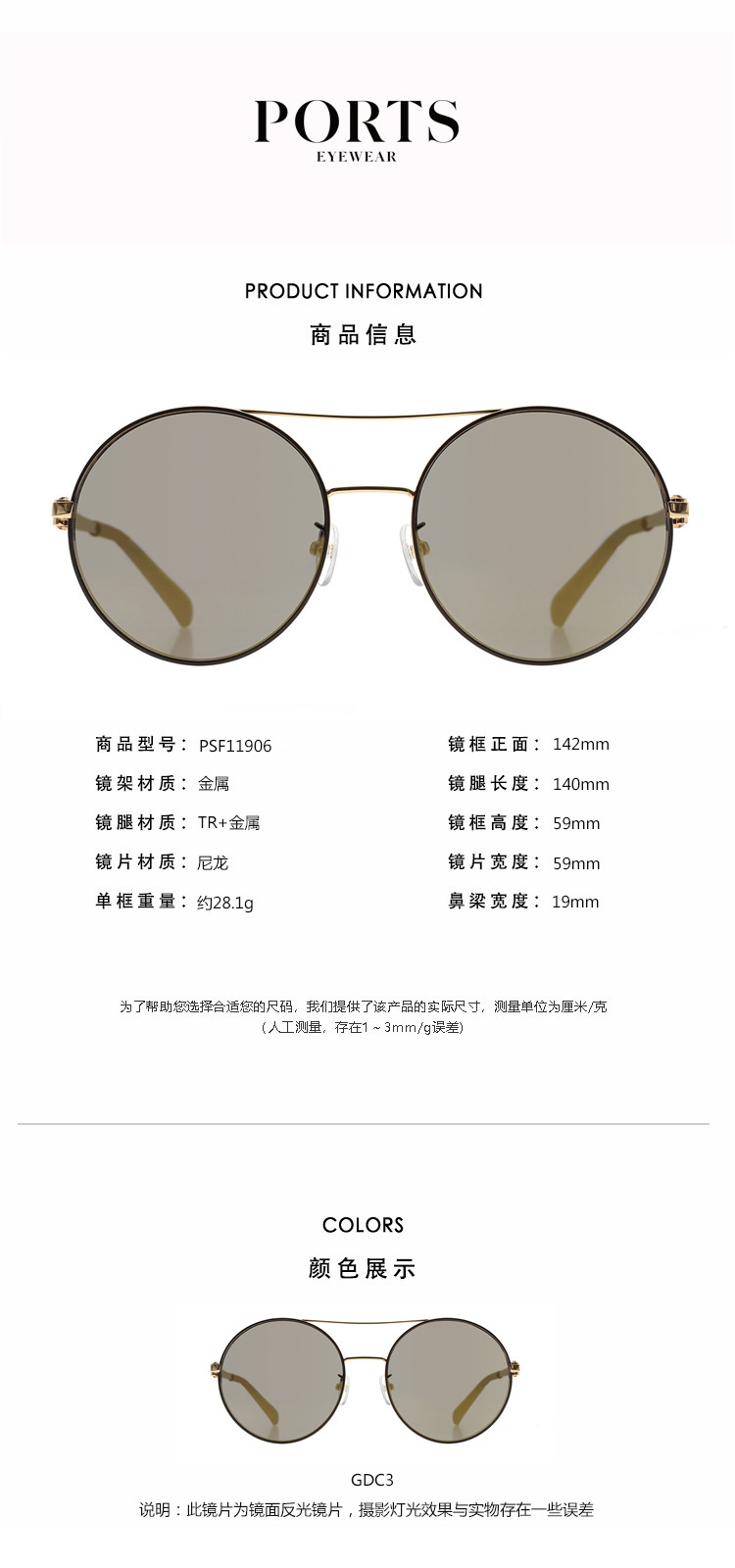 商品名称:PORTS休闲女款复古双梁圆框女士太阳镜PSF11906 005002