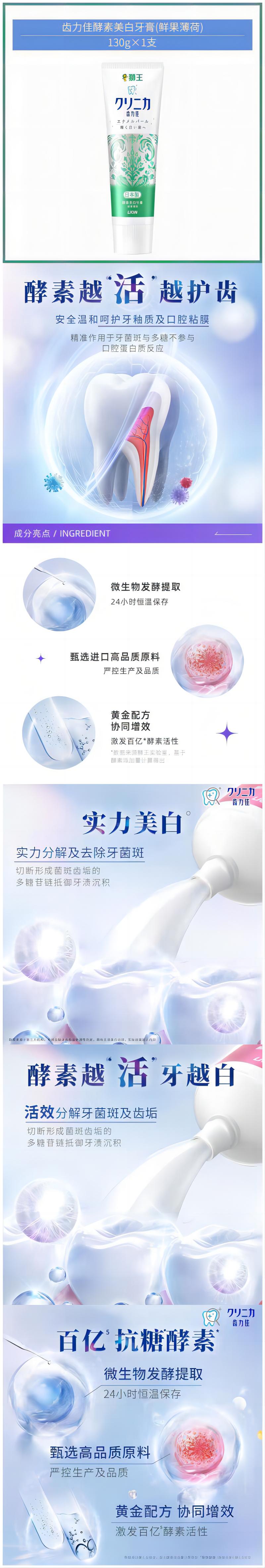 商品名称:狮王齿力佳酵素美白牙膏(鲜果薄荷)130g/支 E03024