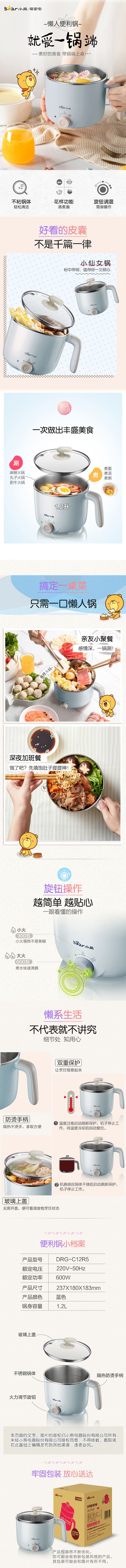 小熊电煮锅DRG-C12R5小电锅电火锅多功能迷你电热锅宿舍锅1.2L【无蒸笼】