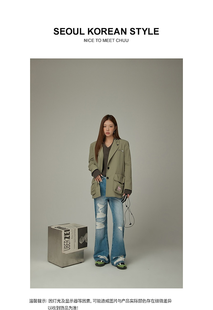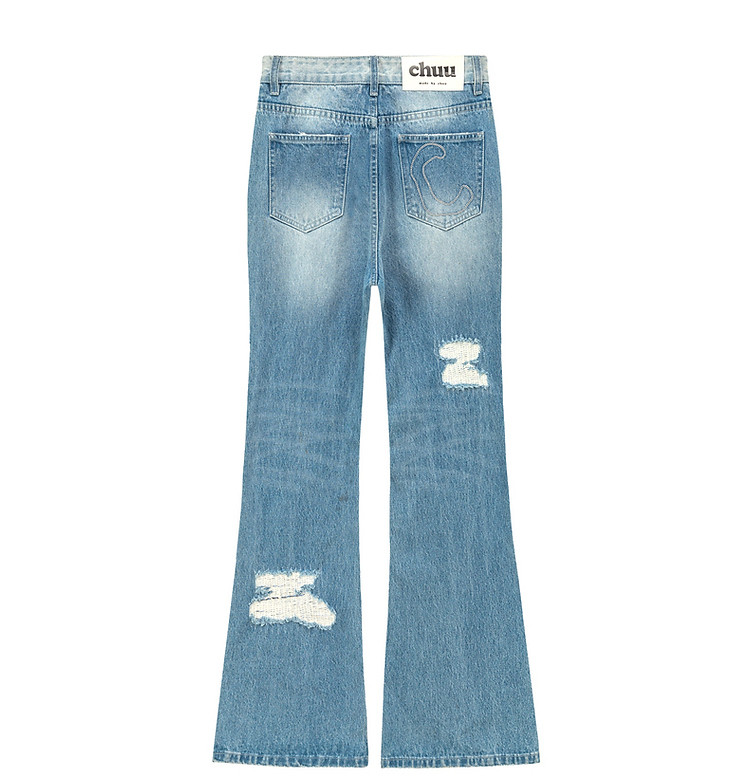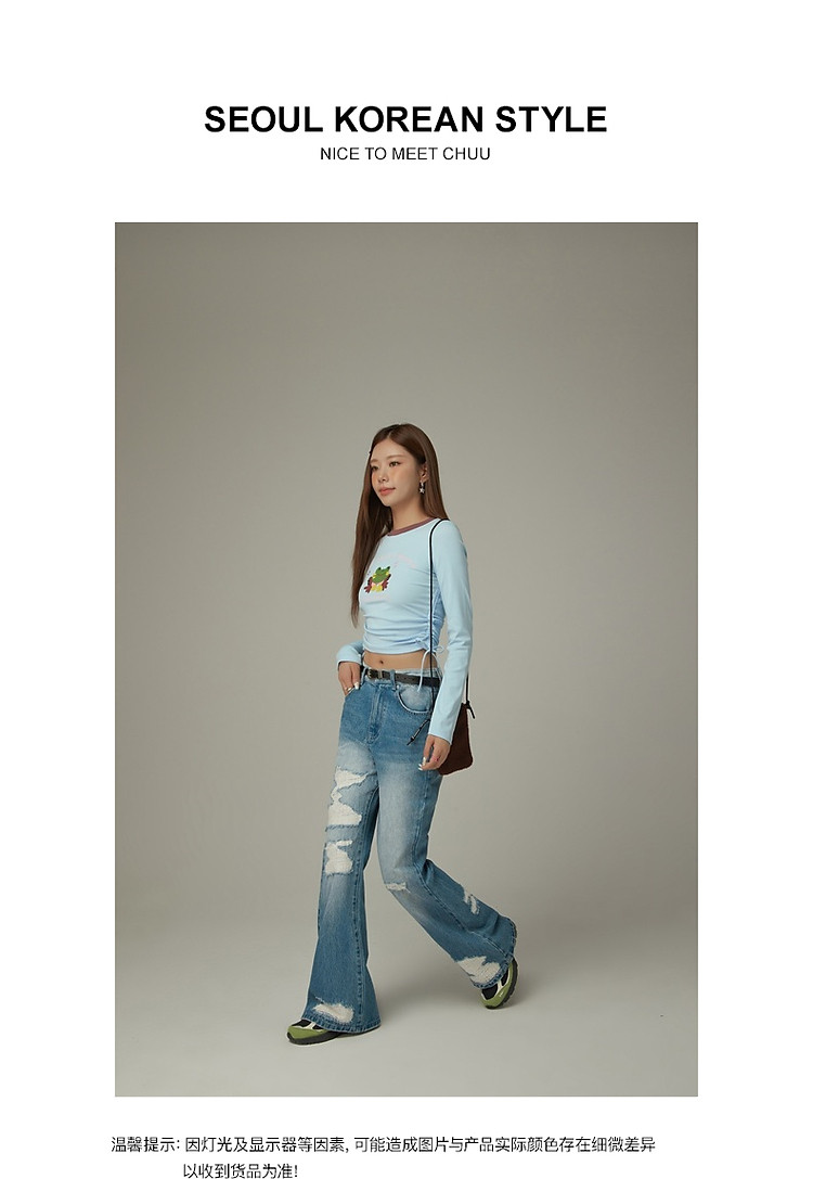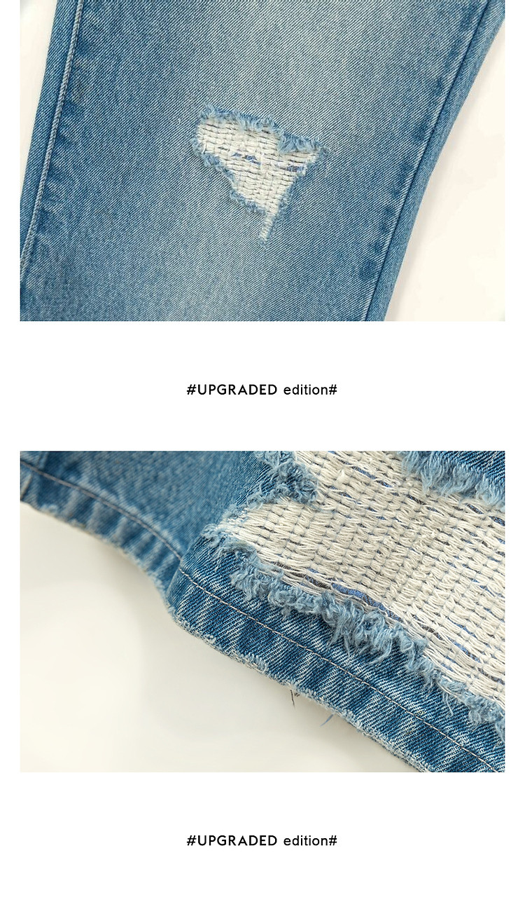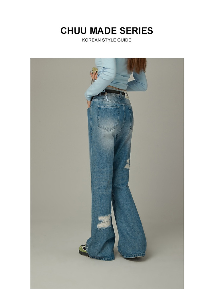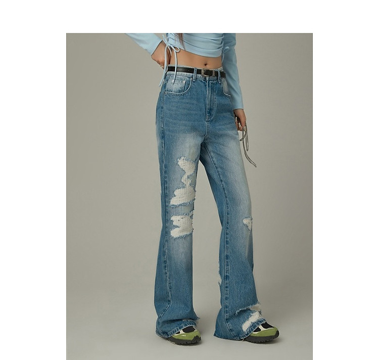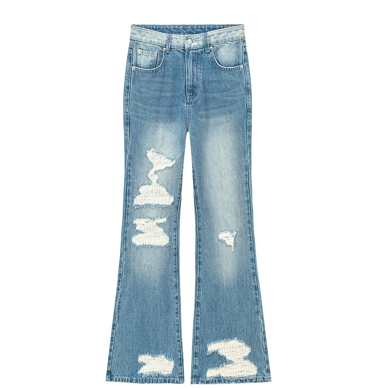 商品名称:磨破微喇牛仔裤女士春秋浅色不规则破洞修身长裤子 611155
