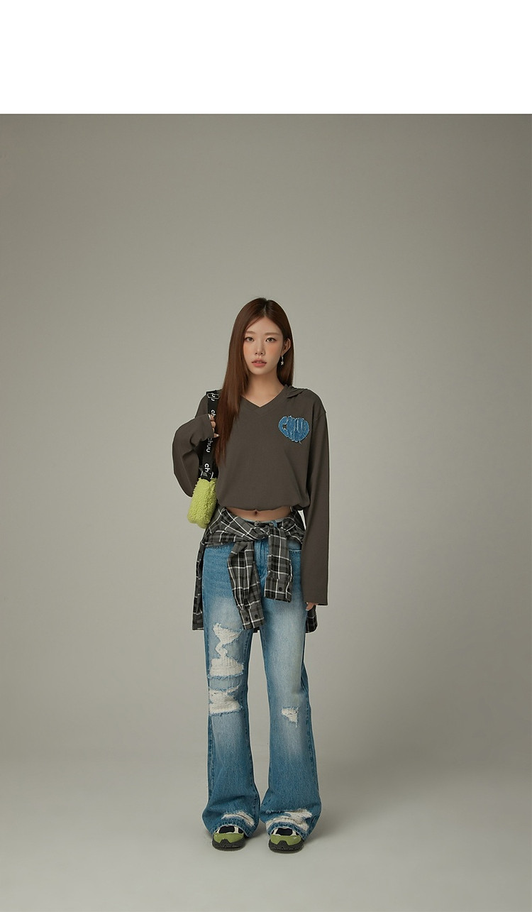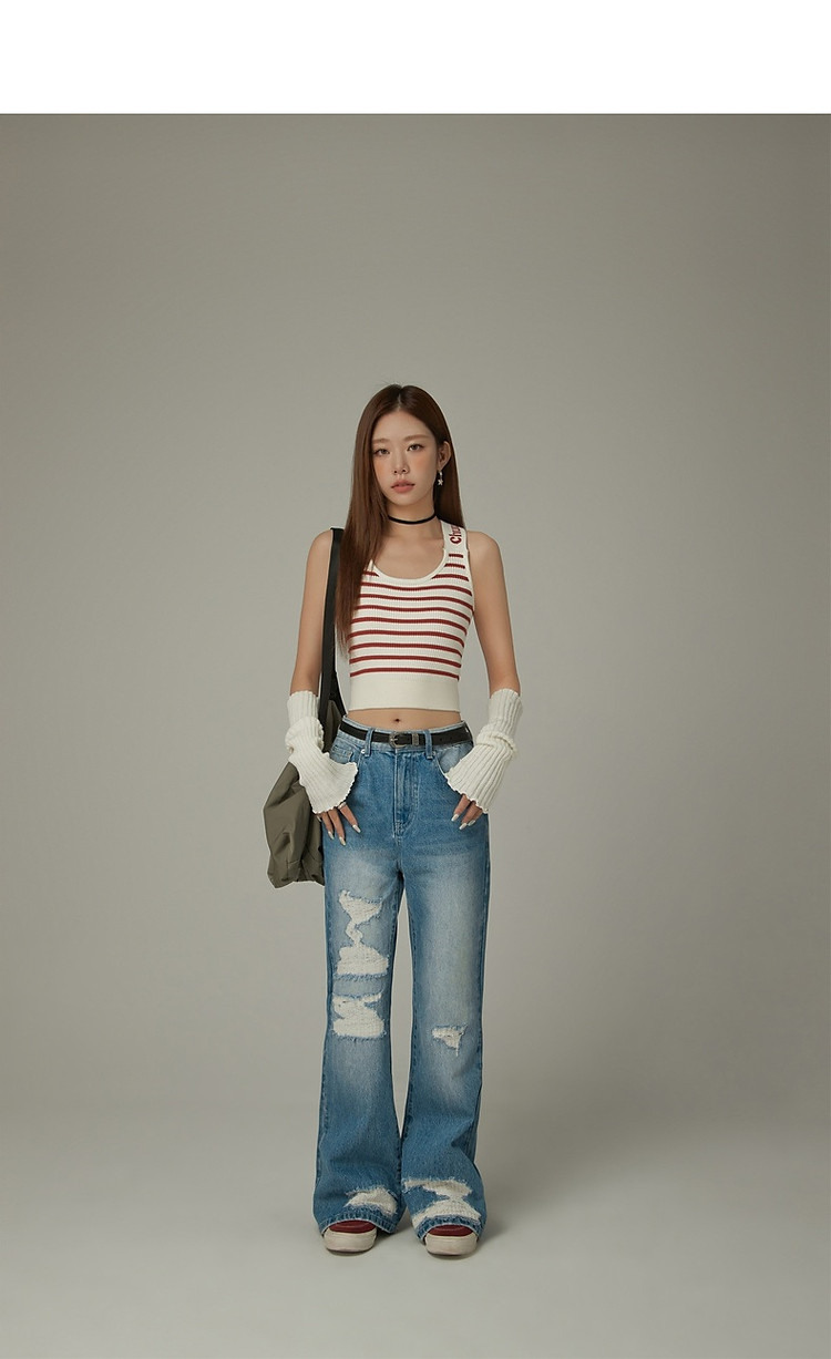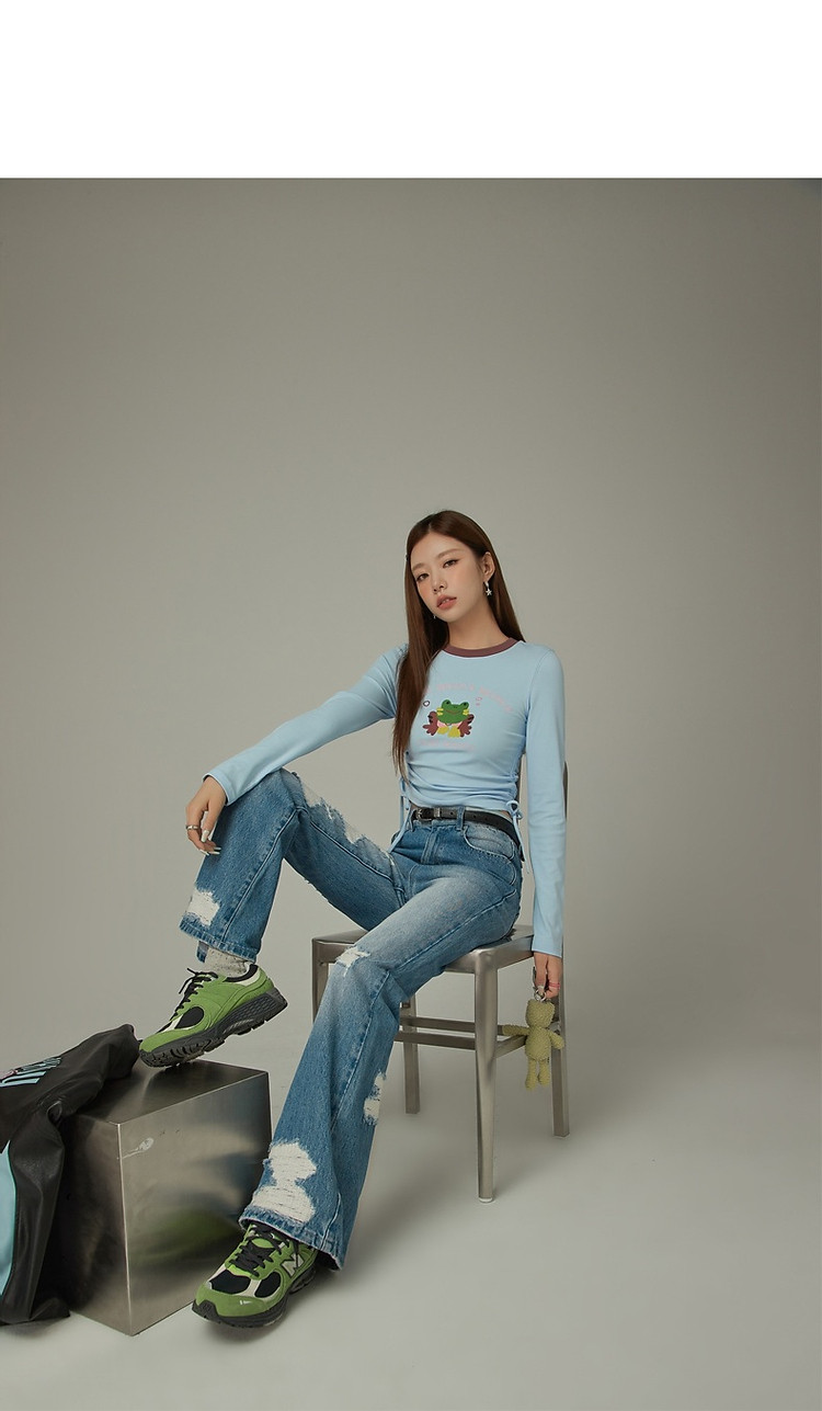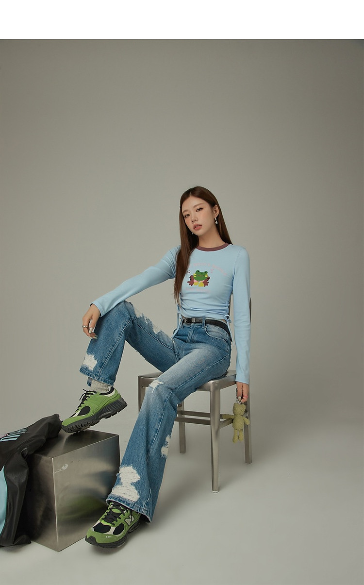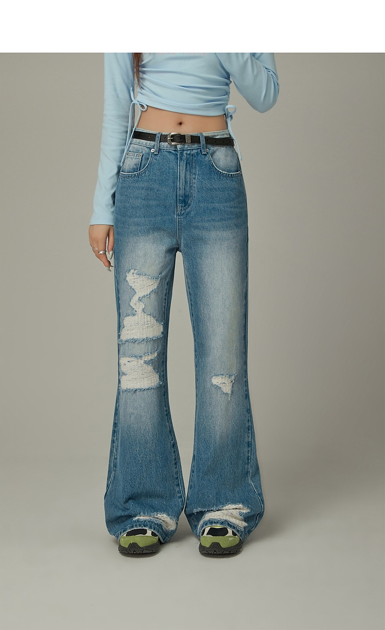 磨破微喇牛仔裤女士春秋浅色不规则破洞修身长裤子 611155