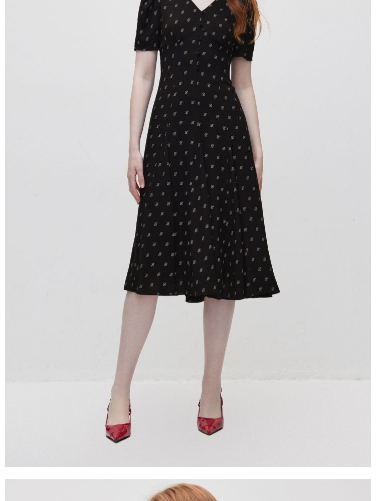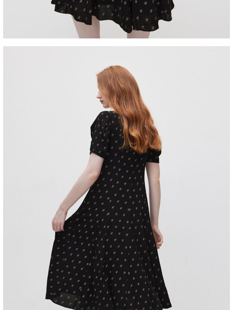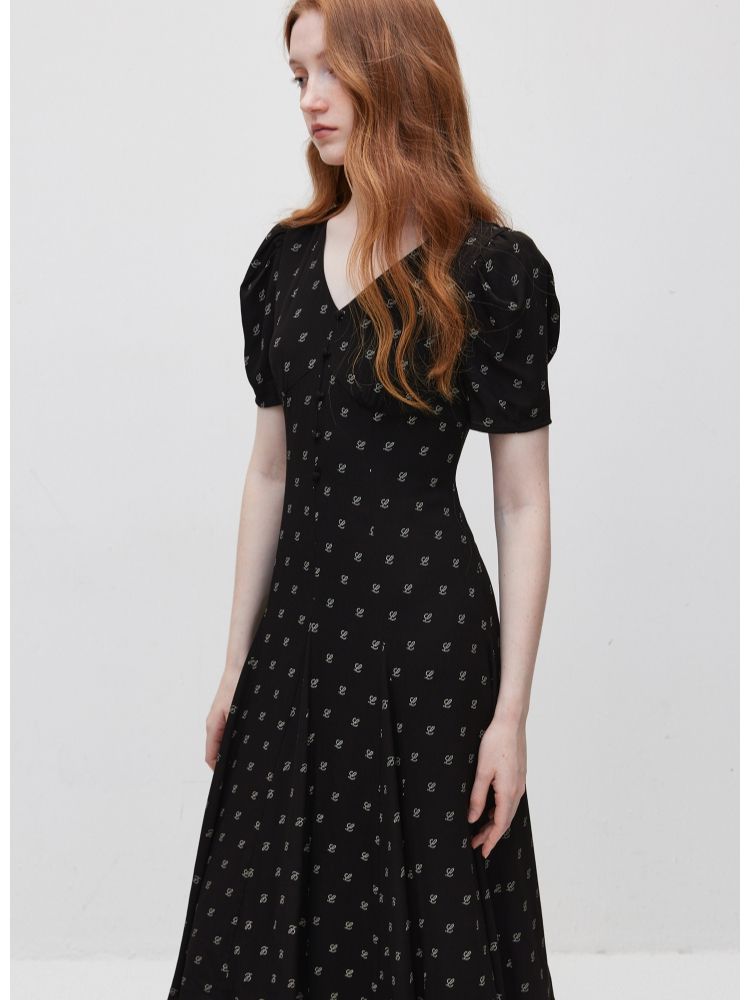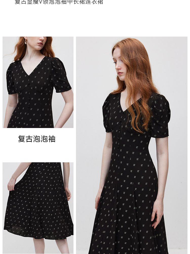 【气质小黑裙】夏季V领泡泡袖中长裙连衣裙女 666266