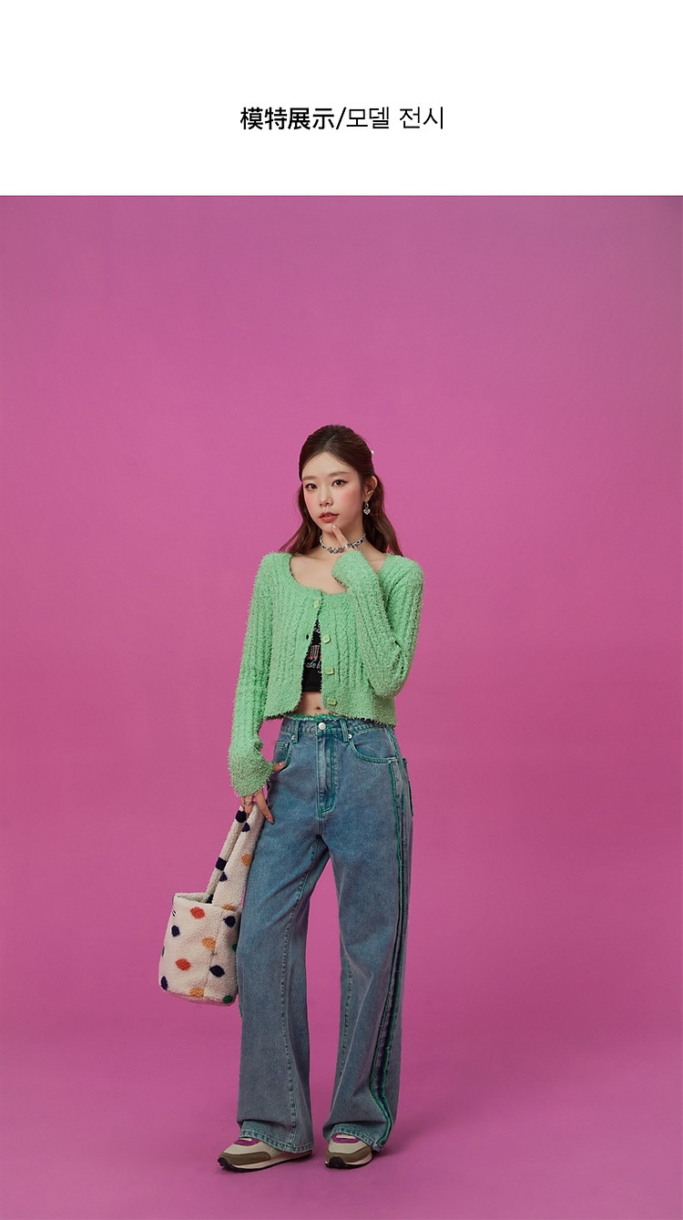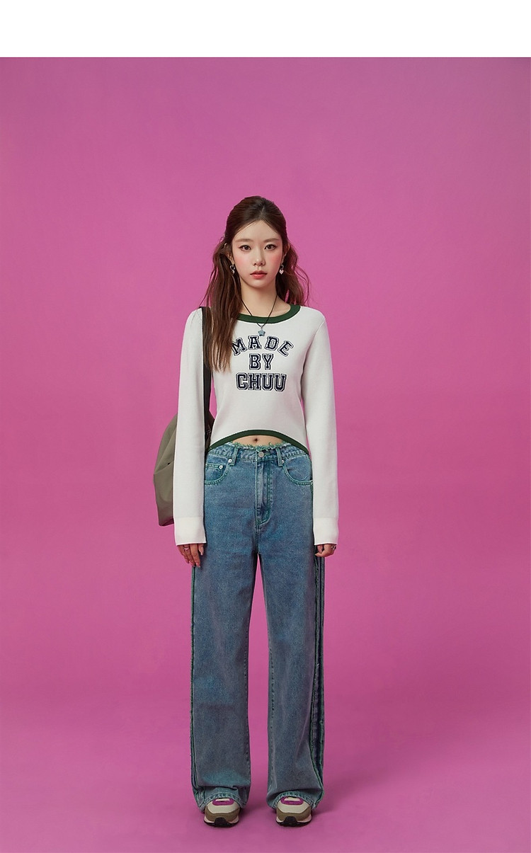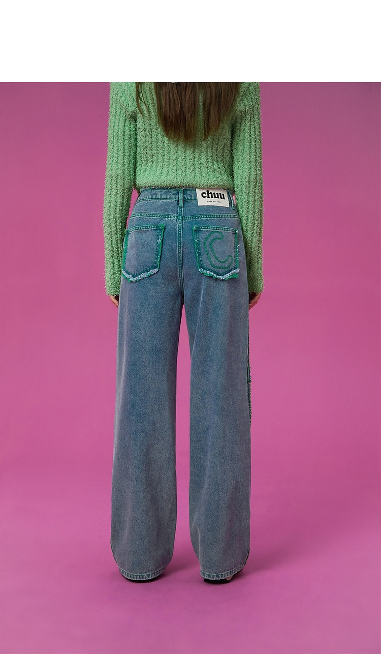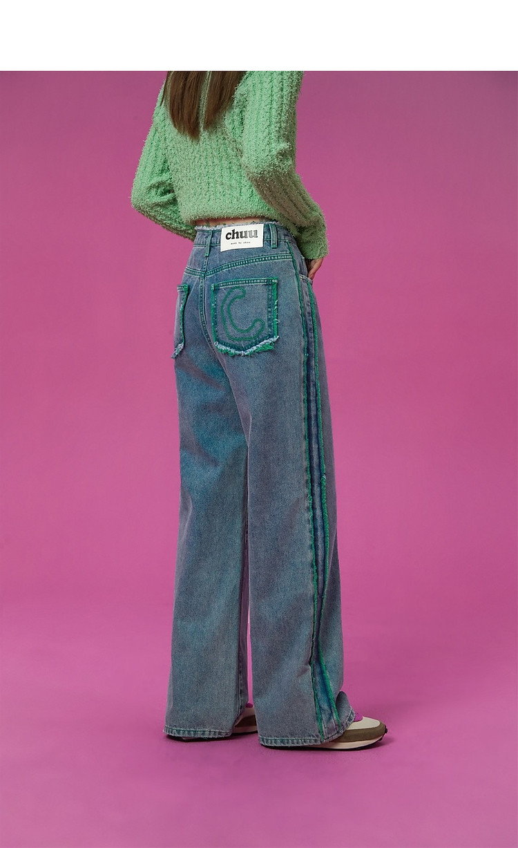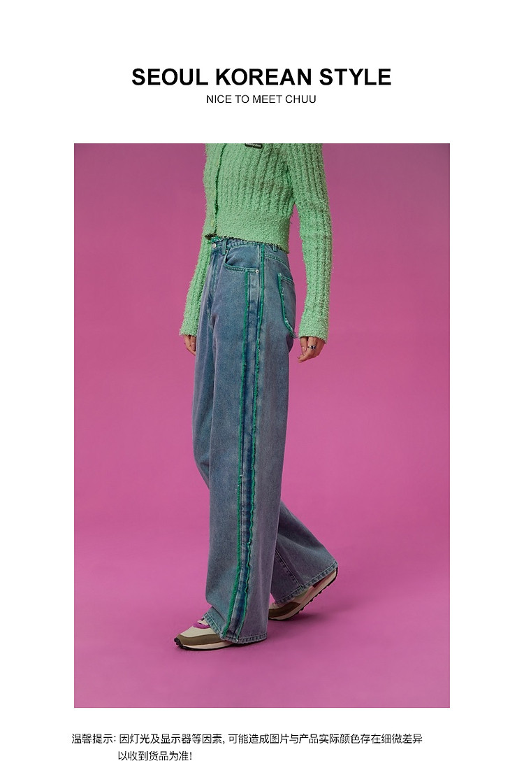 牛仔裤女春秋撞色毛边设计感直筒阔腿长裤子 635731