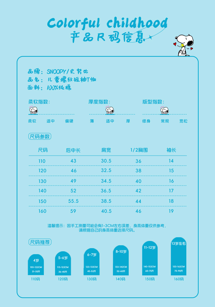 | 尺码 | 衣长(cm) | 肩宽(cm) | 袖长(cm) | 适合年龄 | 胸围(cm) | 号型 |