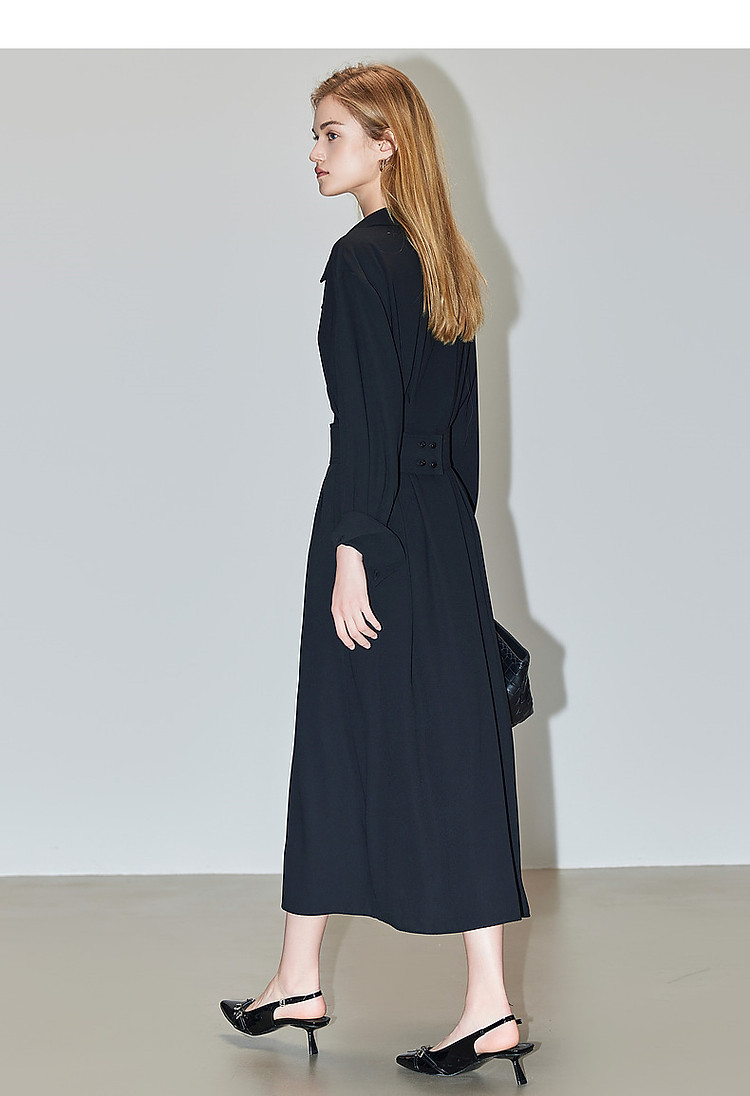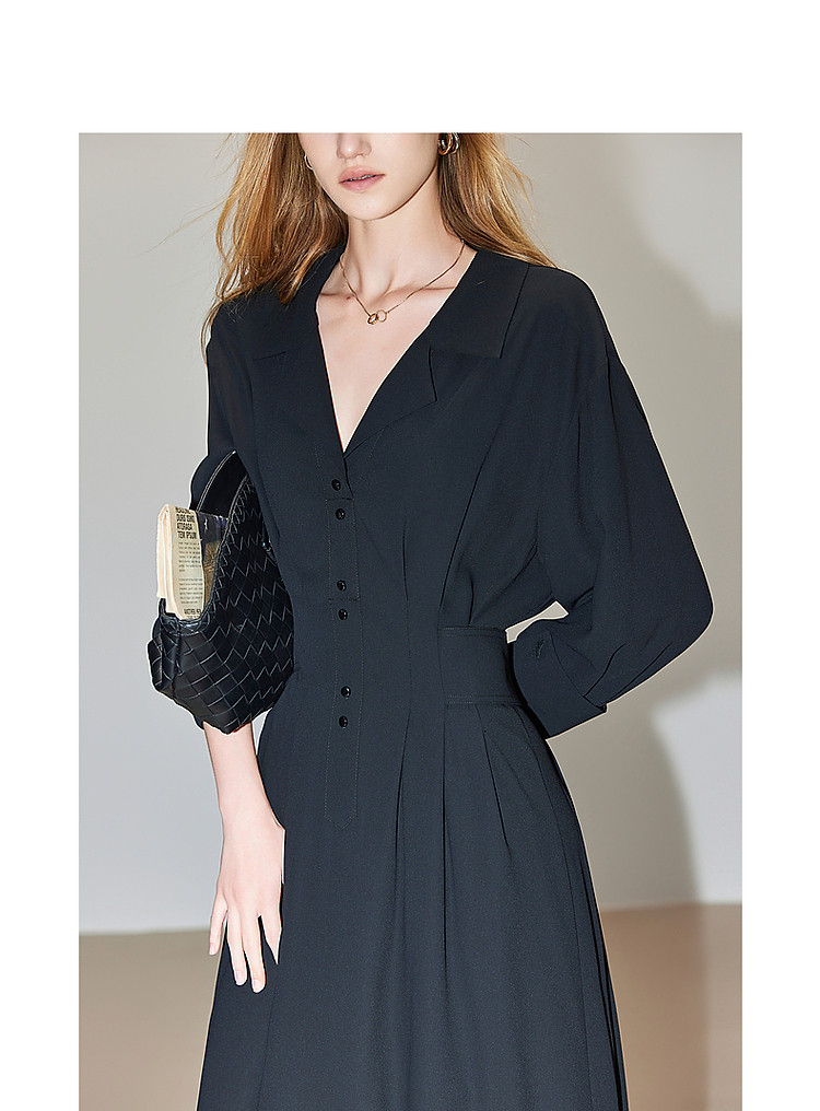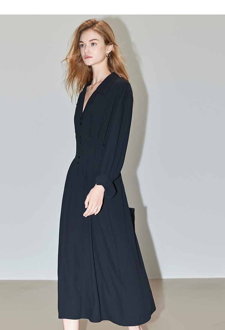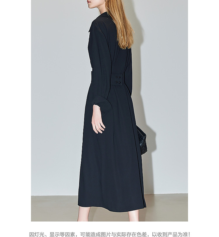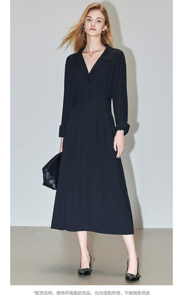 商品名称:【摩登恋曲】春秋简约法式垂顺乱麻褶裥收腰优雅中长连衣裙女 447425