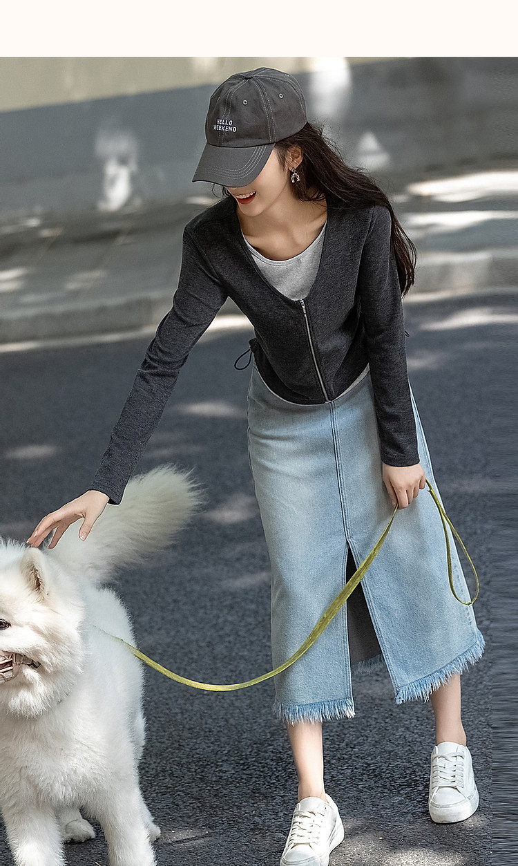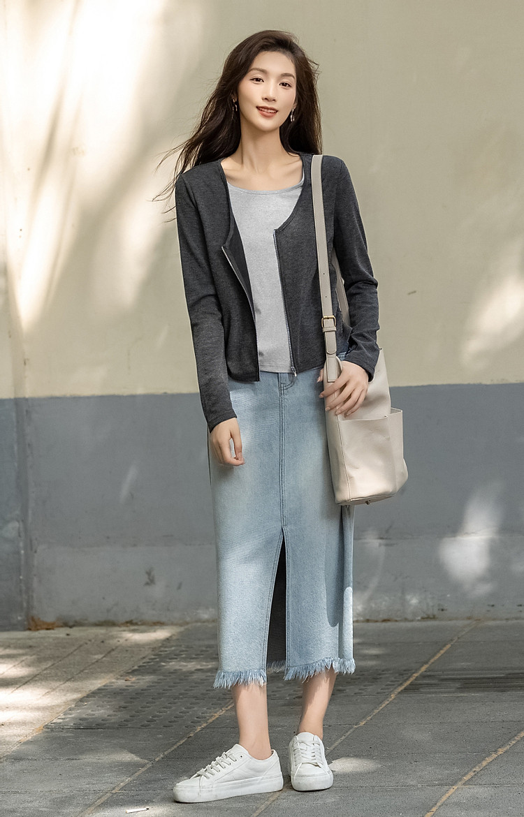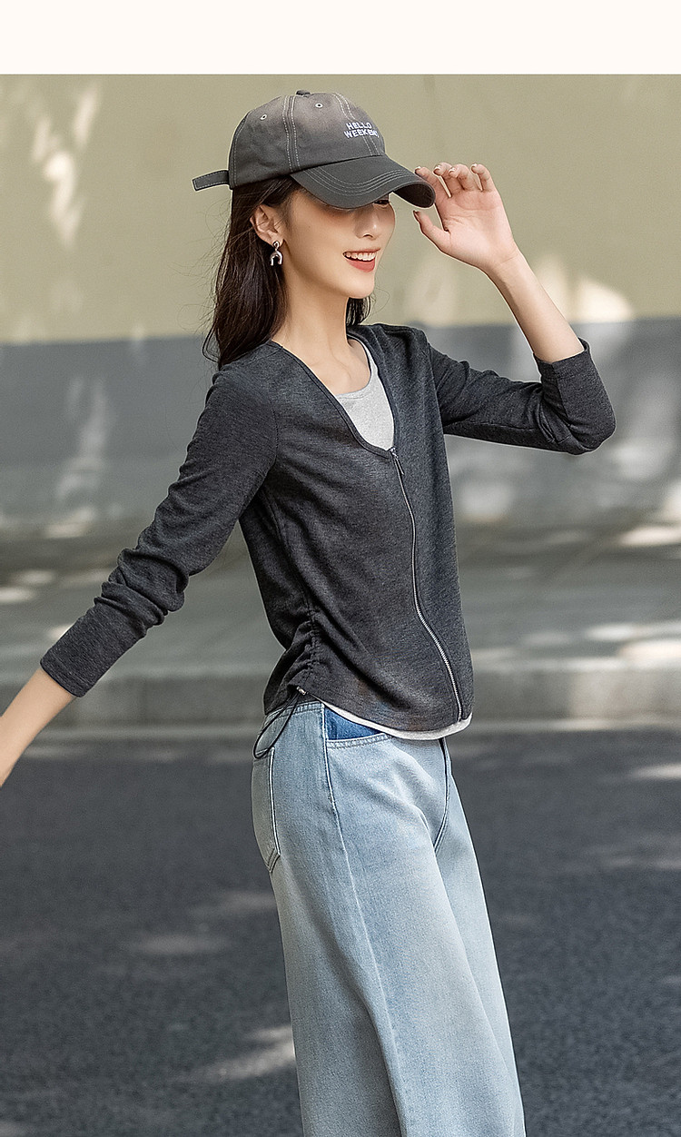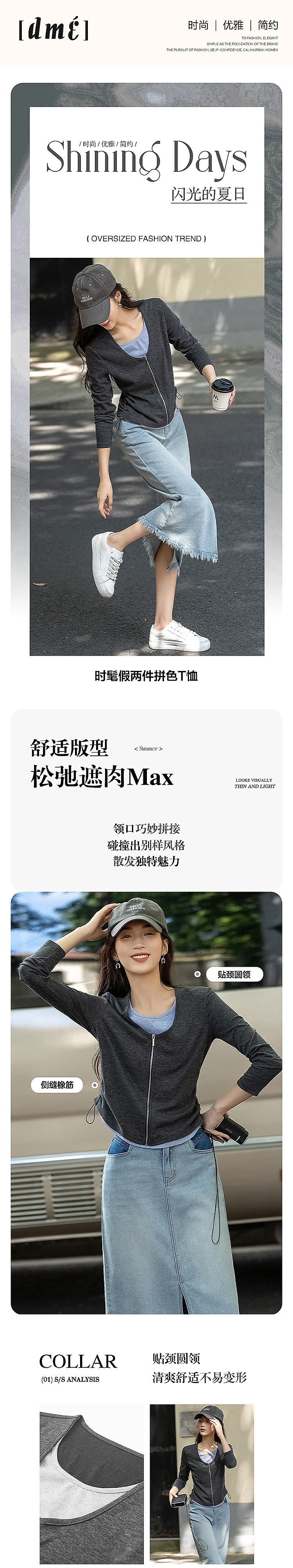 【时髦假两件拼色t恤】秋简约圆领舒适细针罗纹侧缝橡筋女式t恤 014849