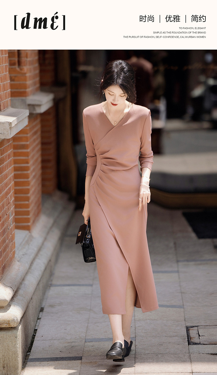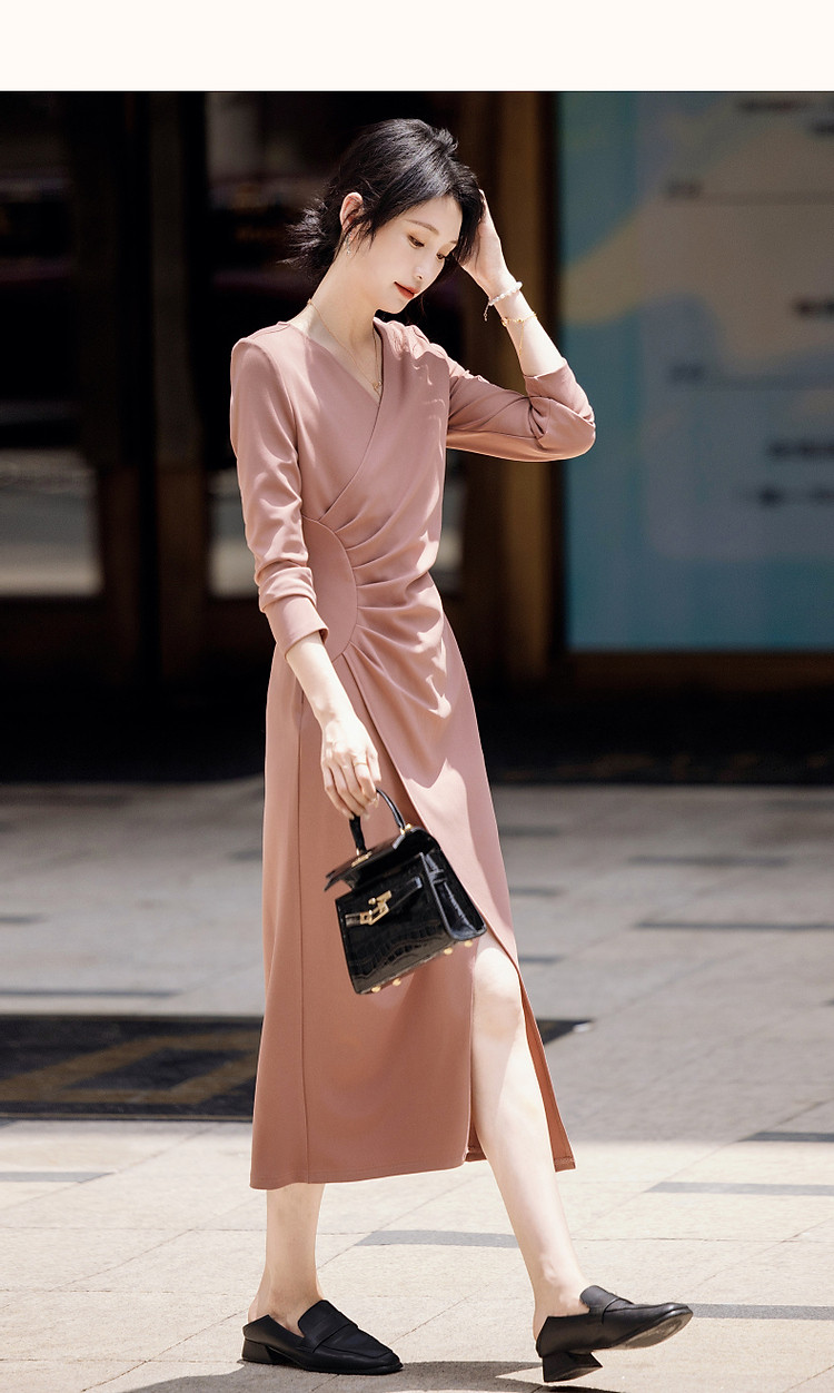 【多巴胺复古美学】秋静奢轻礼服交叉V领裹身收腰开叉衣裙 815233