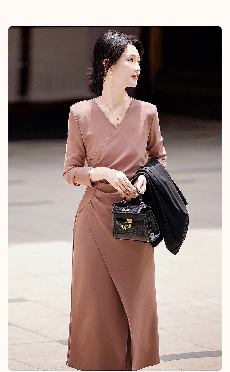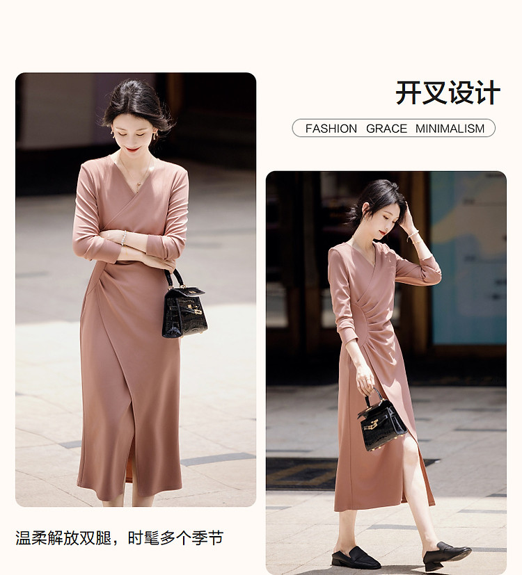 商品名称:【多巴胺复古美学】秋静奢轻礼服交叉V领裹身收腰开叉衣裙 815233
