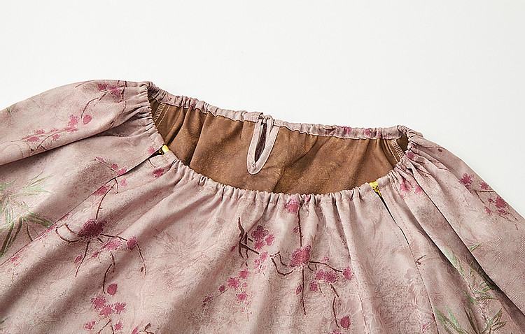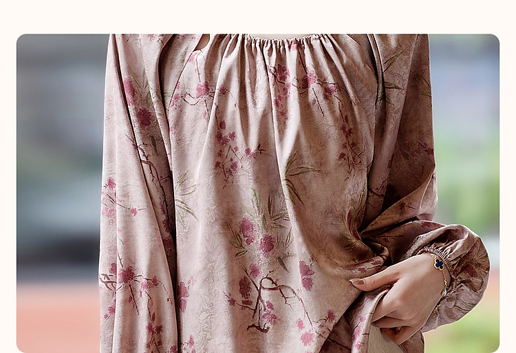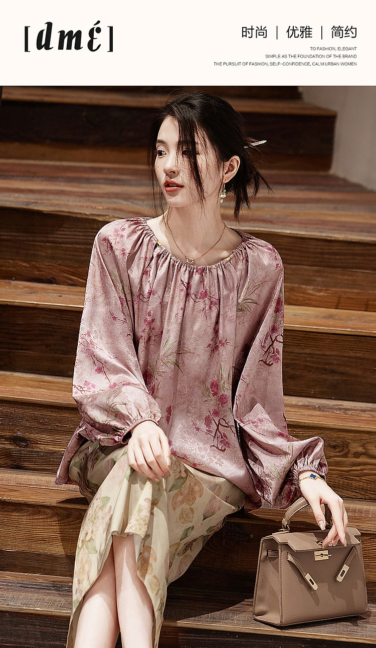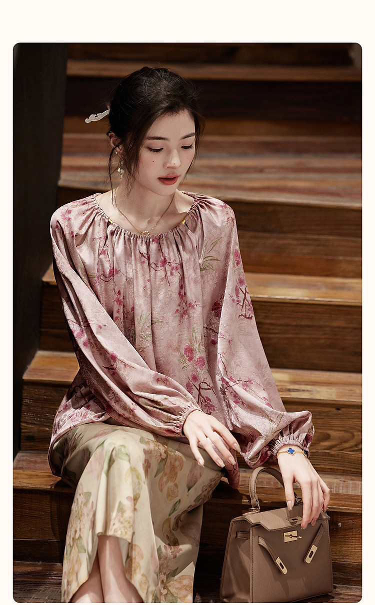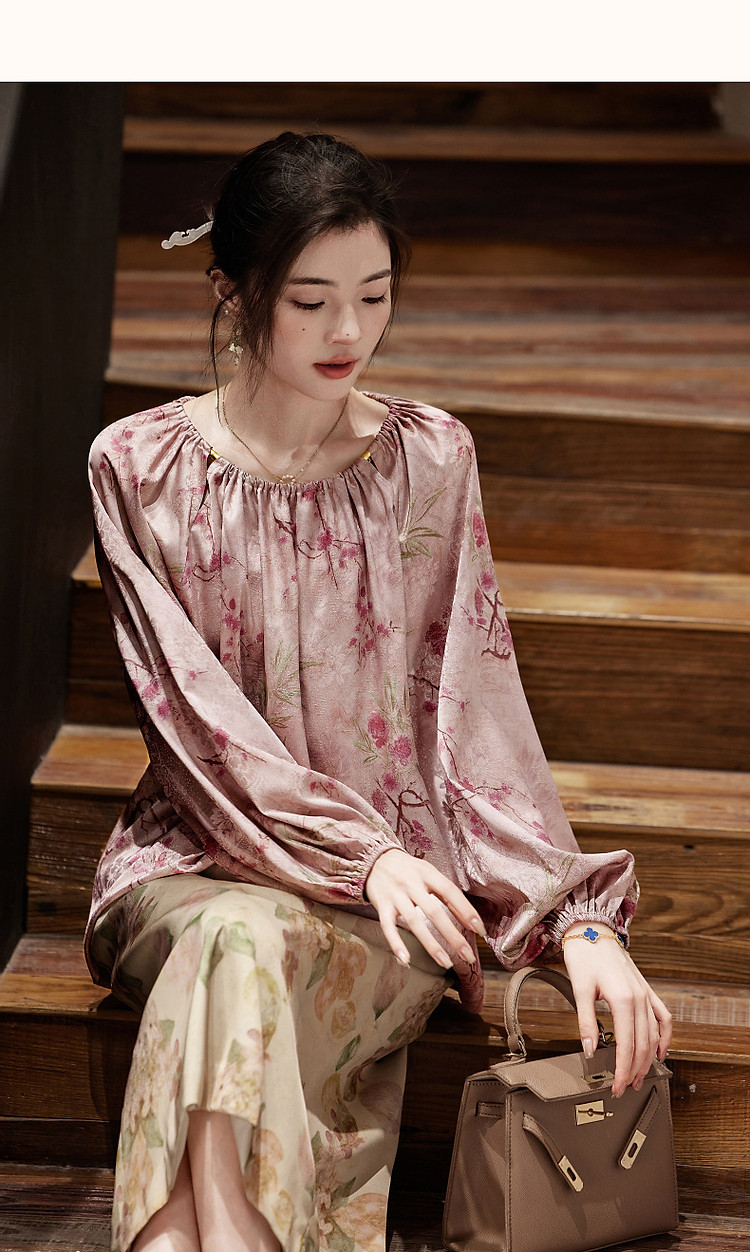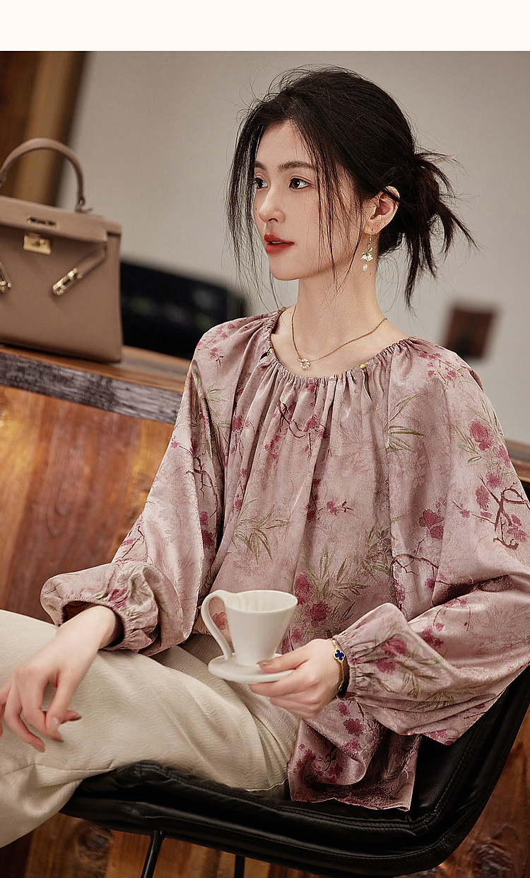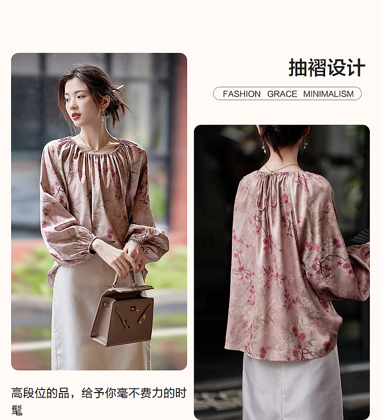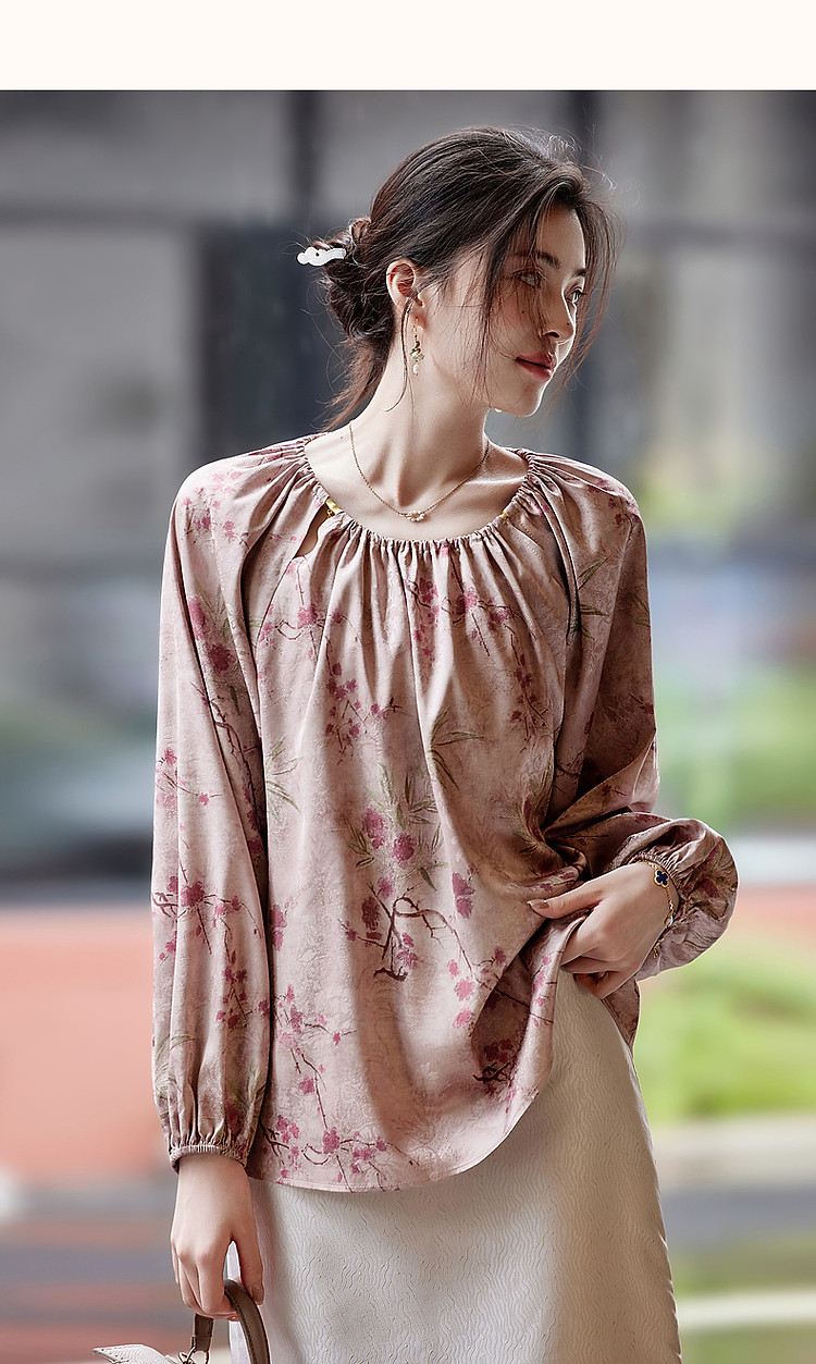 商品名称:【烟暖初妆】春秋国风新中式缎面印花衬衫蕙兰粉气质抽褶衬衣 570305