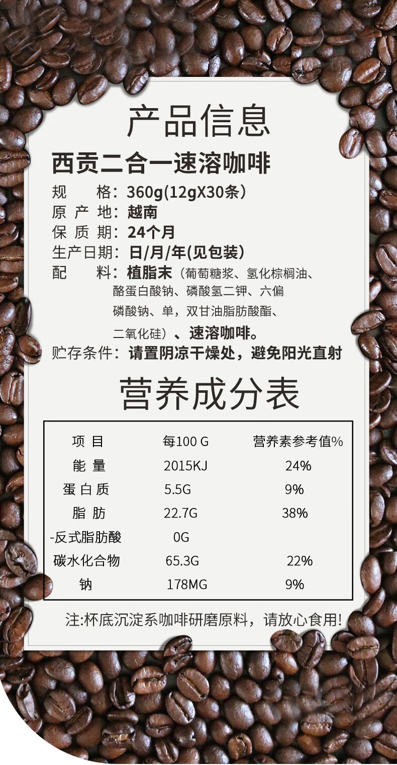 商品名称:西贡越南进口二合一无蔗糖速溶咖啡粉360g(12gx30条)袋装
