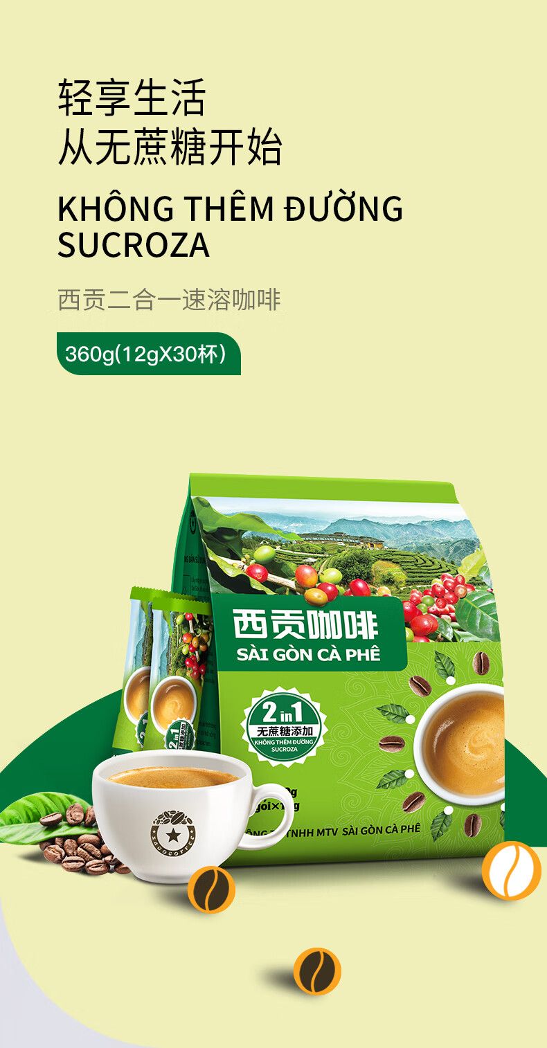 西贡越南进口二合一无蔗糖速溶咖啡粉360g(12gx30条)袋装