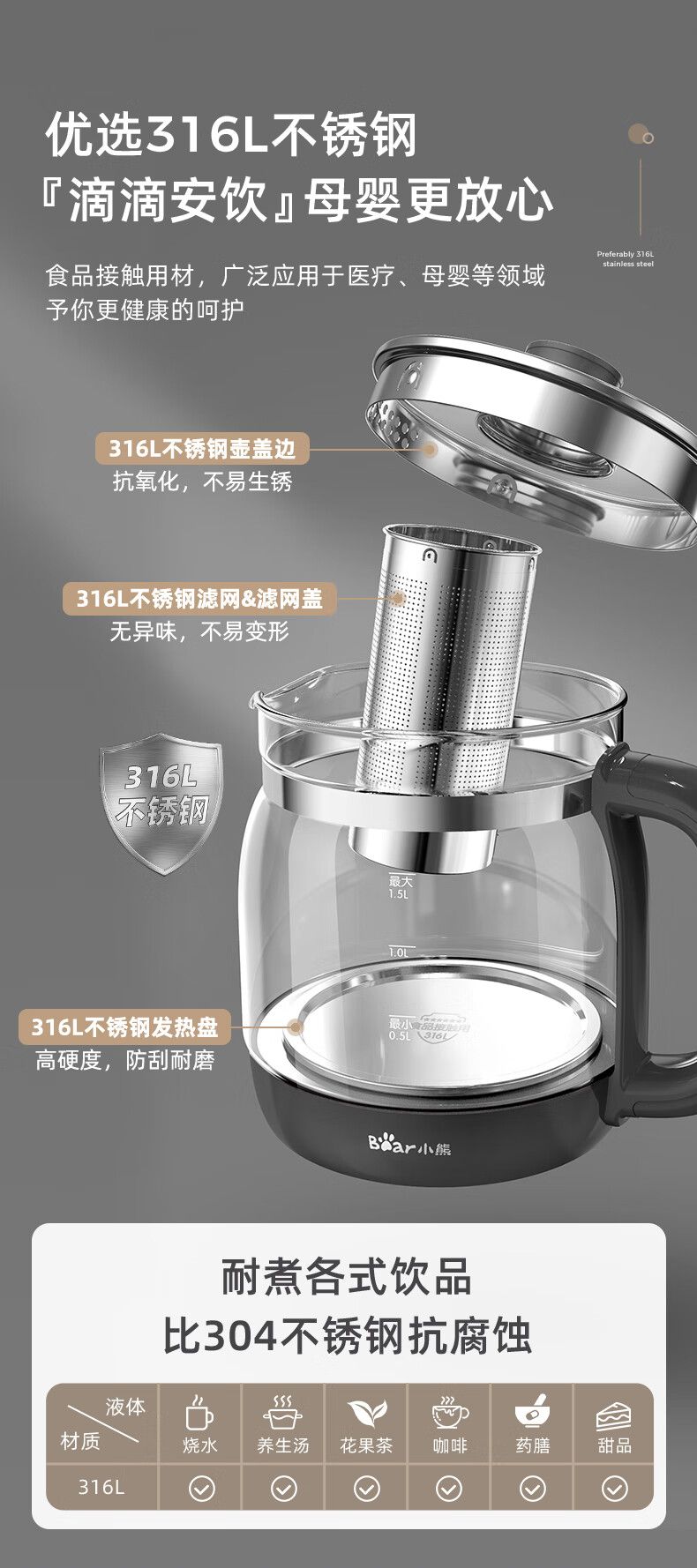 小熊(Bear)养生壶多功能316L不锈钢办公室 1.5L全自动泡煮茶器花茶烧水壶YSH-E15J5