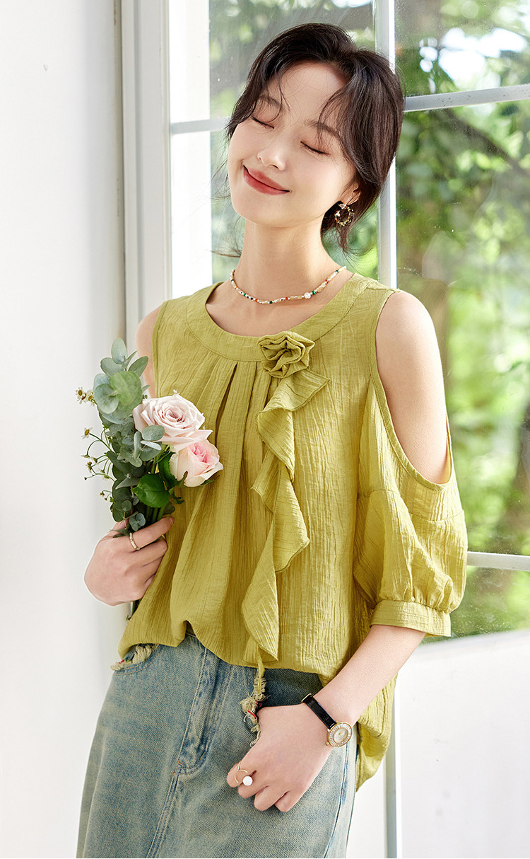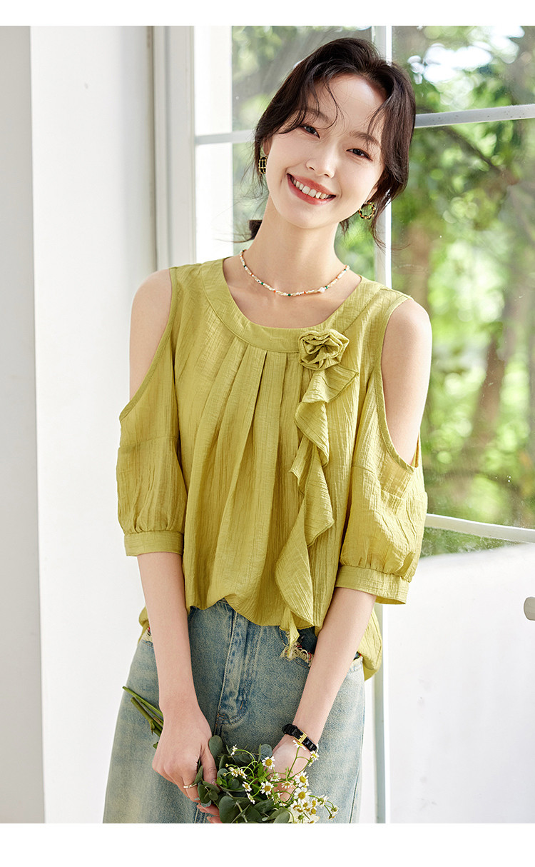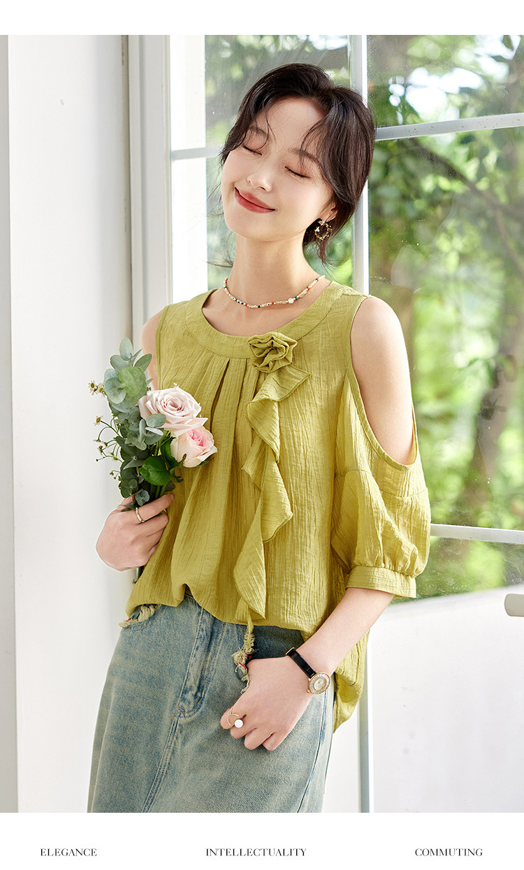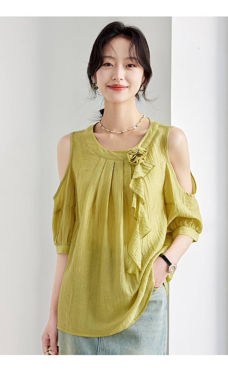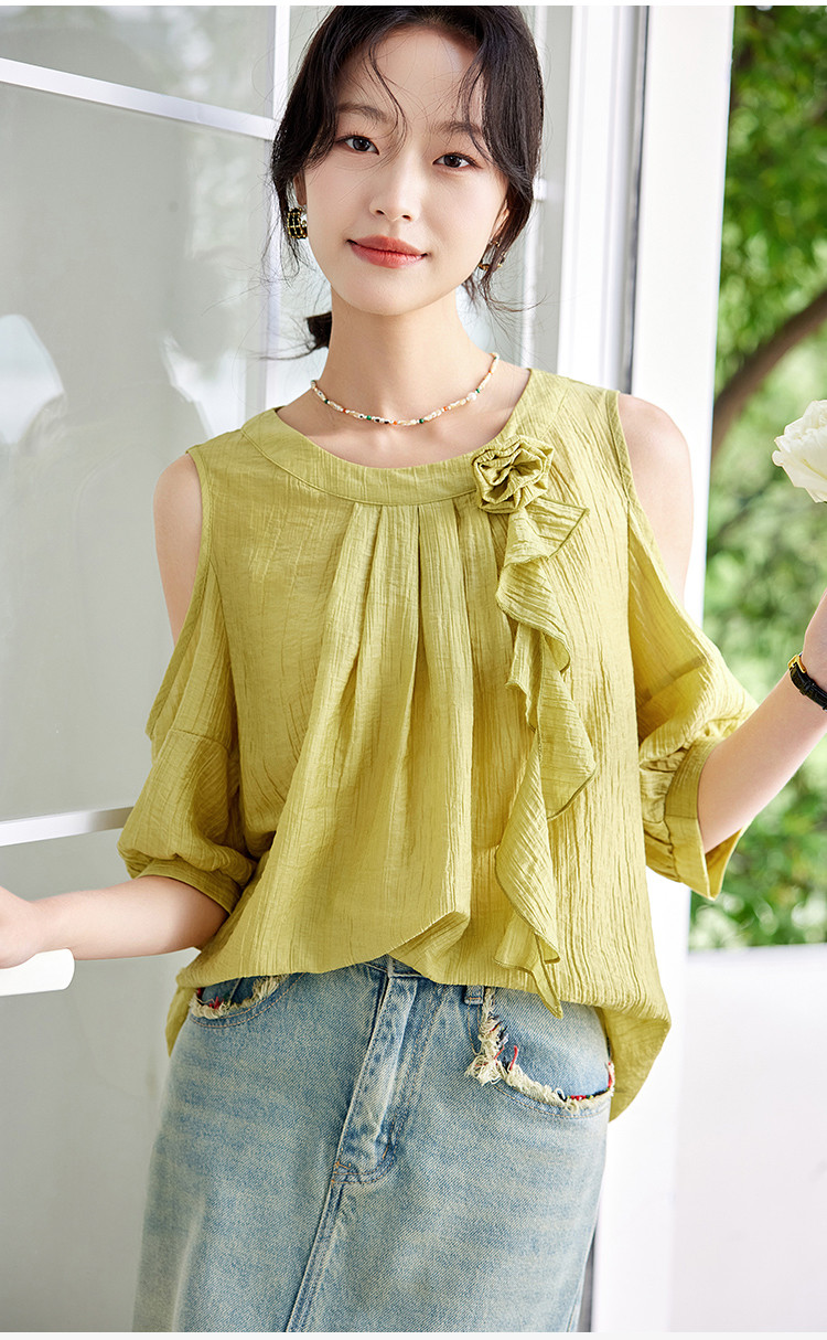 商品名称:莱赛尔露肩衬衫女2025夏季新款肌理感宽松显瘦泡泡袖轻薄上衣 465048