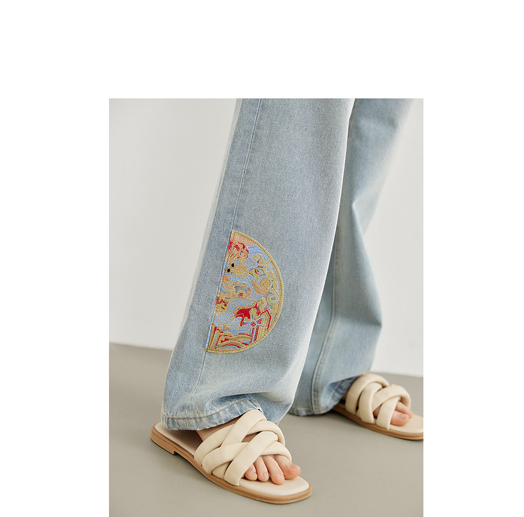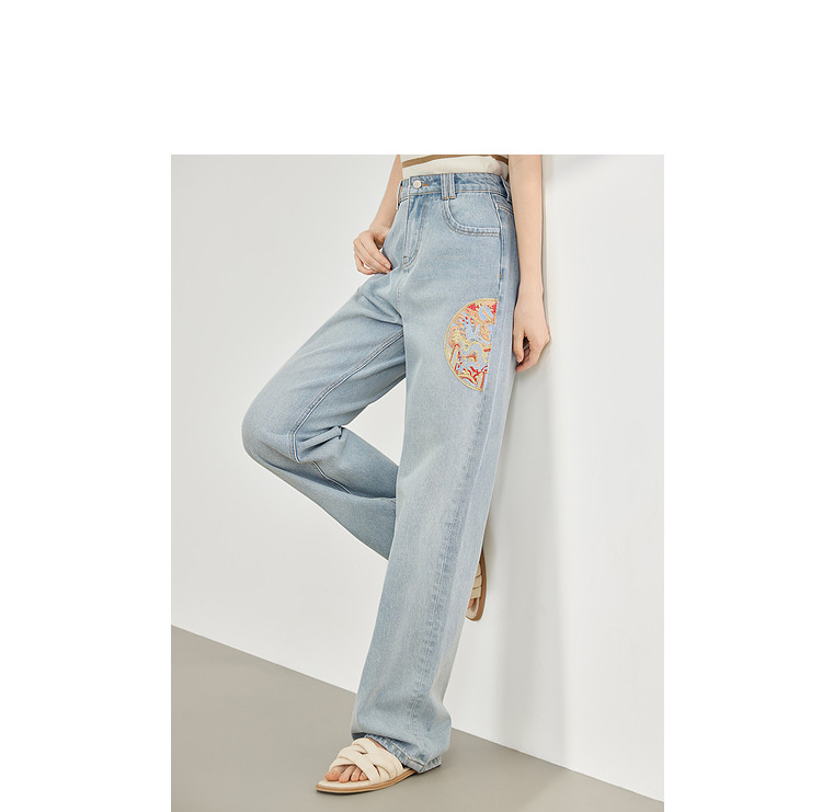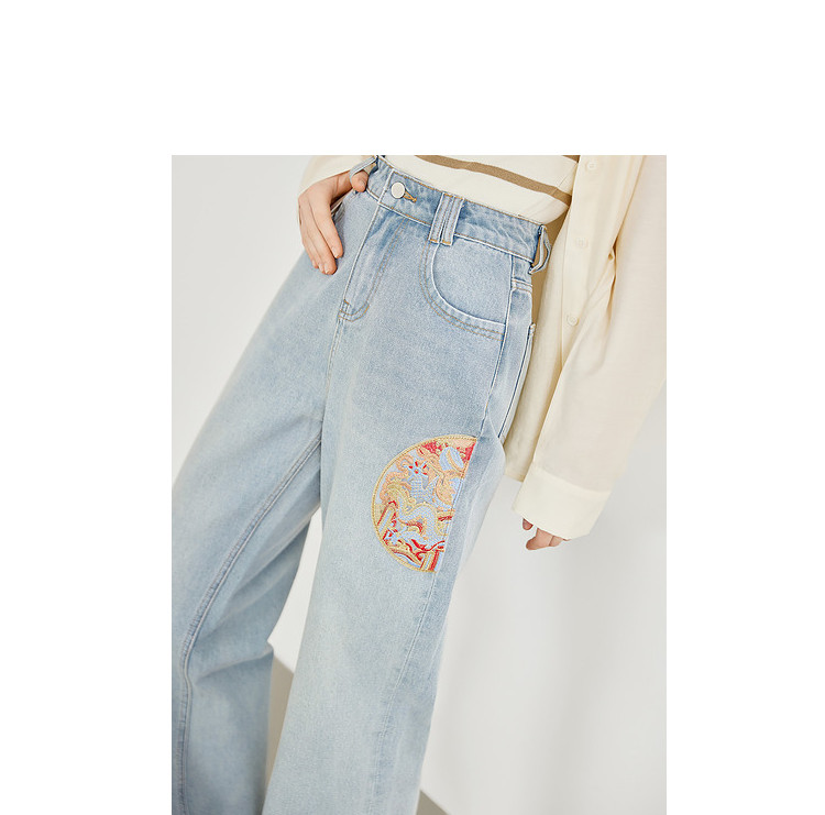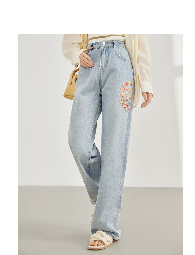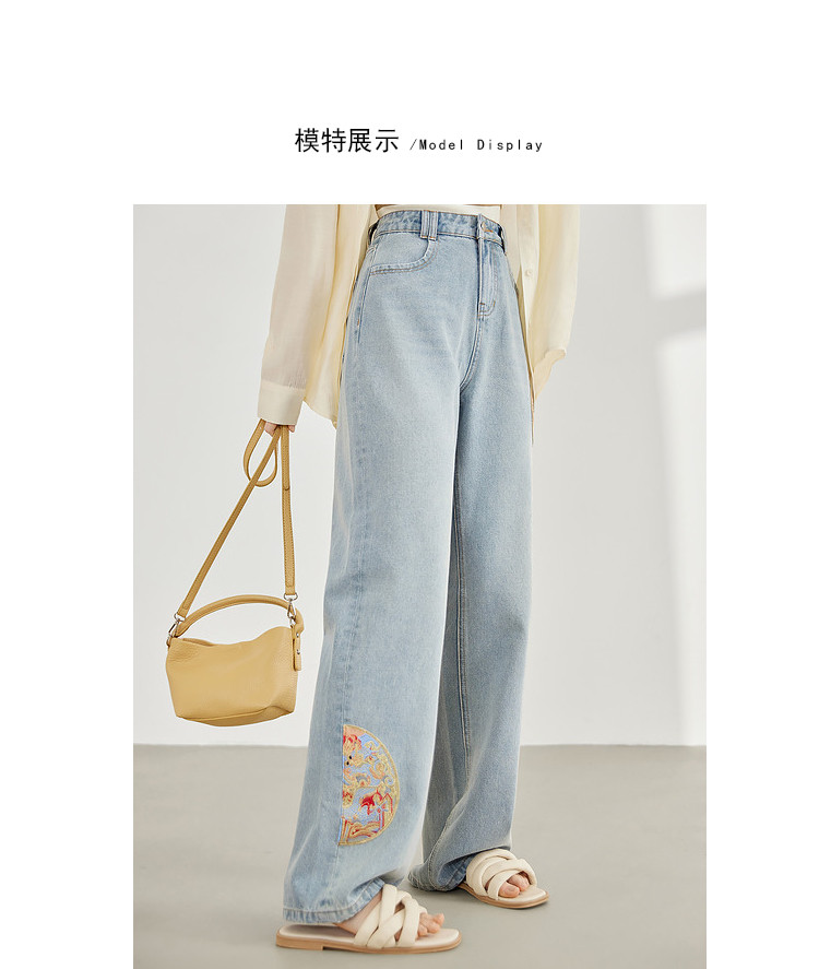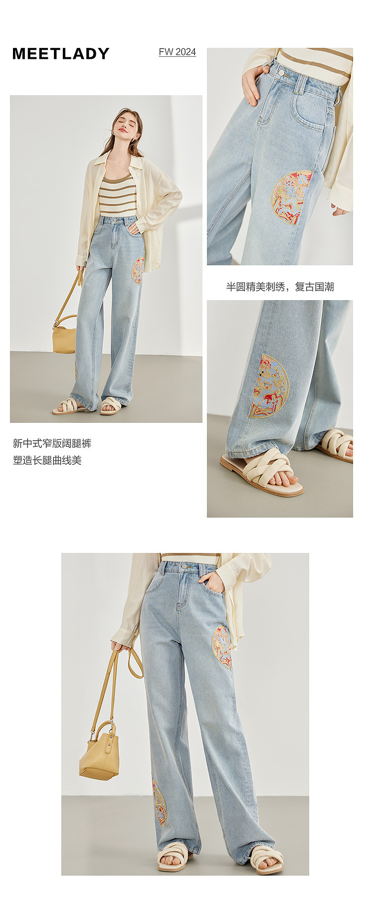 【2024秋季】新中式国风刺绣高腰直筒牛仔裤显瘦阔腿裤 489876