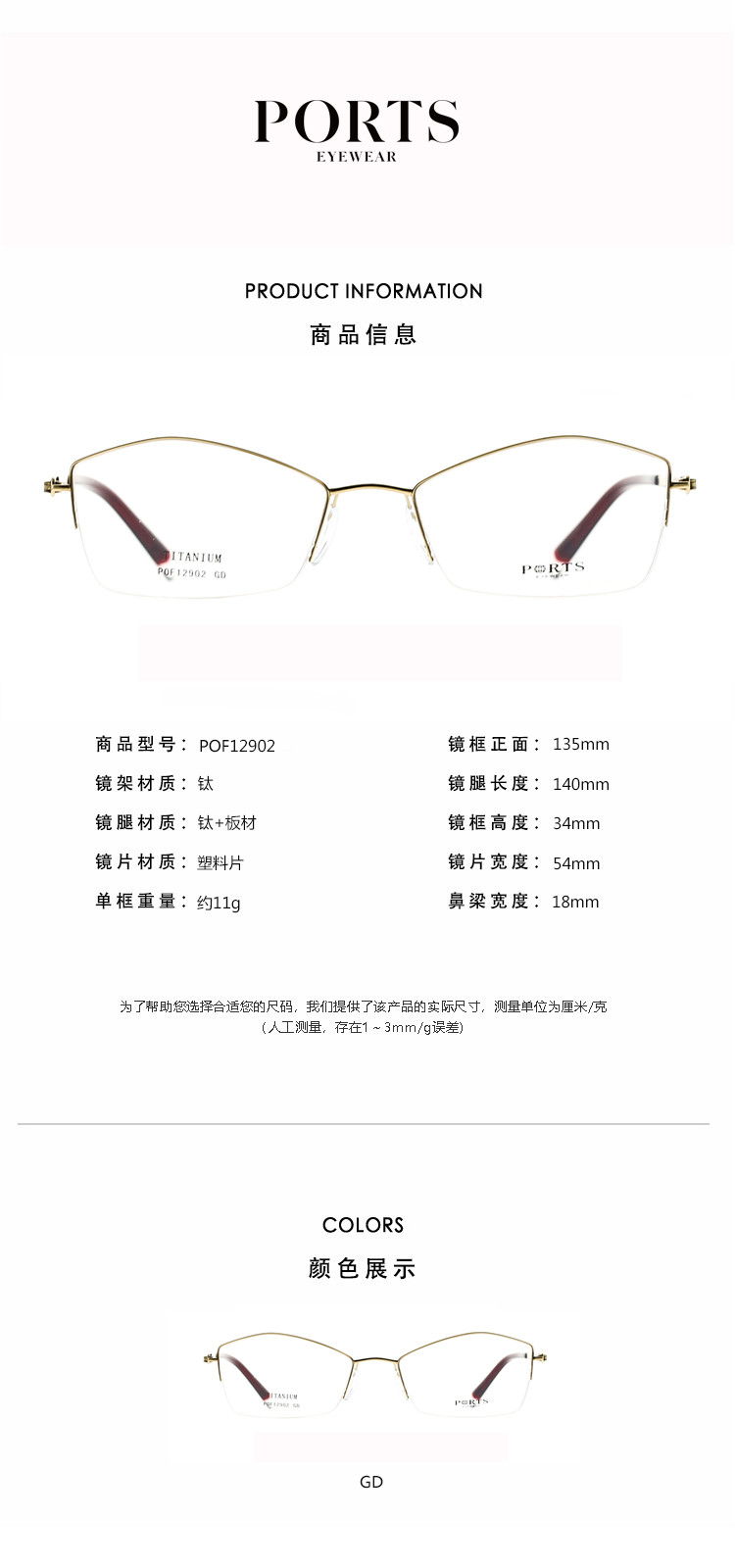 商品名称:PORTS女款轻奢优雅纯钛女士光学架POF12902 615114