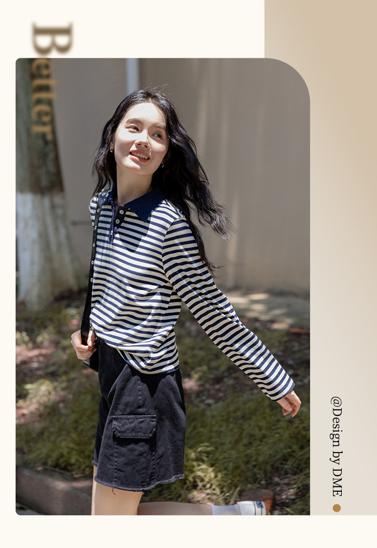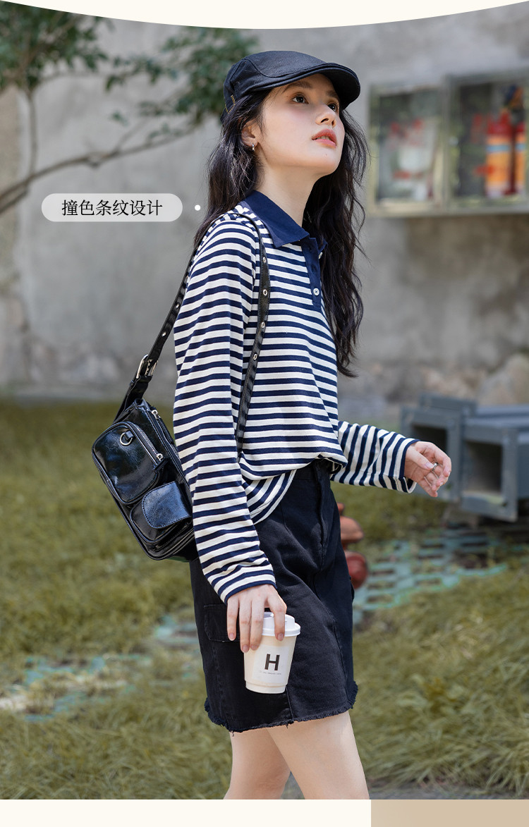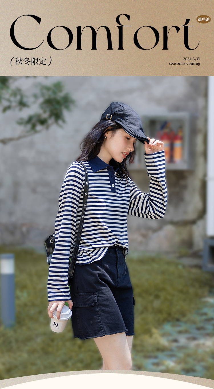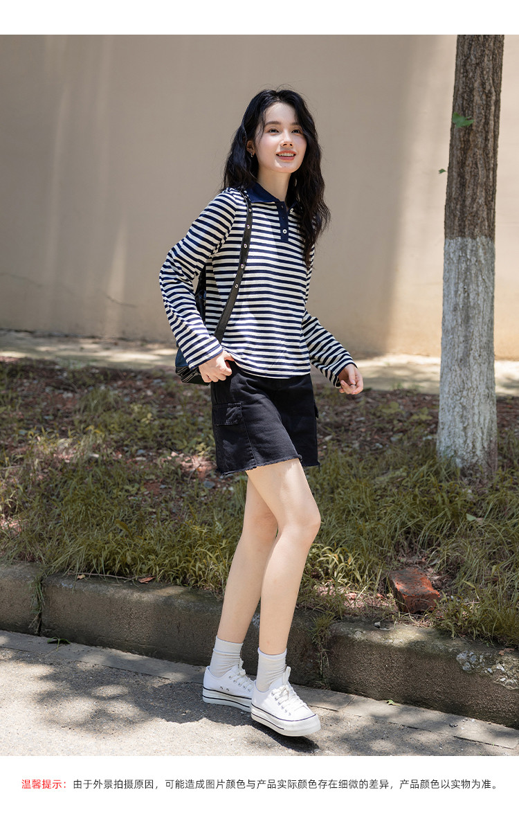 商品名称:【条纹新演绎】100%棉清新撞色条纹polo领百搭女式T恤 475585