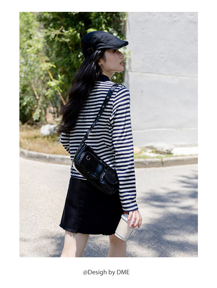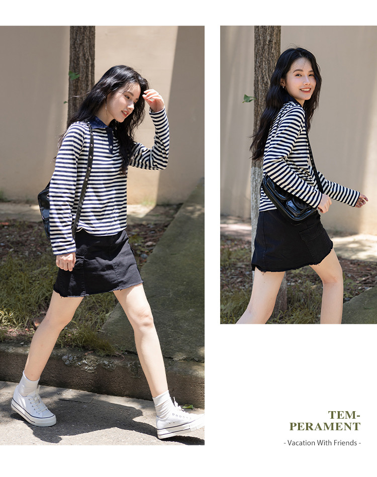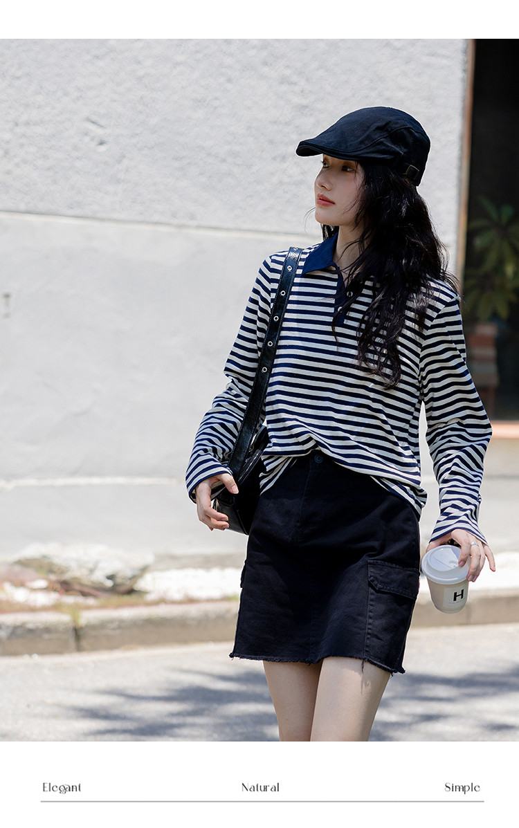 【条纹新演绎】100%棉清新撞色条纹polo领百搭女式T恤 475585