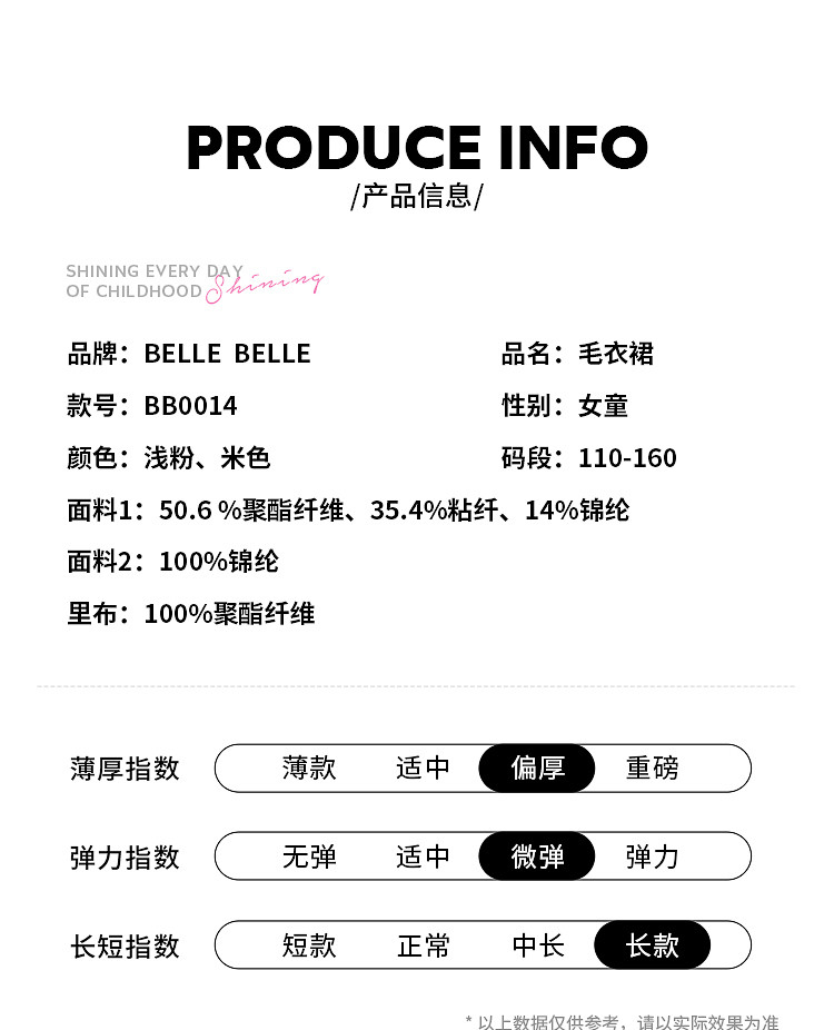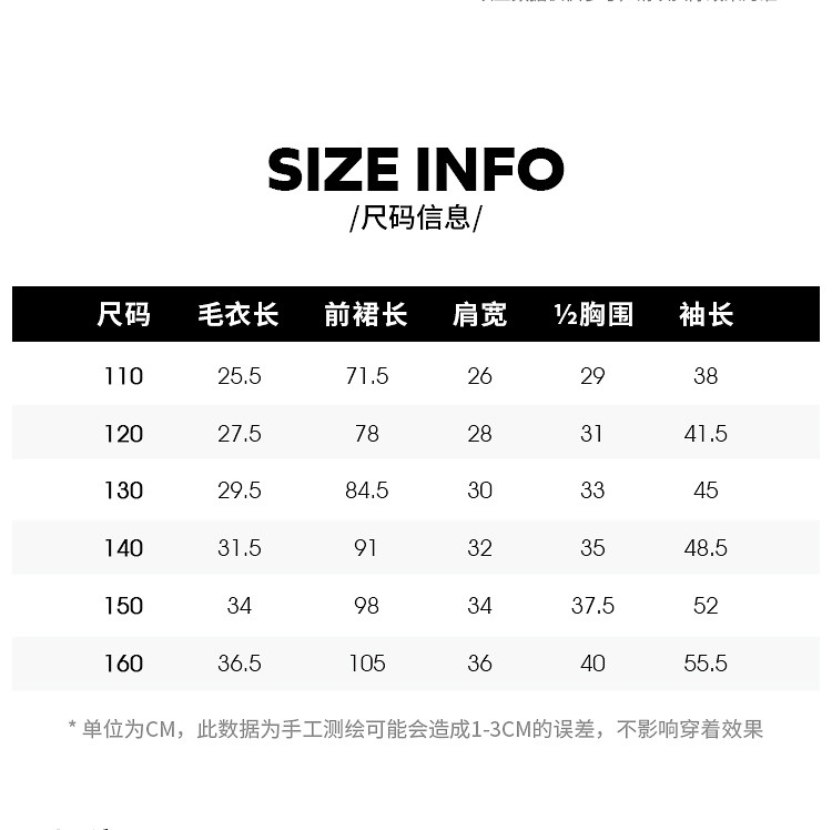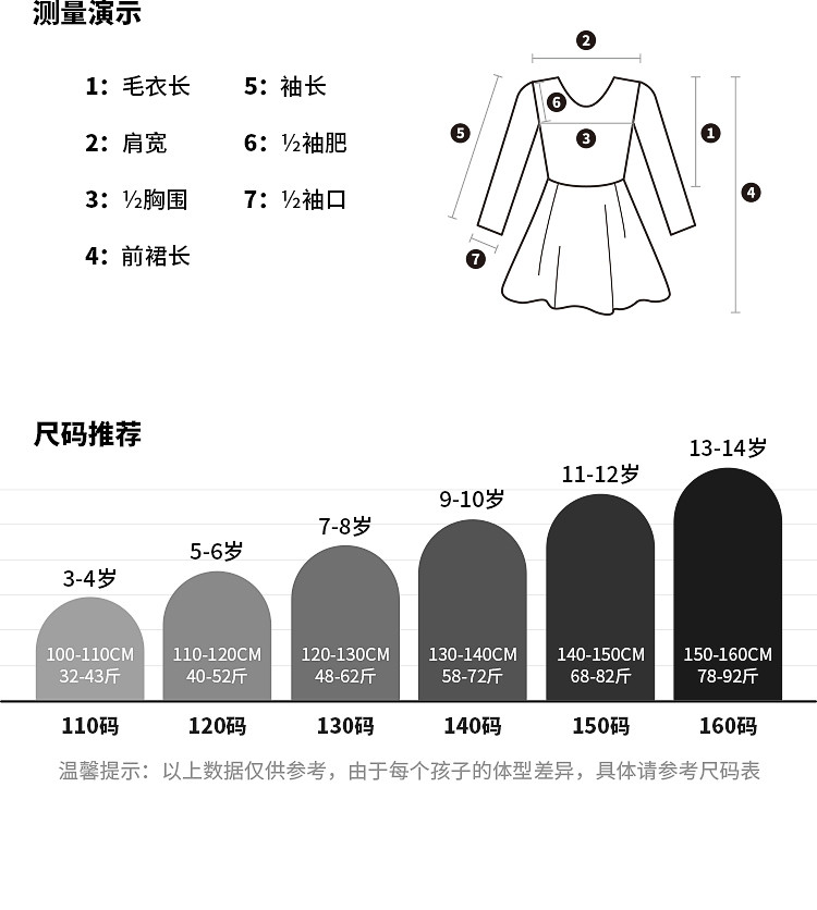 | 尺码 | 裙长(cm) | 肩宽(cm) | 身高(cm) | 袖长(cm) | 适合年龄 | 胸围(cm) | 号型 |