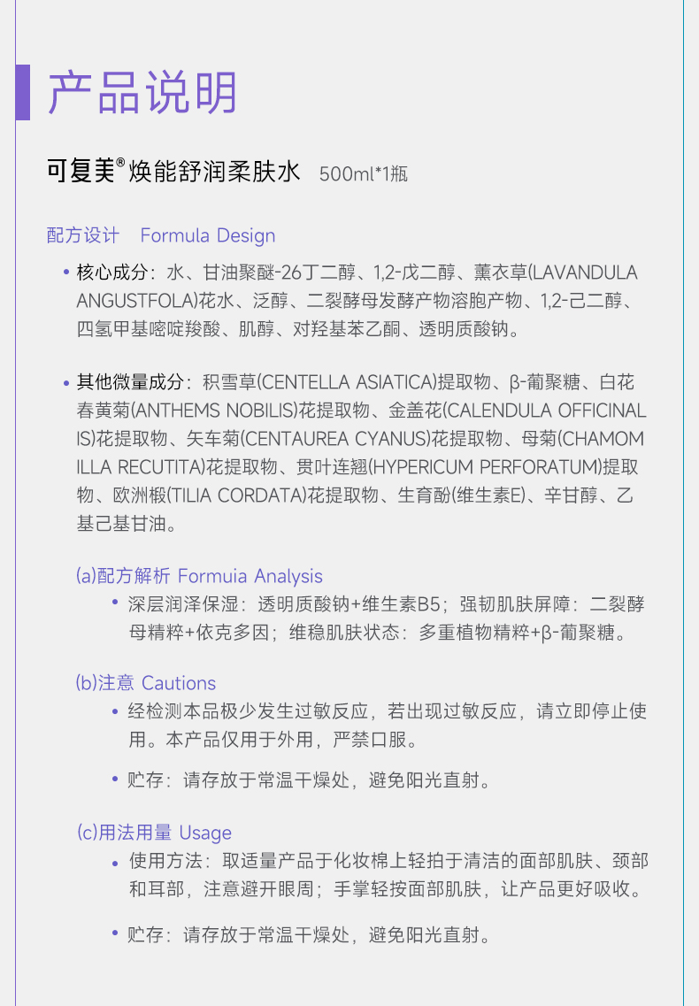 商品名称:可复美 焕能舒缓爽肤水2.0保湿敏皮肌肤面部柔肤水 500ml