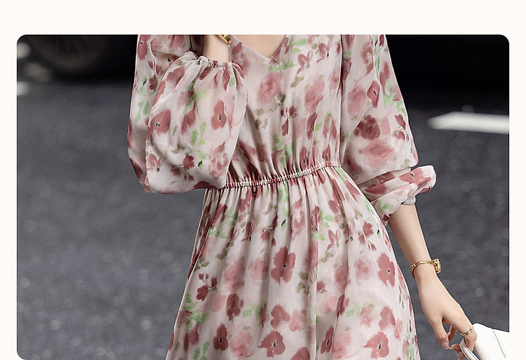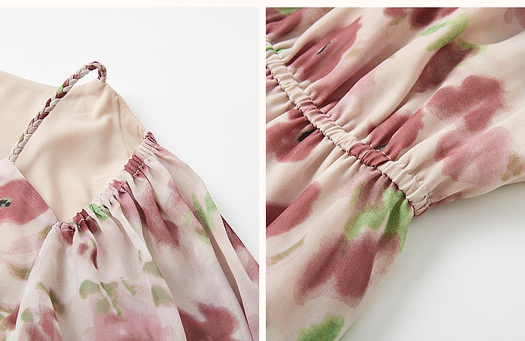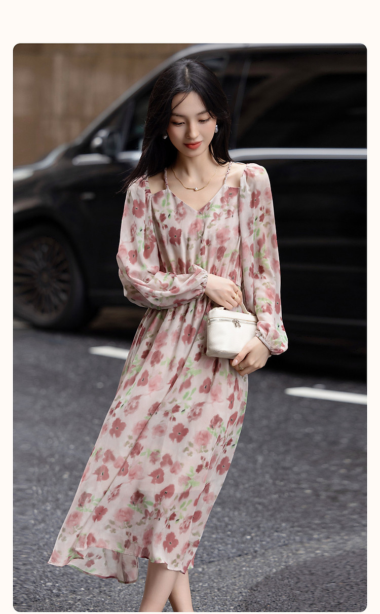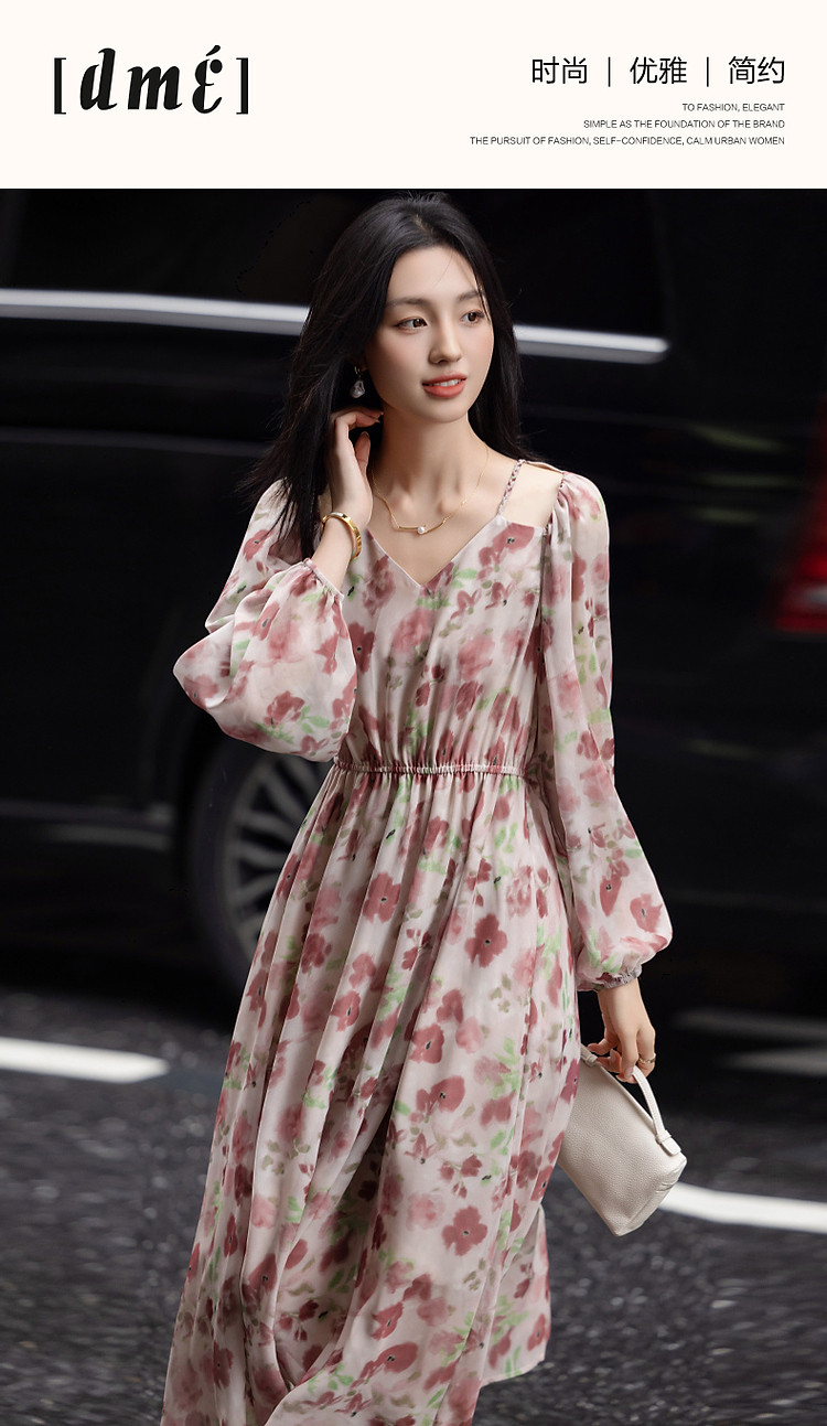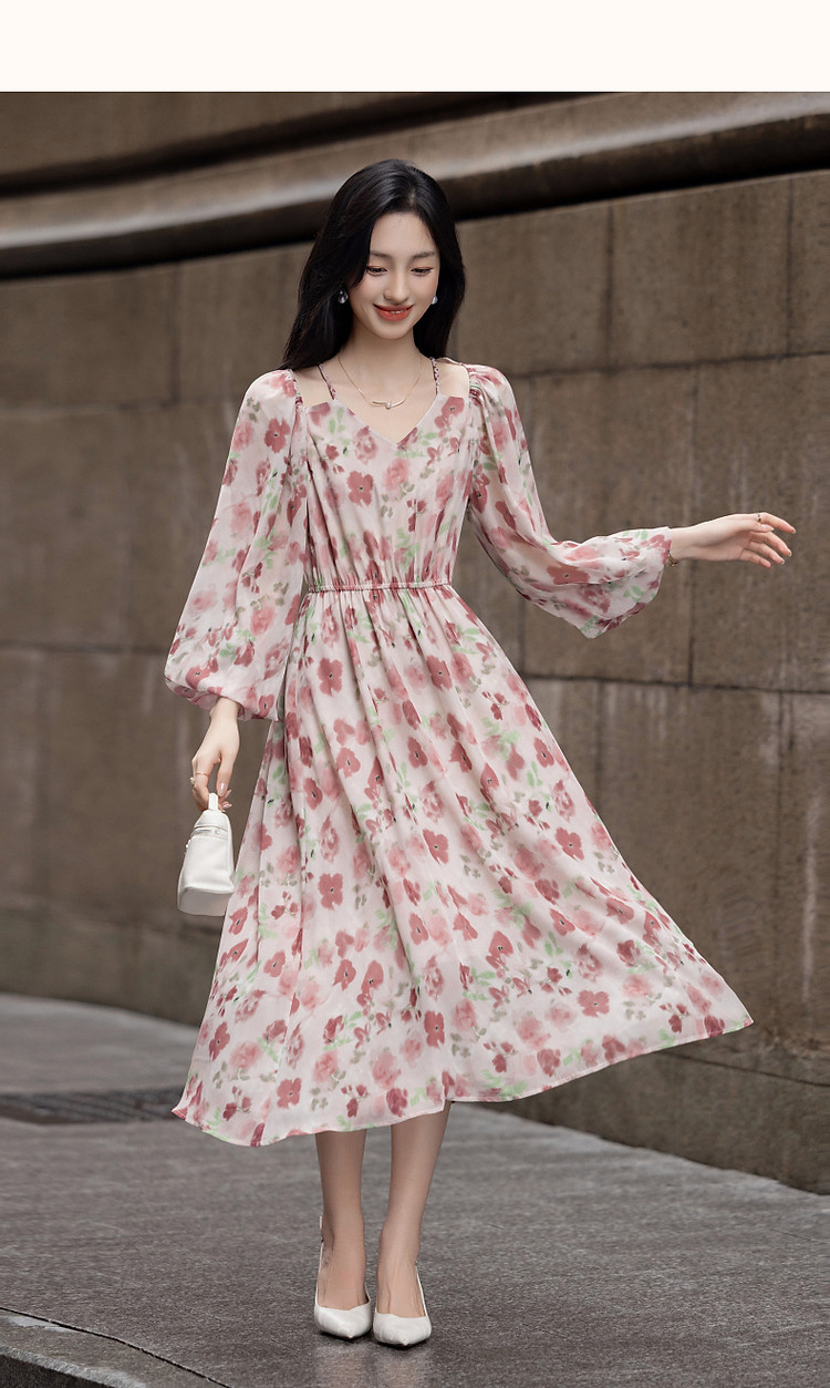 商品名称:【法式衣橱】秋飘逸淑女肩部镂空雪纺印花编织肩带九分袖连衣裙 985985