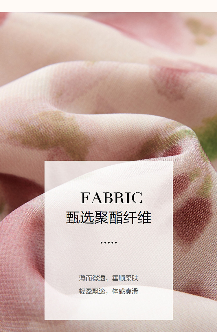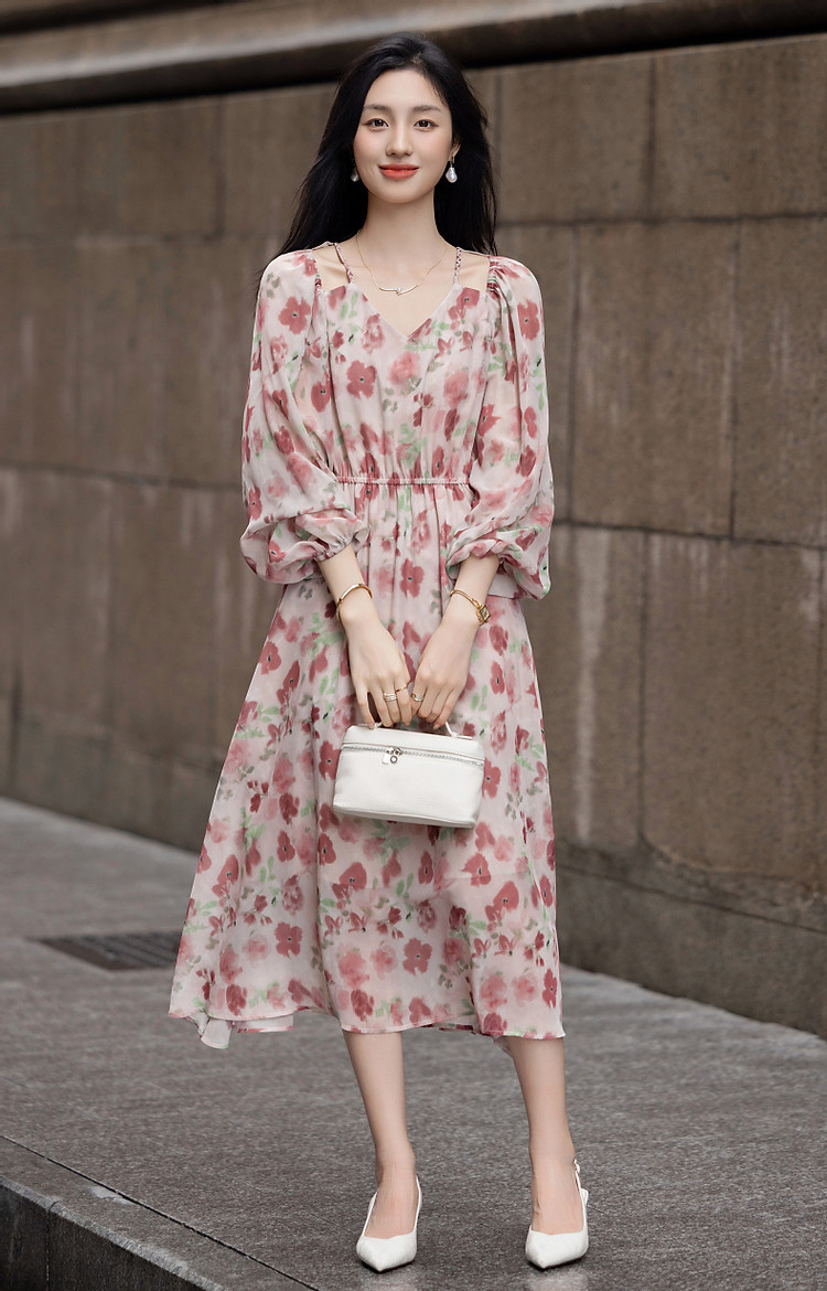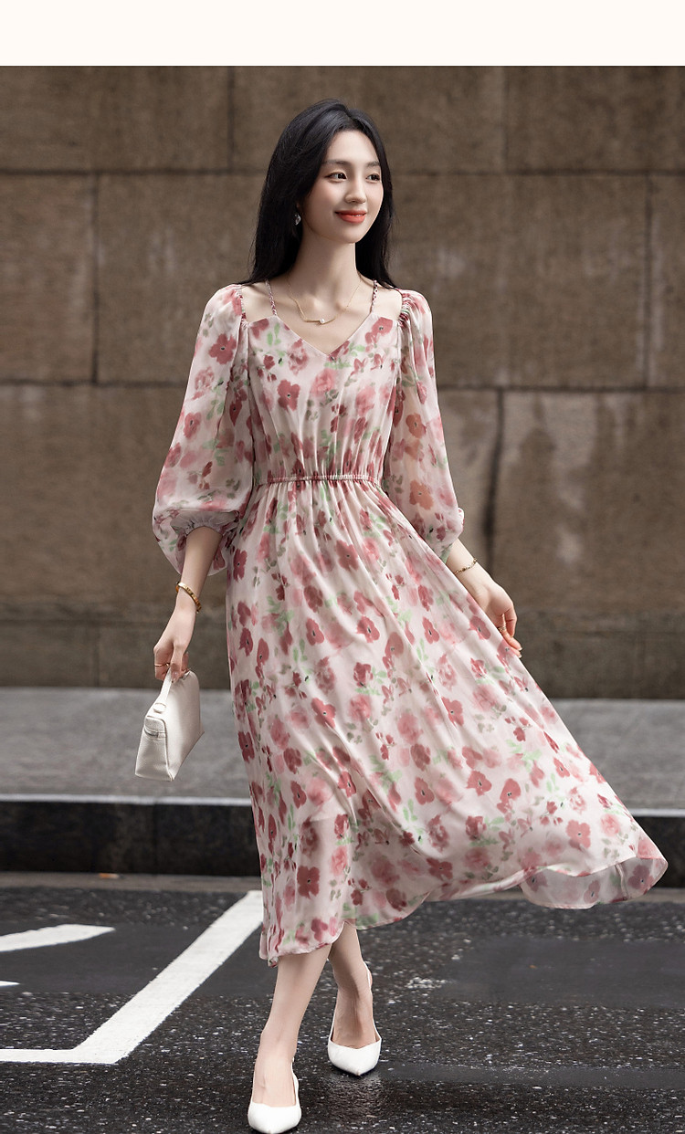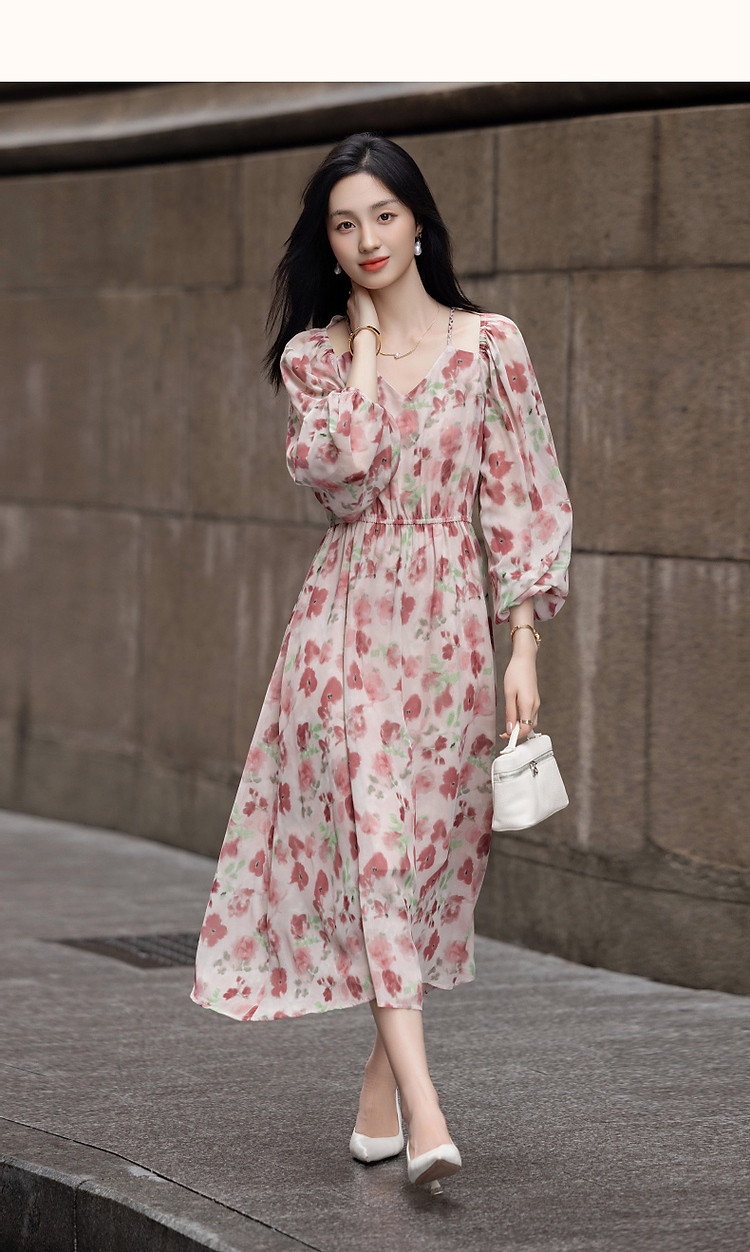 商品名称:【法式衣橱】秋飘逸淑女肩部镂空雪纺印花编织肩带九分袖连衣裙 985985