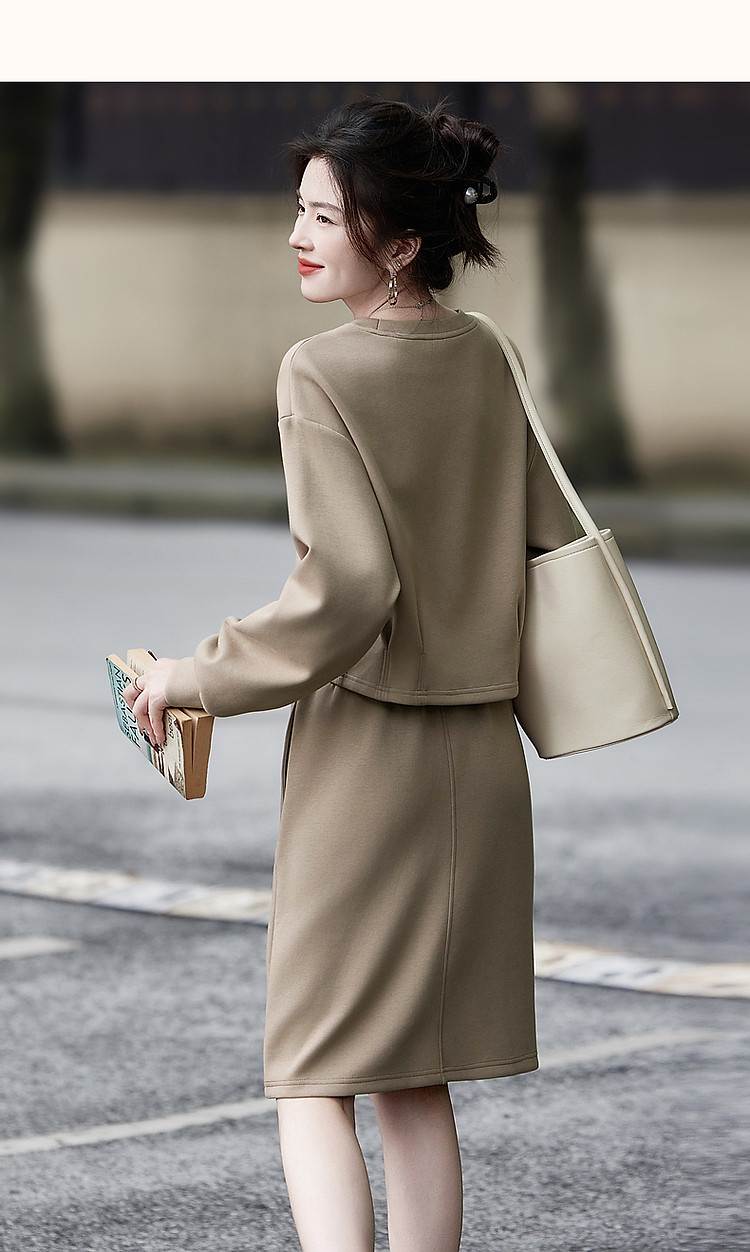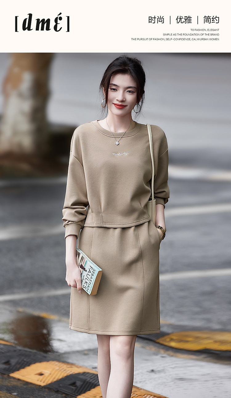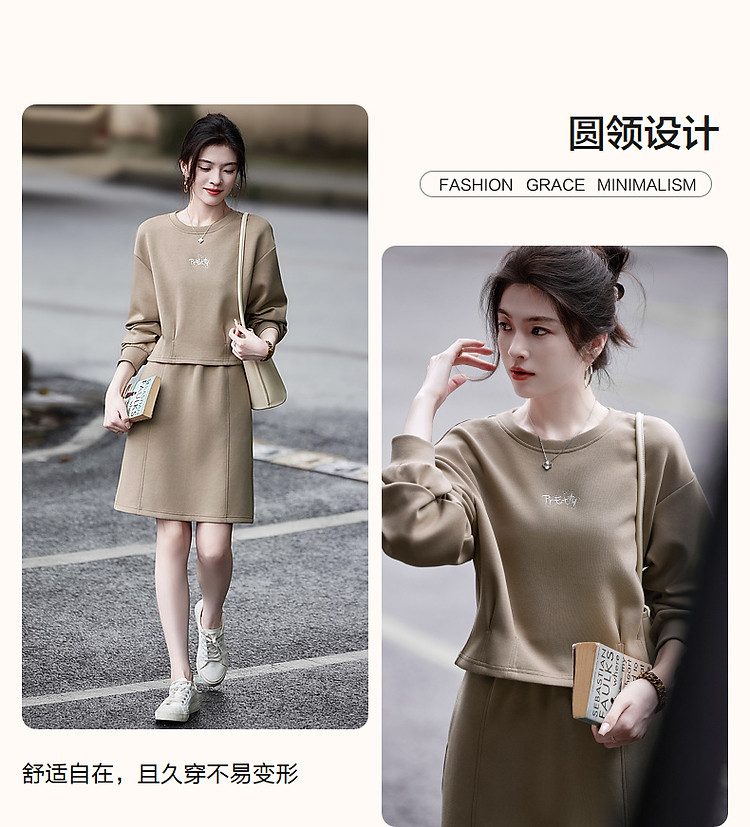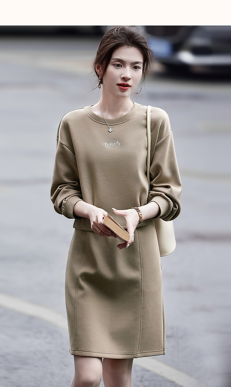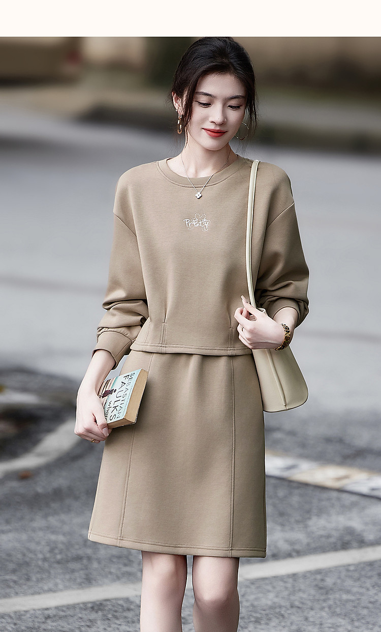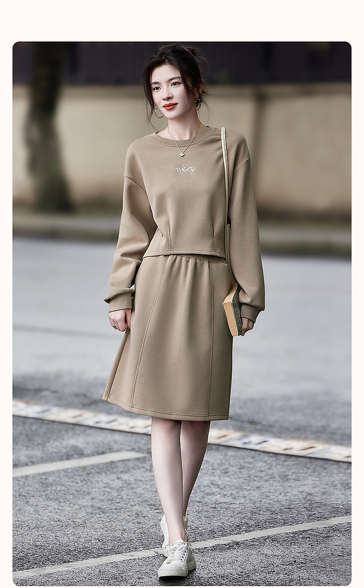 商品名称:【350G空气层套装】秋圆领褶裥字母绣花上衣分割线半裙两件套 676289