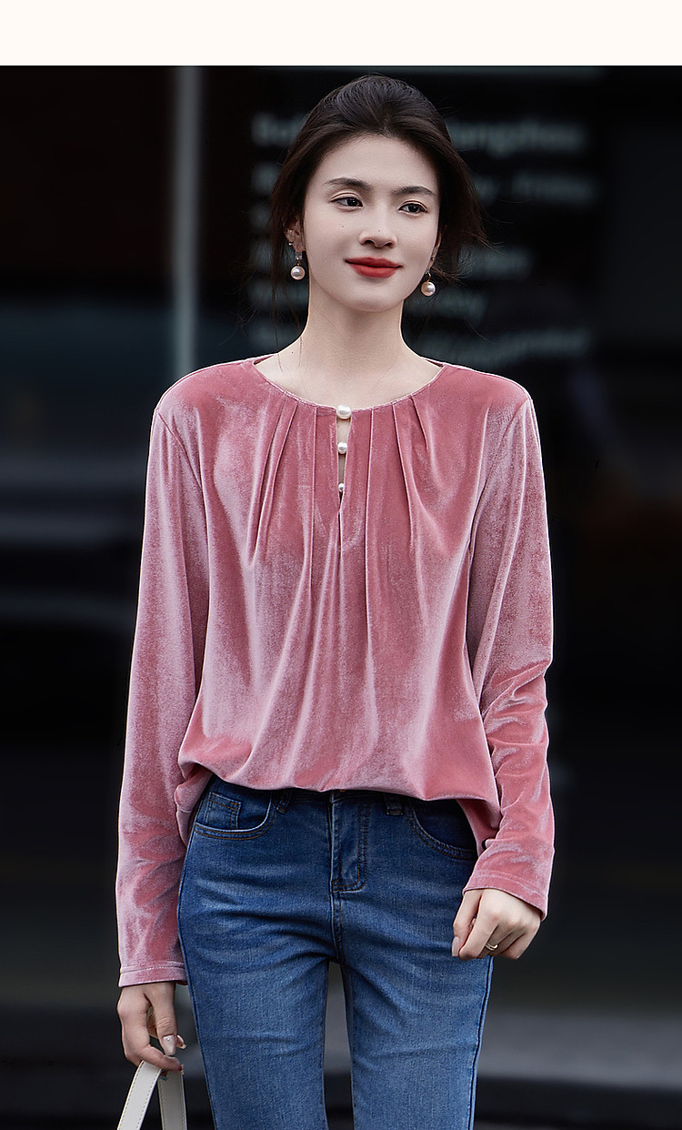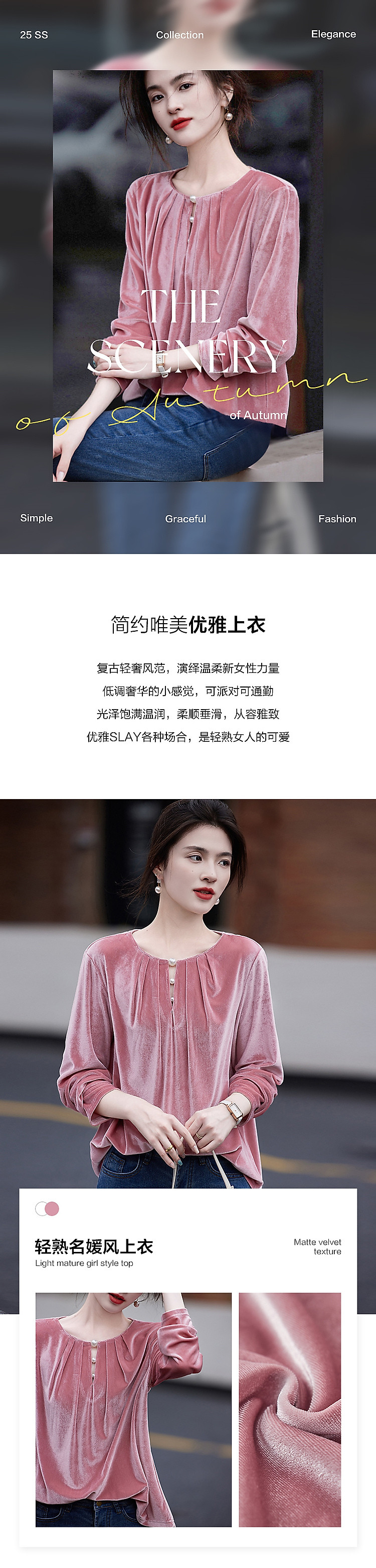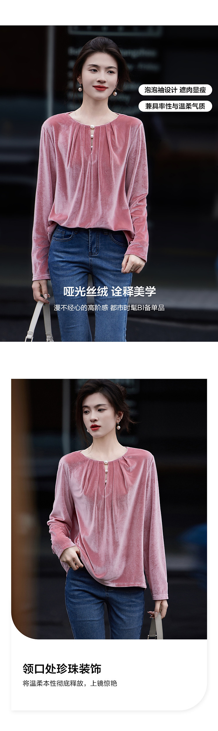 商品名称:【松雾玫瑰】秋轻熟名媛风哑光丝绒上衣珍珠泡泡袖遮肉女式t恤 762305