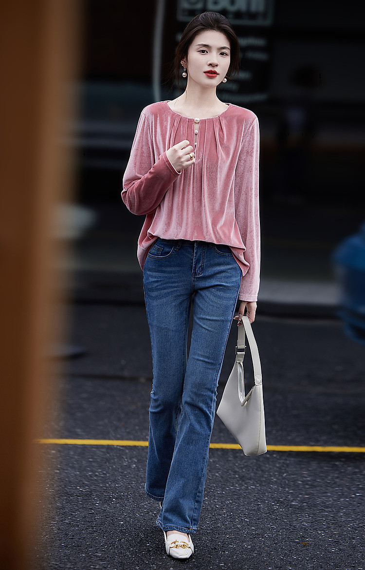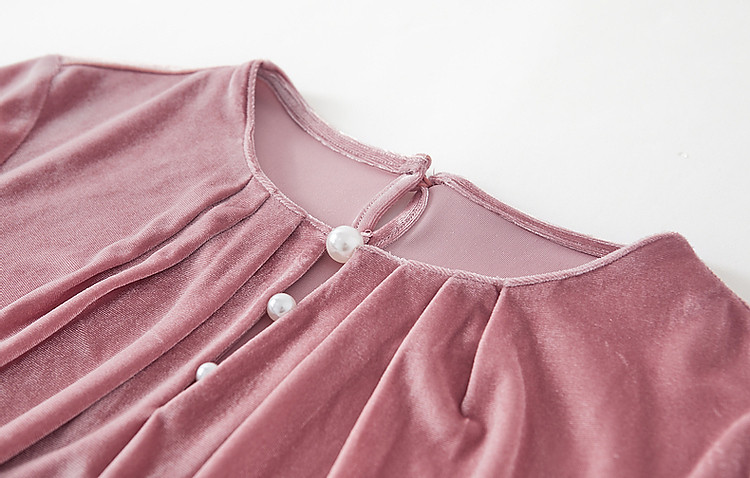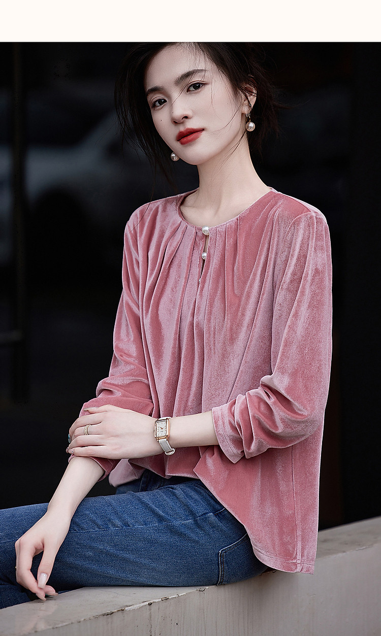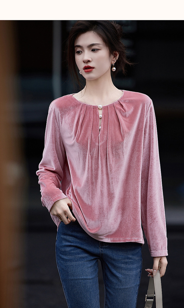 商品名称:【松雾玫瑰】秋轻熟名媛风哑光丝绒上衣珍珠泡泡袖遮肉女式t恤 762305