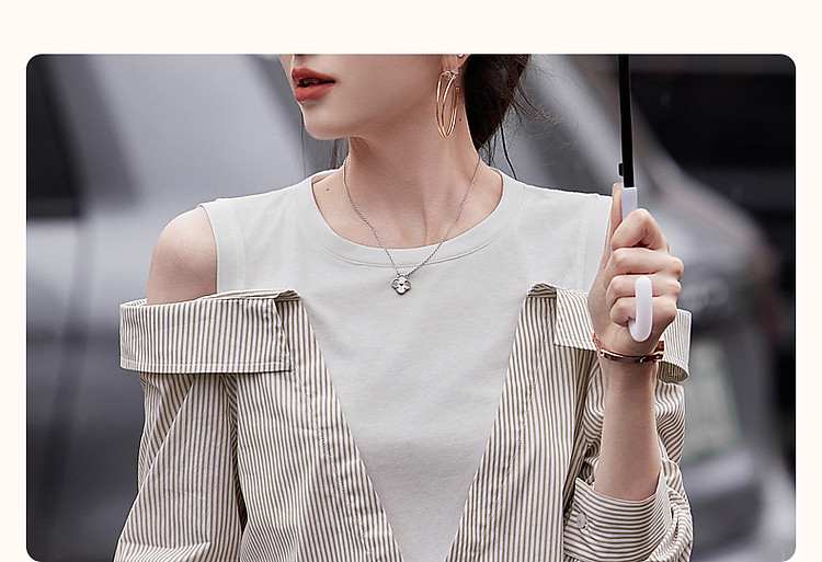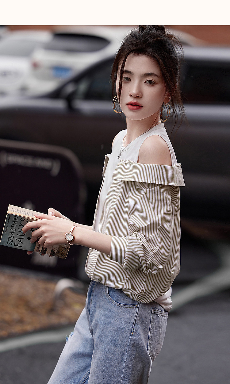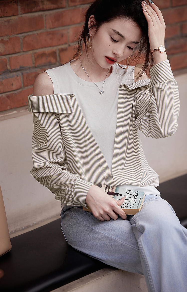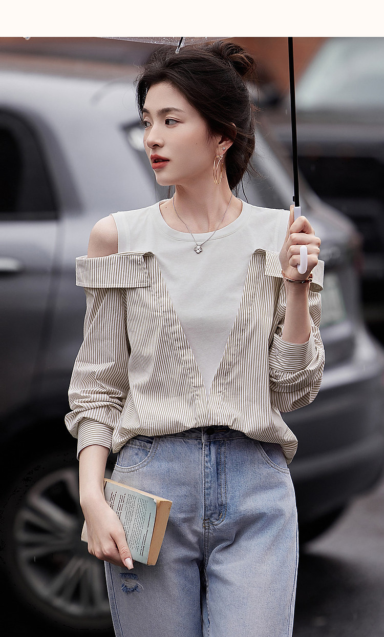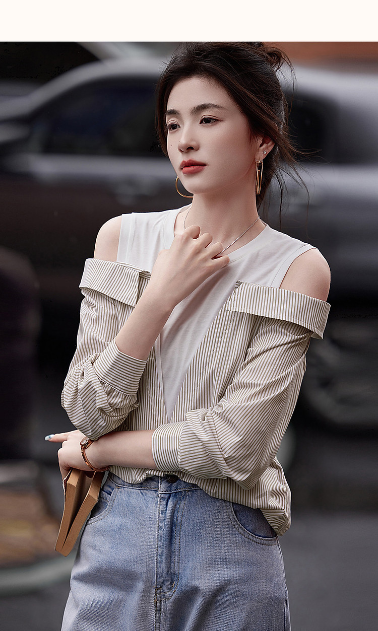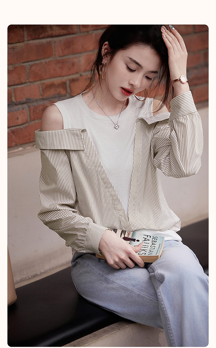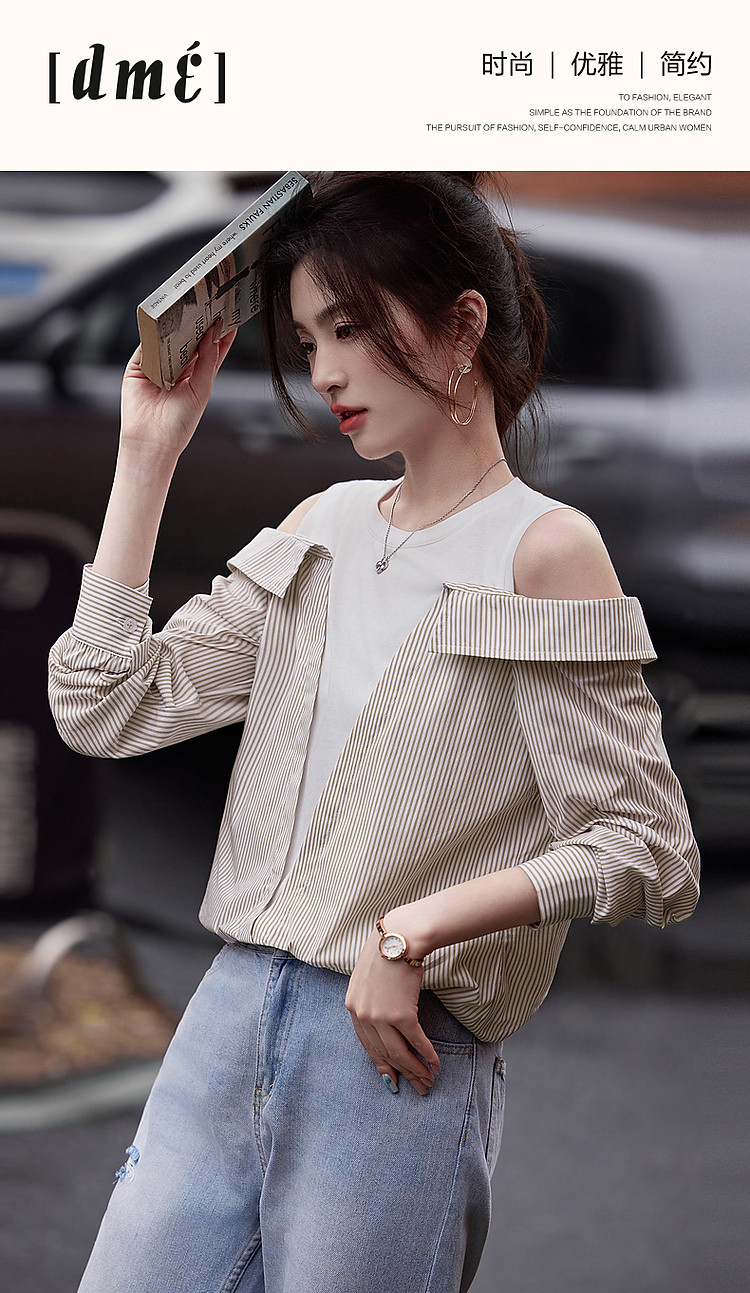 【时髦新定义】春秋新圆领棉质假两件露肩衬衣格纹拼接衬衫女式 876993