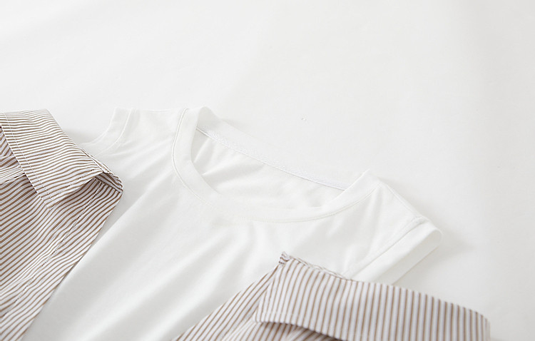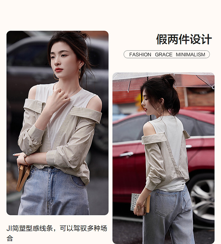 商品名称:【时髦新定义】春秋新圆领棉质假两件露肩衬衣格纹拼接衬衫女式 876993