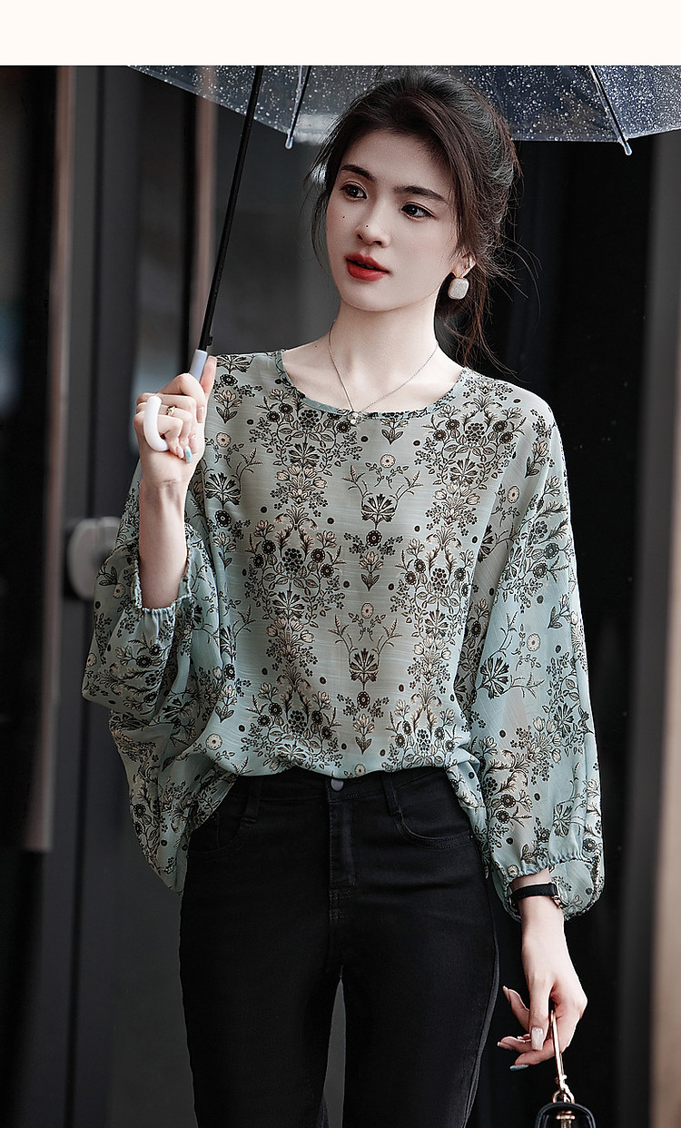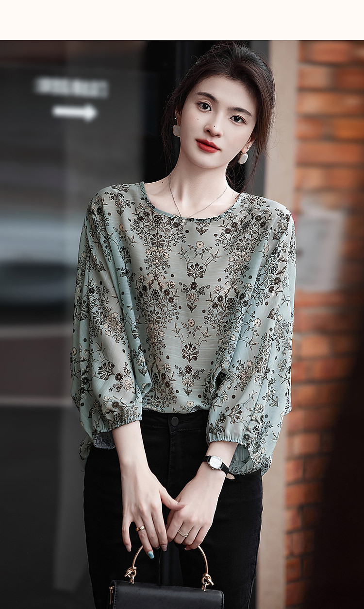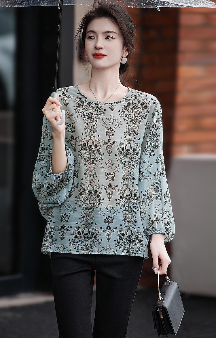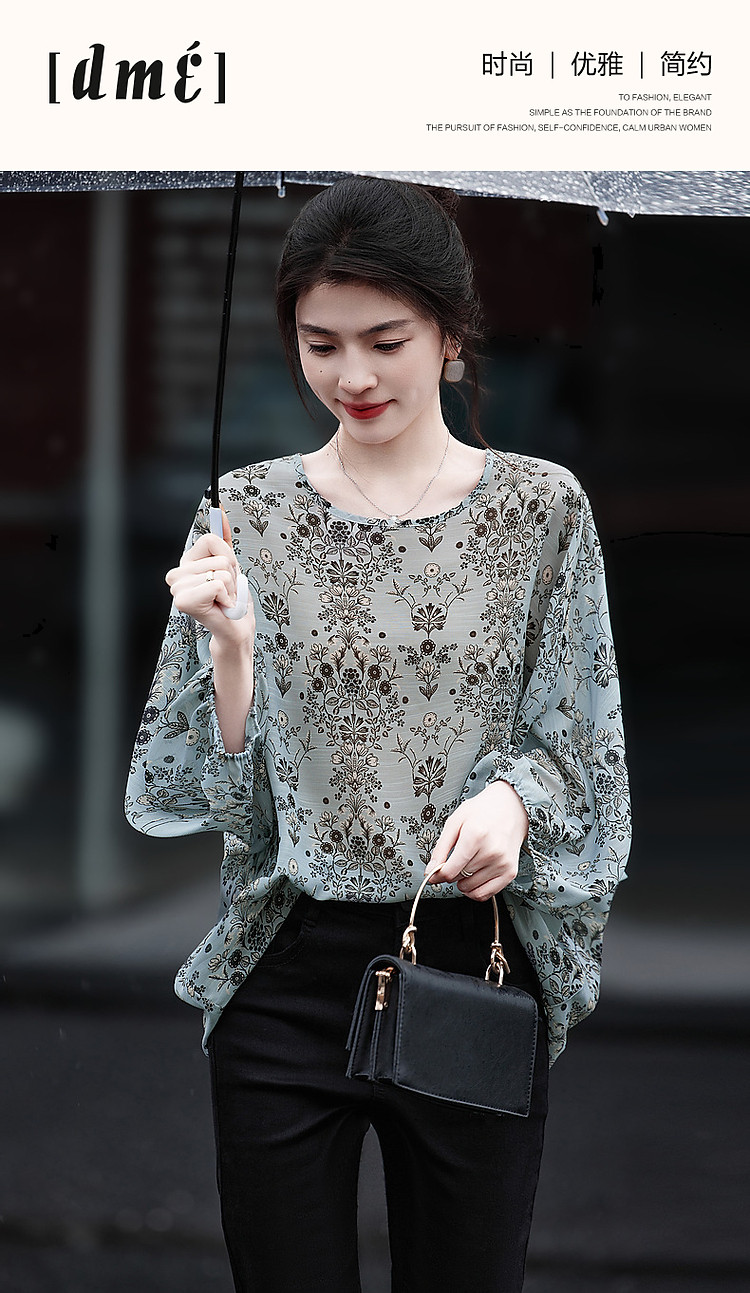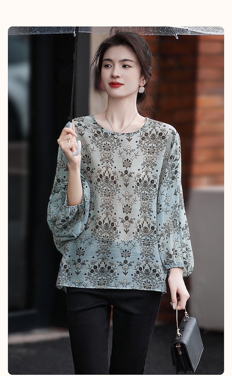 【隽永繁花】秋圆领前后两片式分割廓形衬衫连肩高清印花女上衣 215361