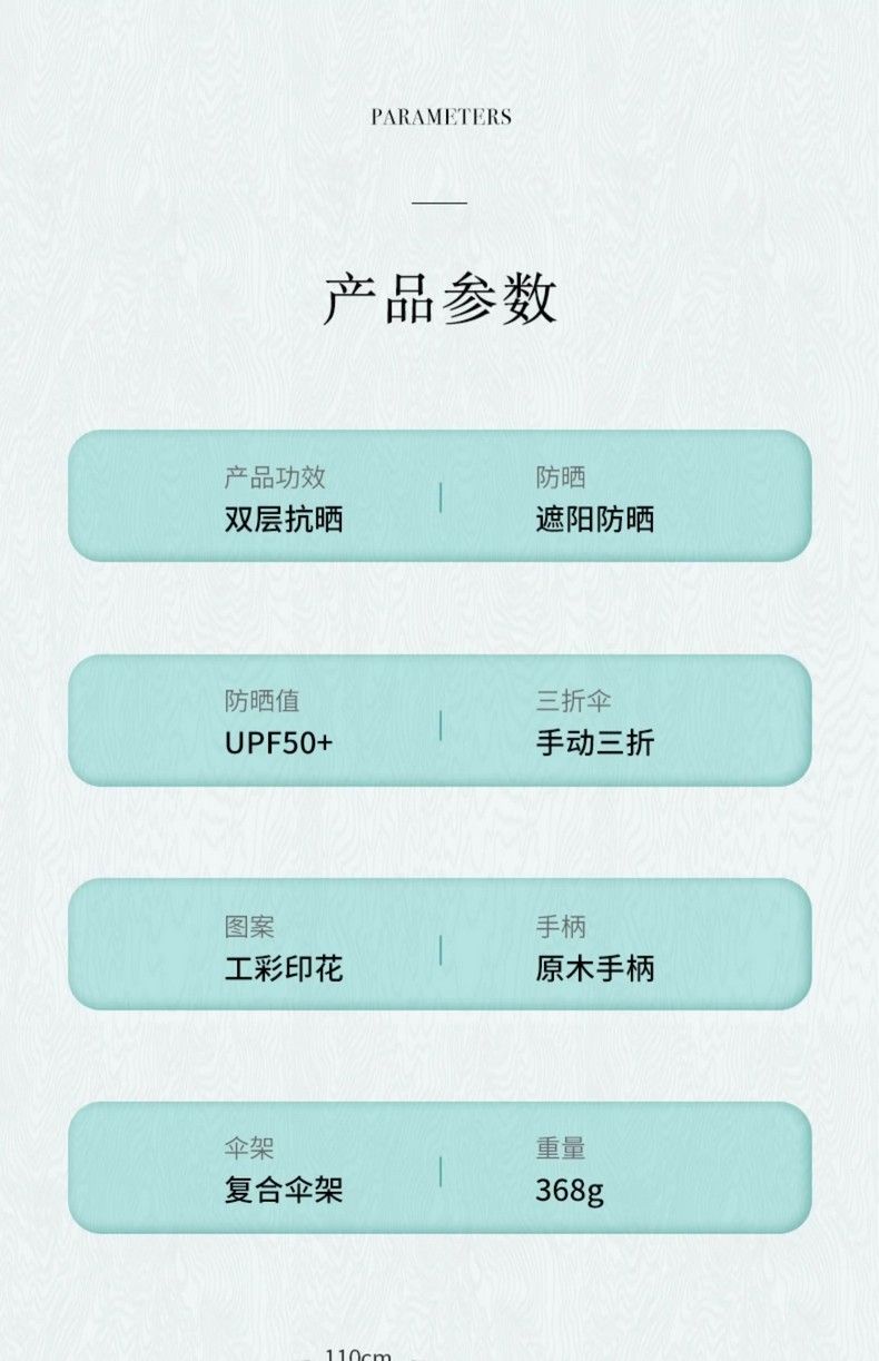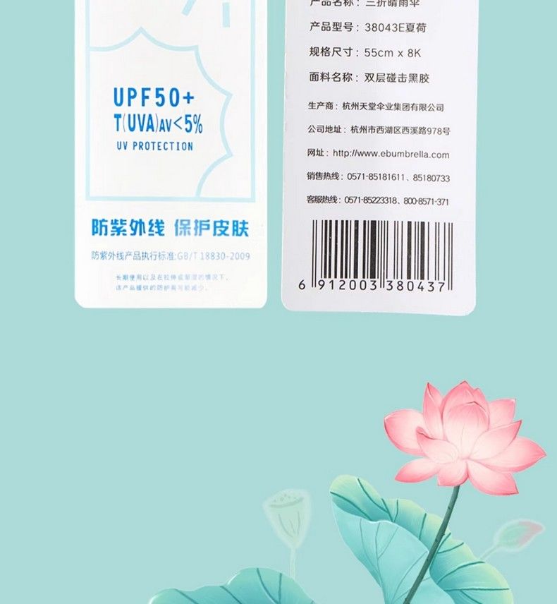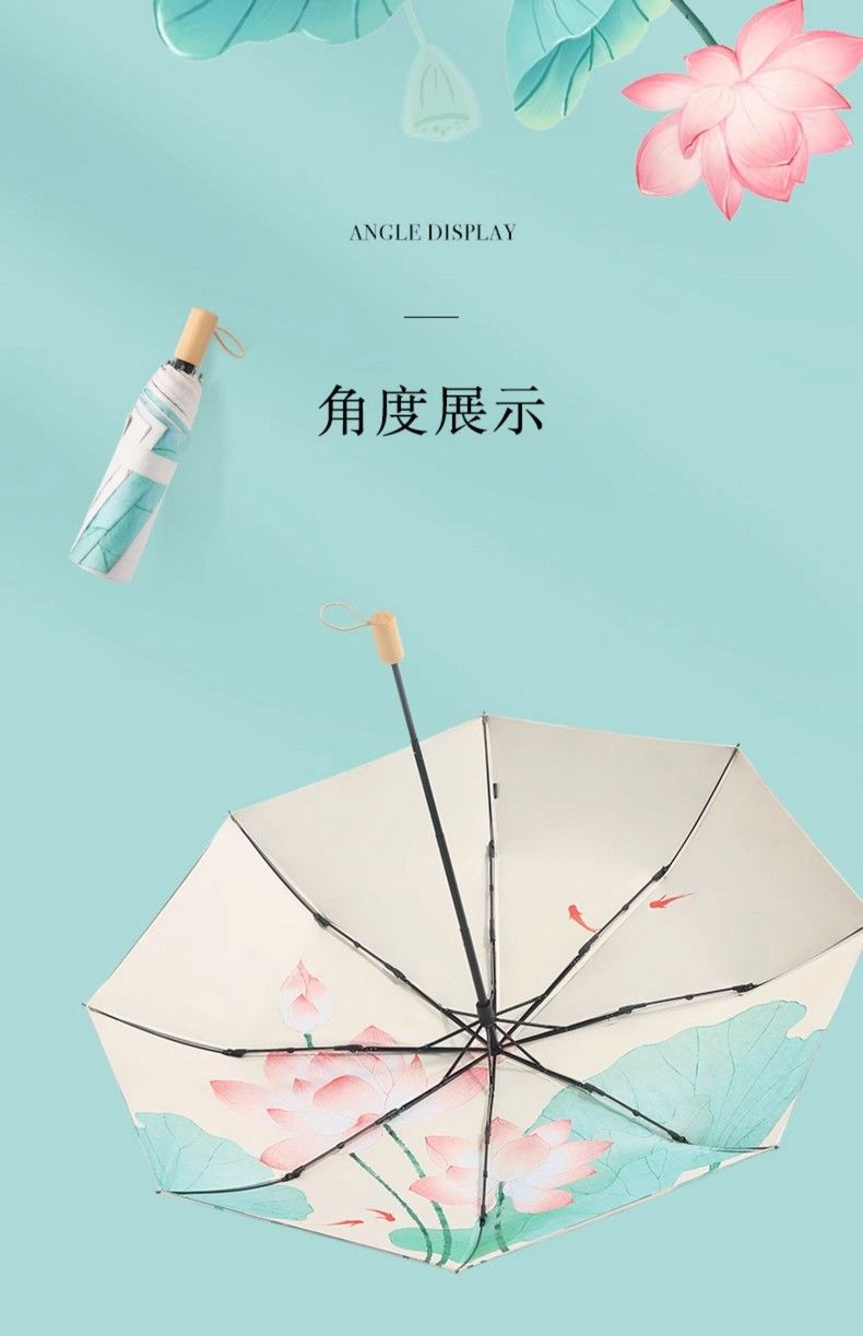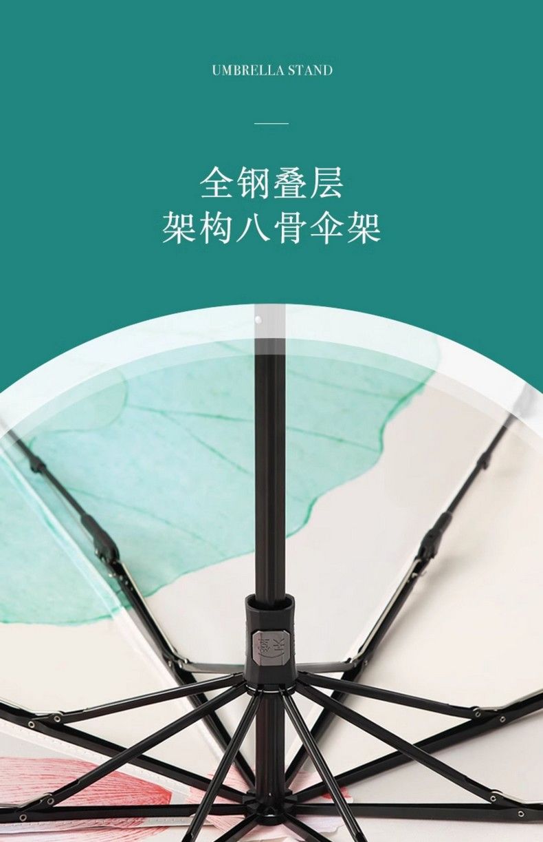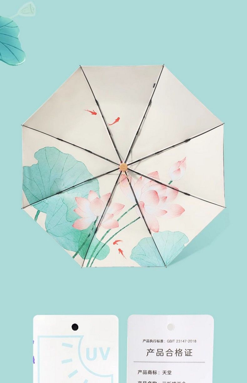 商品名称:天堂伞 双层防晒黑胶太阳伞UPF50+防紫外线晴雨伞三折中国风女士遮阳伞55CM*8K 38043E夏荷