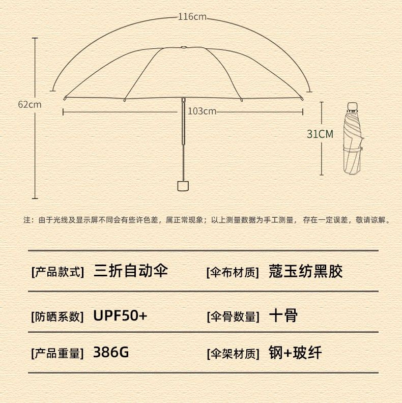 商品名称:天堂伞全自动三折防晒防紫外线遮阳伞双人折叠大伞晴雨两用伞男女31171E风雅三折自开收晴雨伞