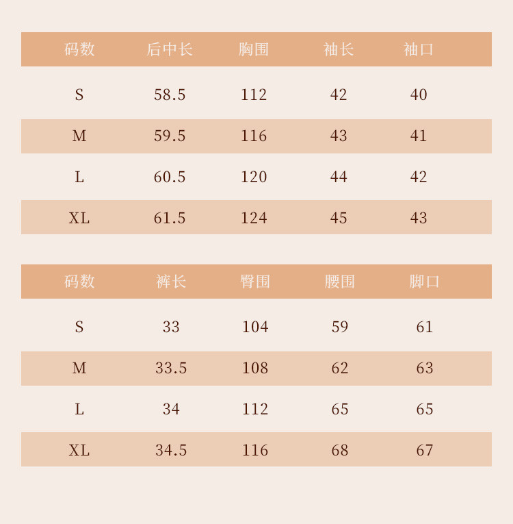 | 尺码 | 袖长(cm) | 上装号型 | 下装号型 | 衣长(cm) | 腰围(cm) | 裤长(cm) | 臀围(cm) | 胸围(cm) | 号型 |