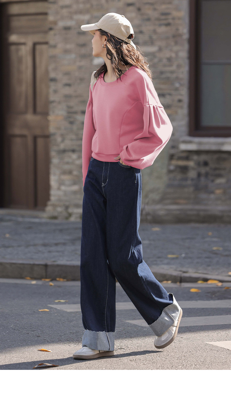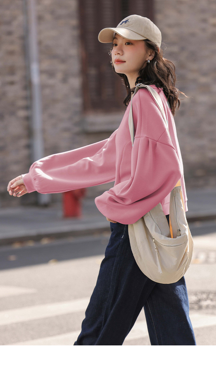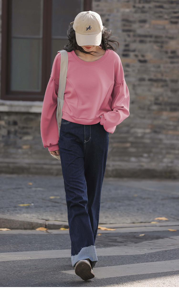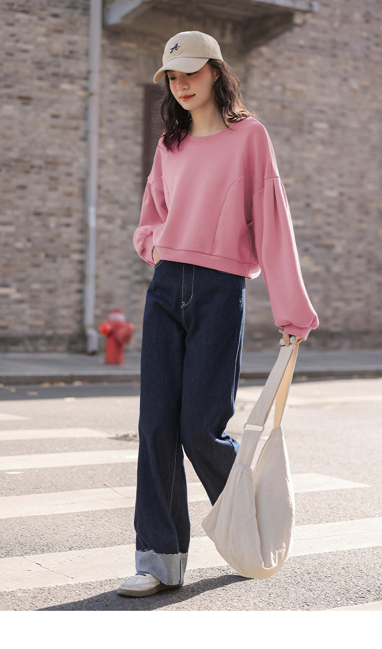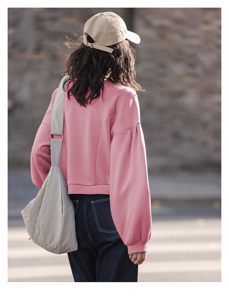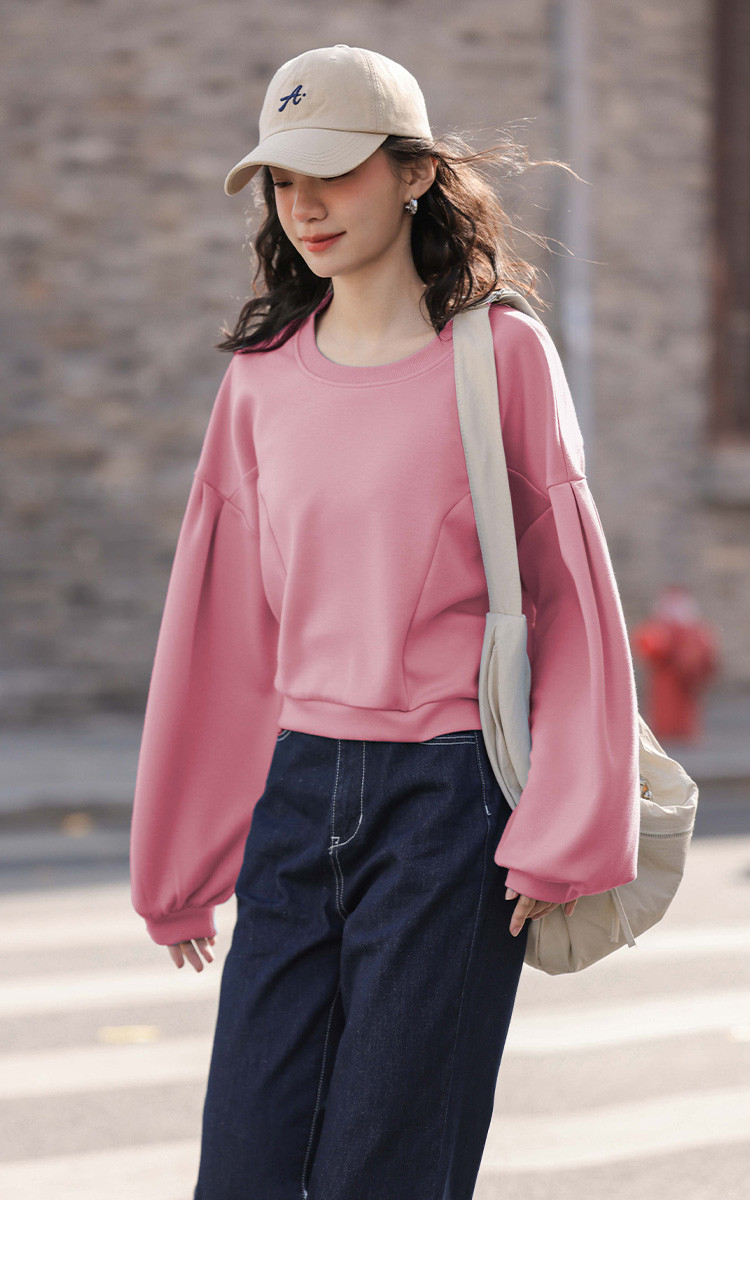 【玫粉短款泡泡袖】秋圆领落肩泡泡袖加大身分割设计卫衣 266754