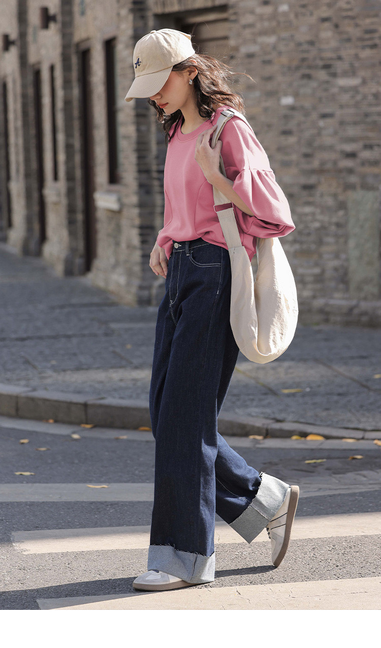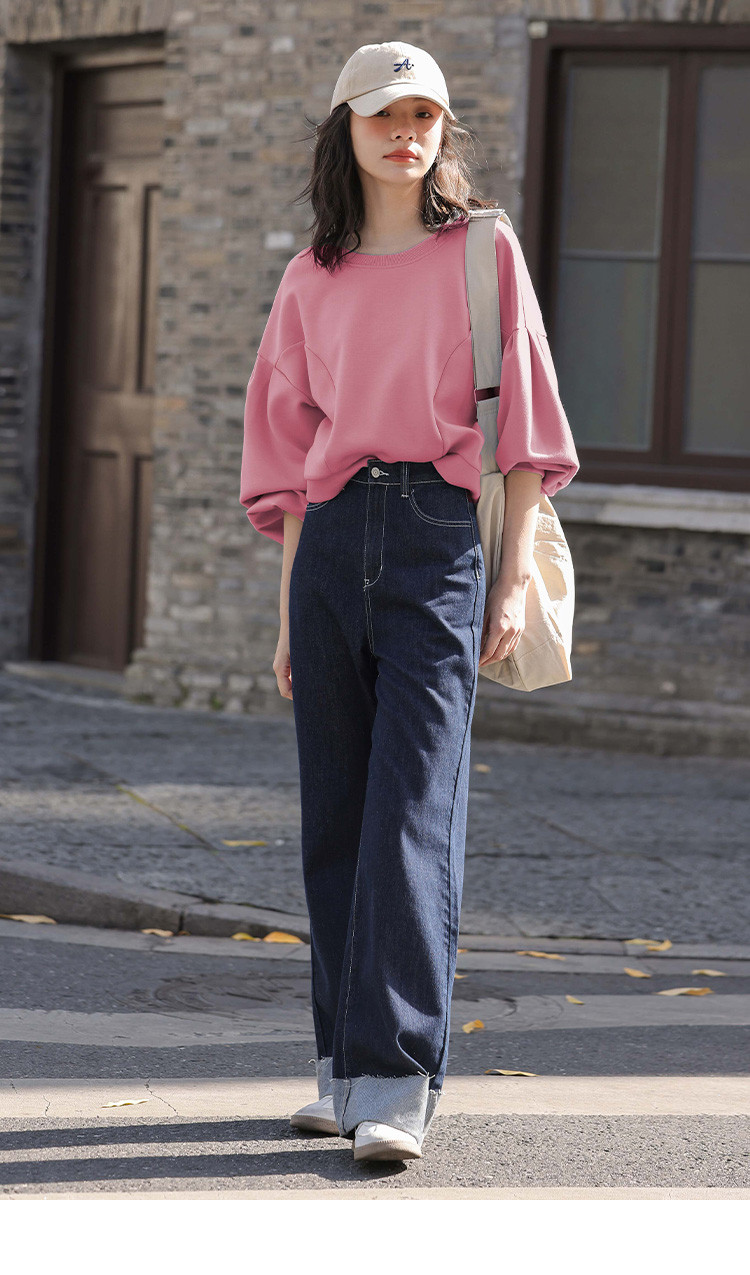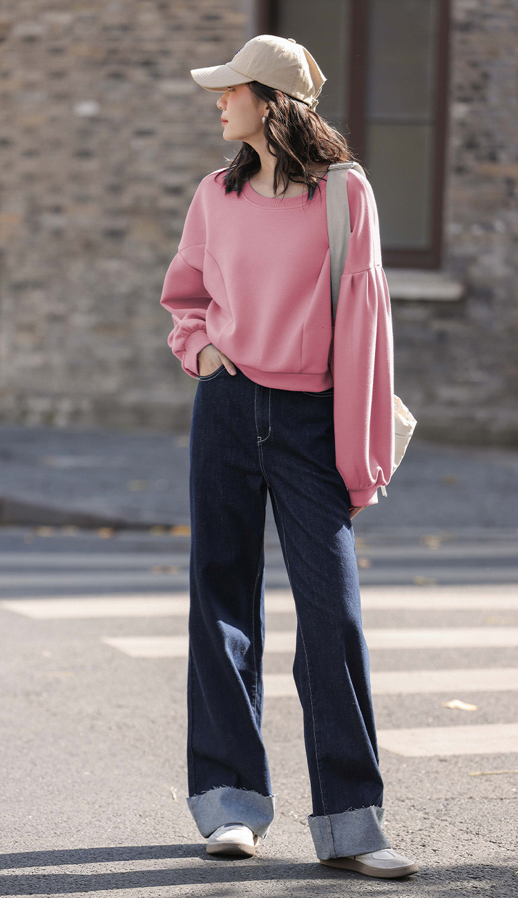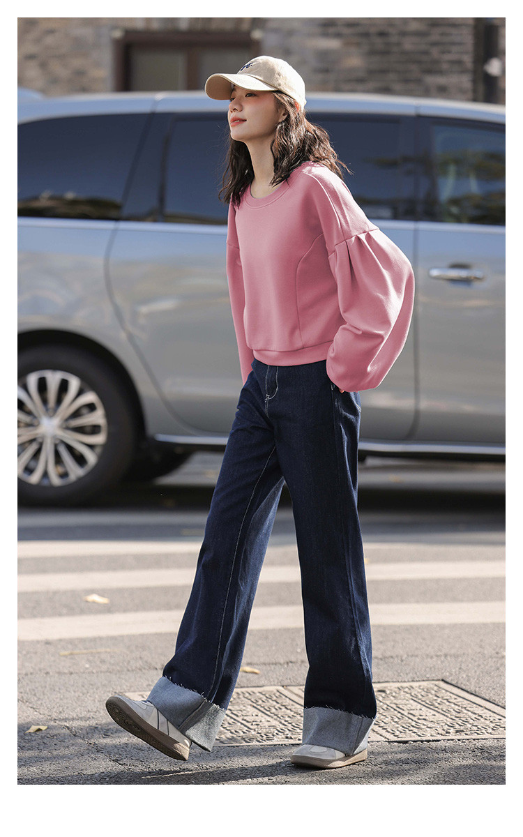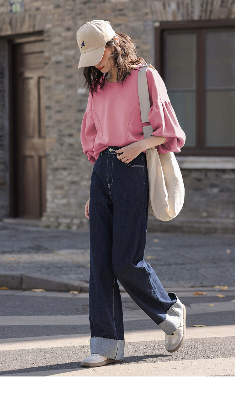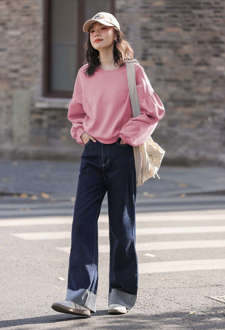 【玫粉短款泡泡袖】秋圆领落肩泡泡袖加大身分割设计卫衣 266754