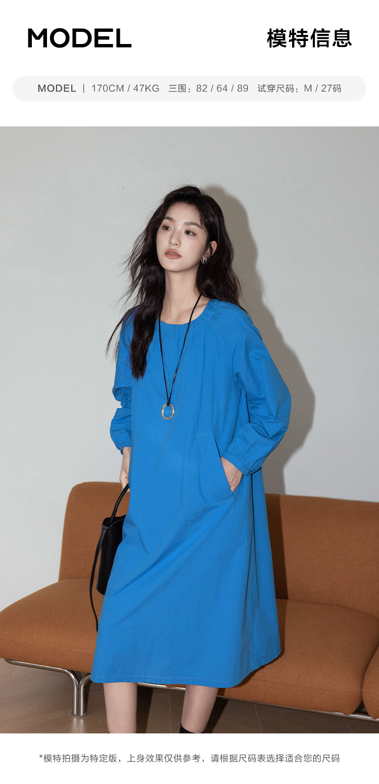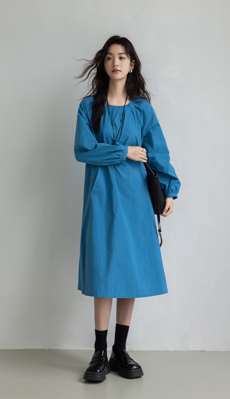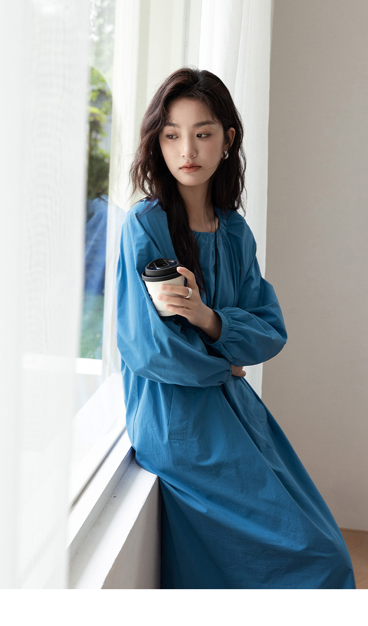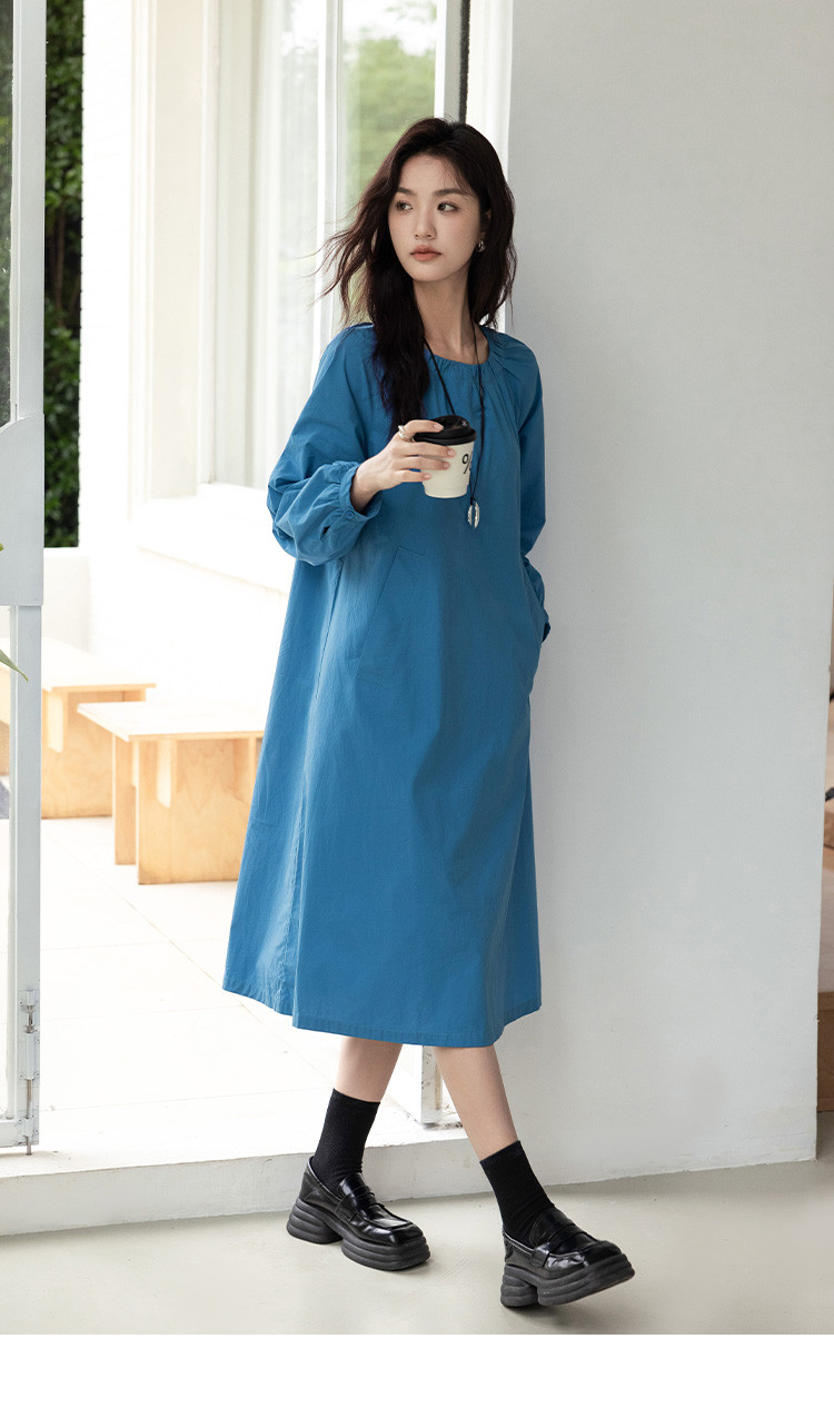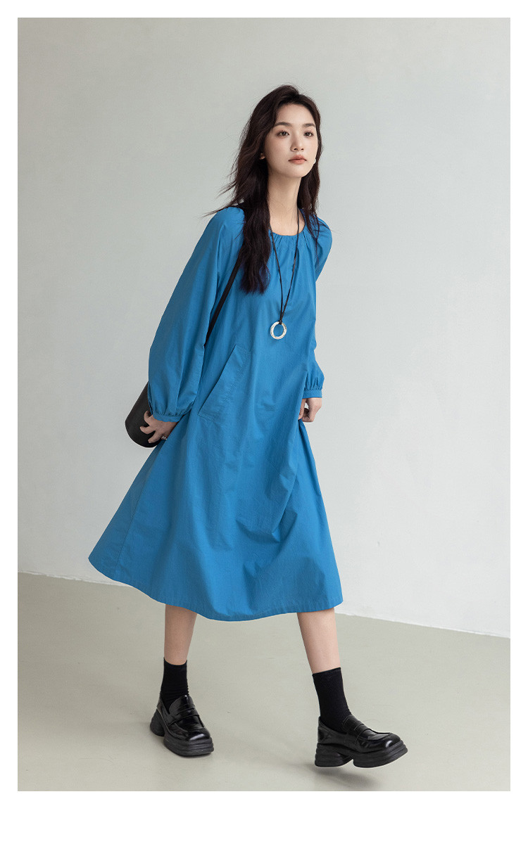 商品名称:【简约治愈蓝长裙】秋圆领套头领口抽褶长袖中长款连衣裙 423426