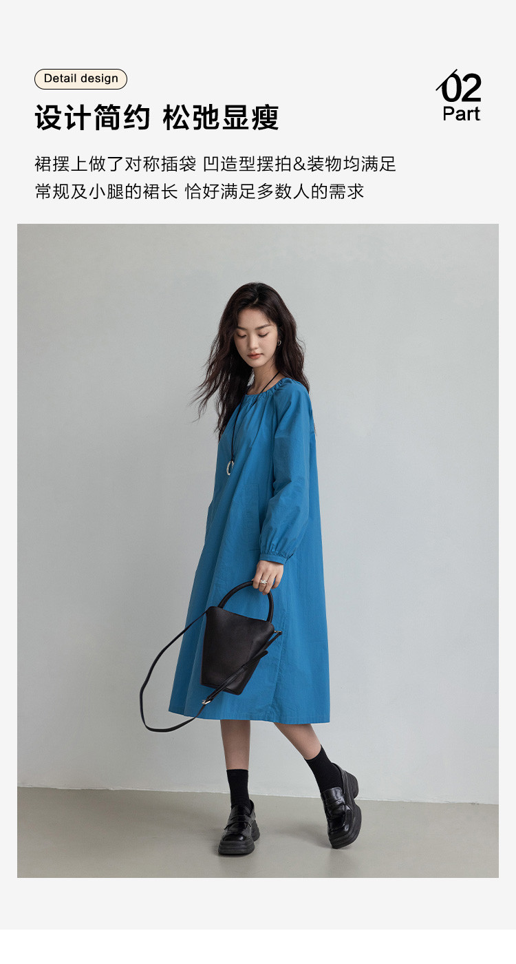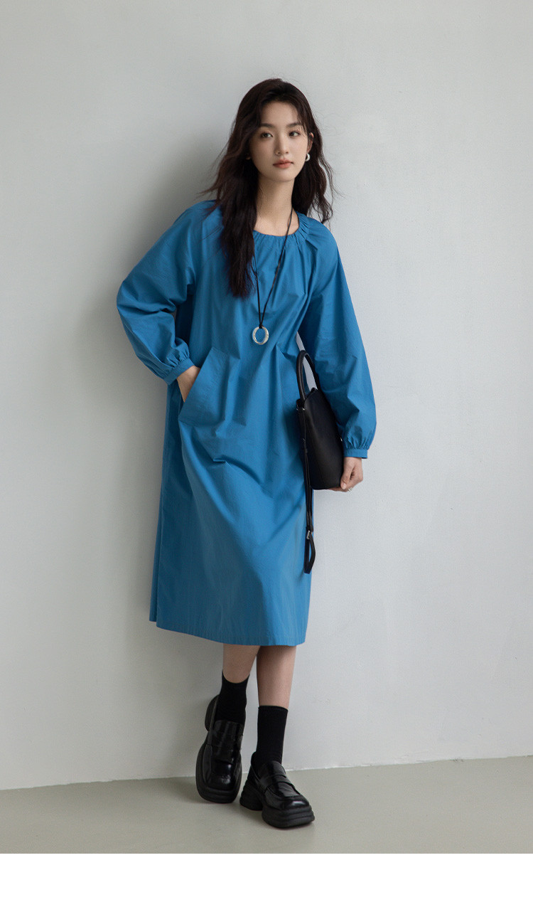【简约治愈蓝长裙】秋圆领套头领口抽褶长袖中长款连衣裙 423426