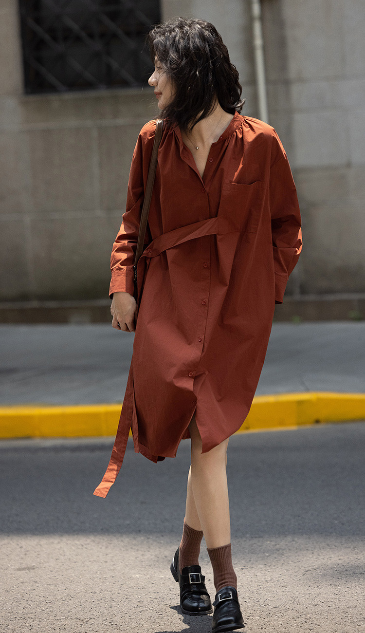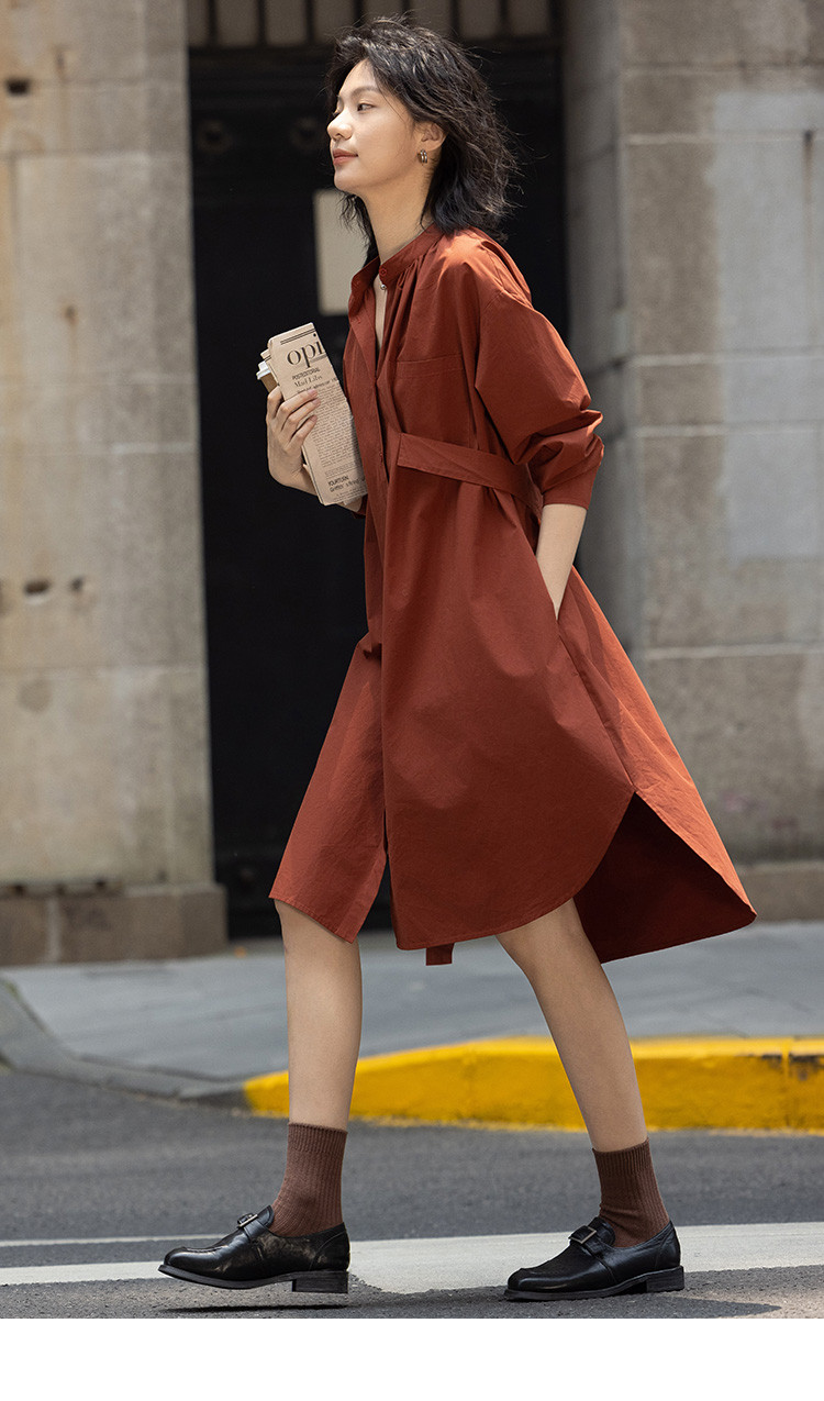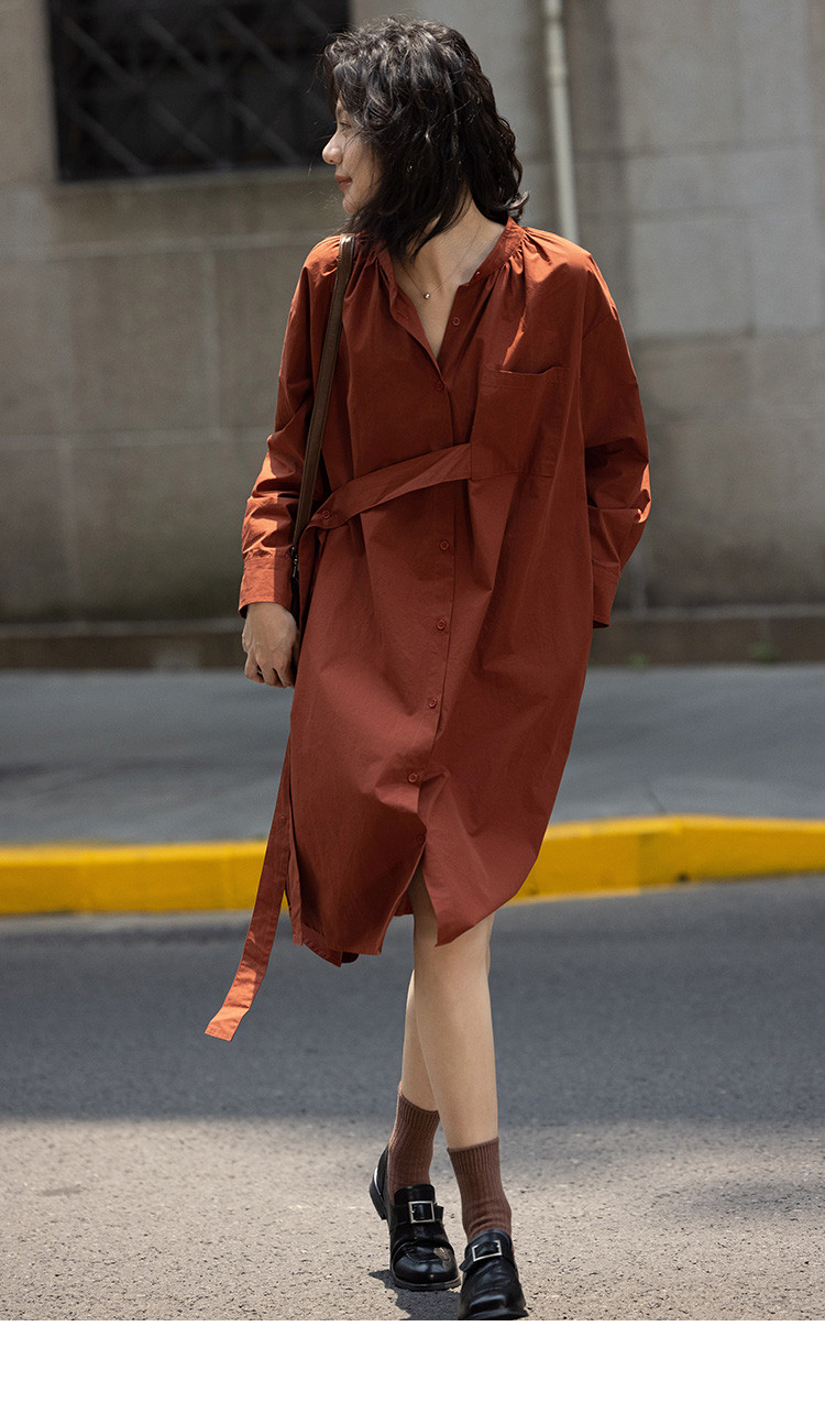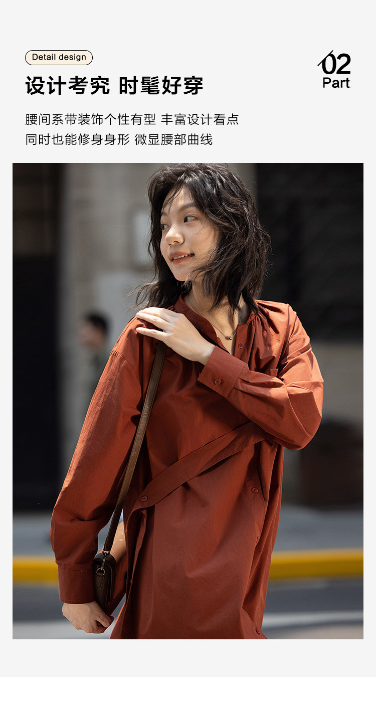 商品名称:【复古红衬衫裙】秋腰间系带小众设计感松弛显瘦连衣裙 460290