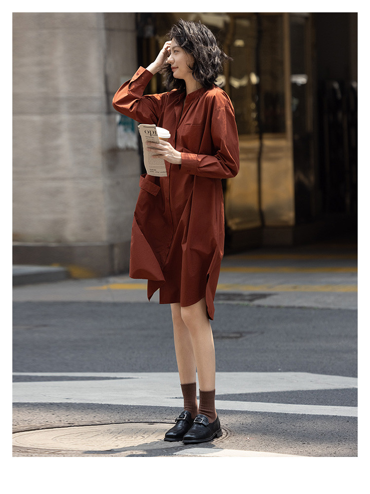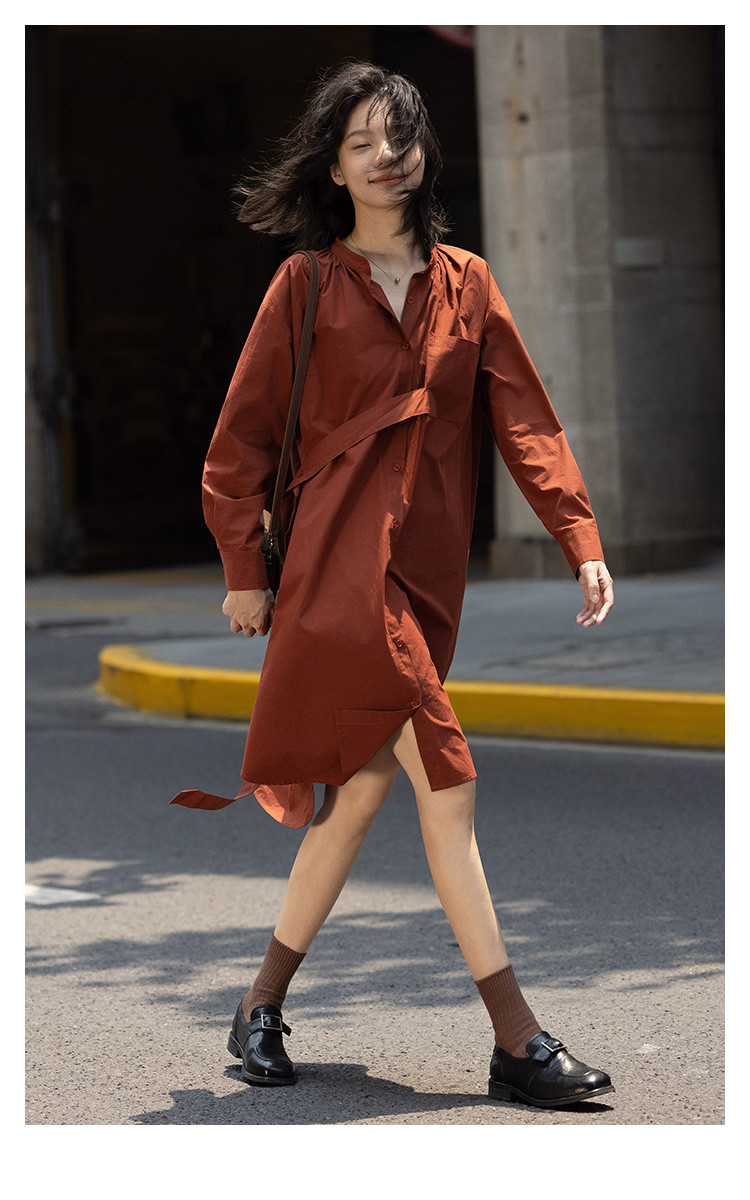 【复古红衬衫裙】秋腰间系带小众设计感松弛显瘦连衣裙 460290