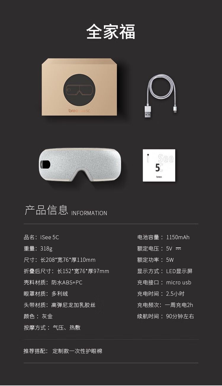 商品名称:倍轻松(Breo)眼部按摩器iSee5C热敷疲劳眼部眼保仪护眼仪眼睛按摩仪 灰色