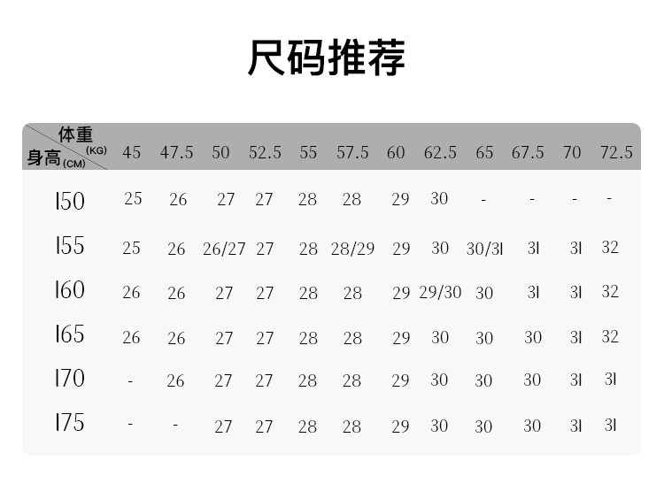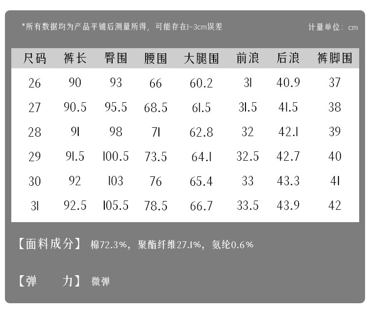 | 尺码 | 大腿围(cm) | 裤脚围(cm) | 前浪(cm) | 后浪(cm) | 腰围(cm) | 裤长(cm) | 膝围(cm) | 臀围(cm) | 号型 |
