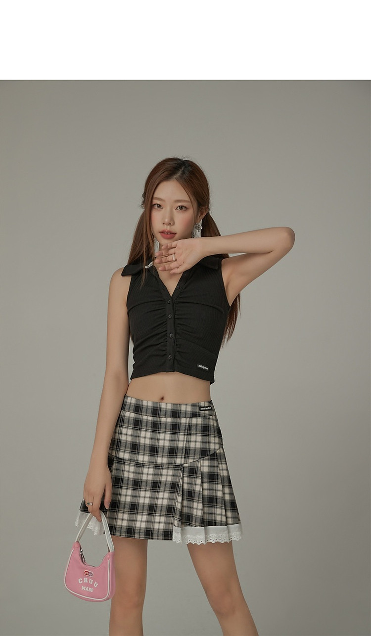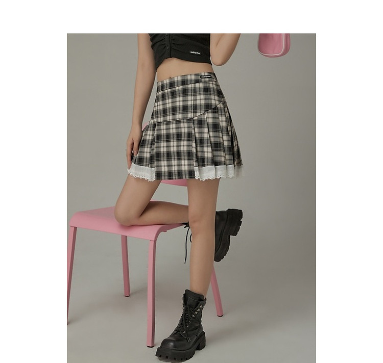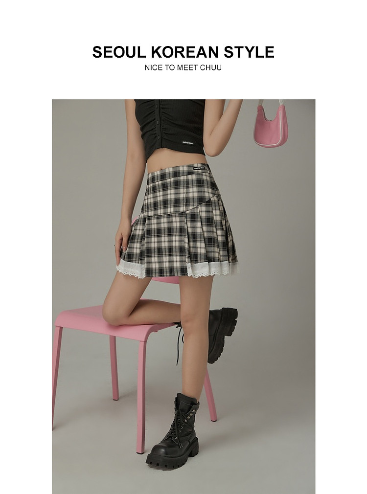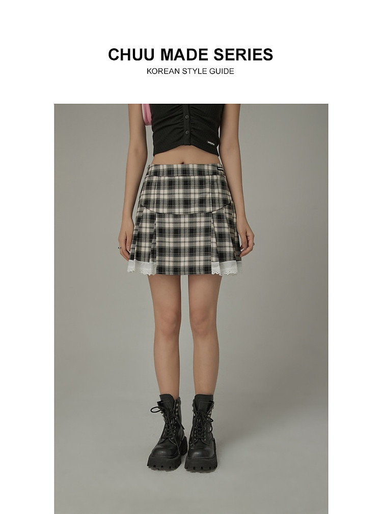 CHUU格子半身裙女秋蕾丝边百褶a字公主短裙薄 981651